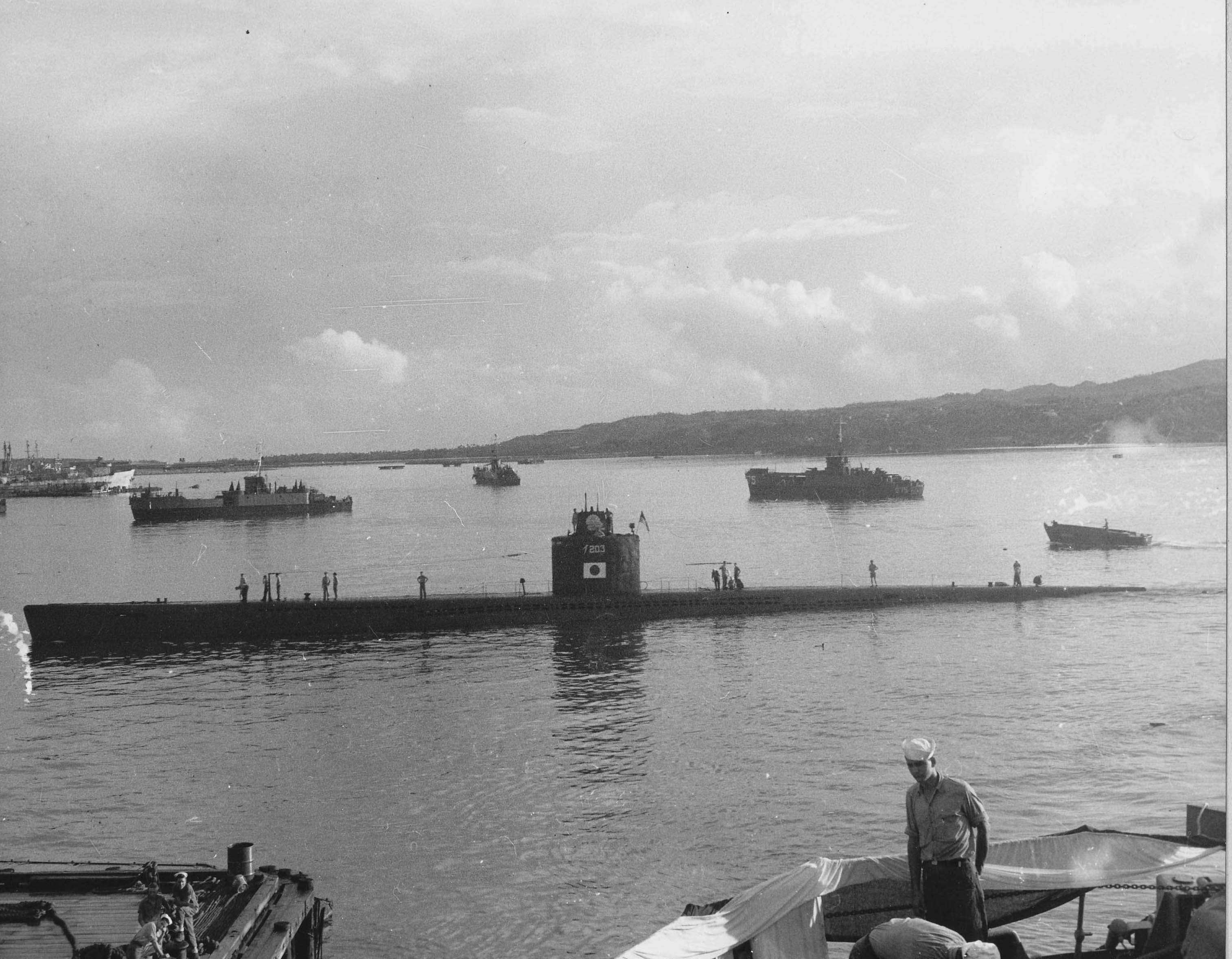 | 610k | I-203 as seen from the Euryale (AS-22), 31 January 1946. The Alcyone (AKA-7) is alongside the submarine. |
