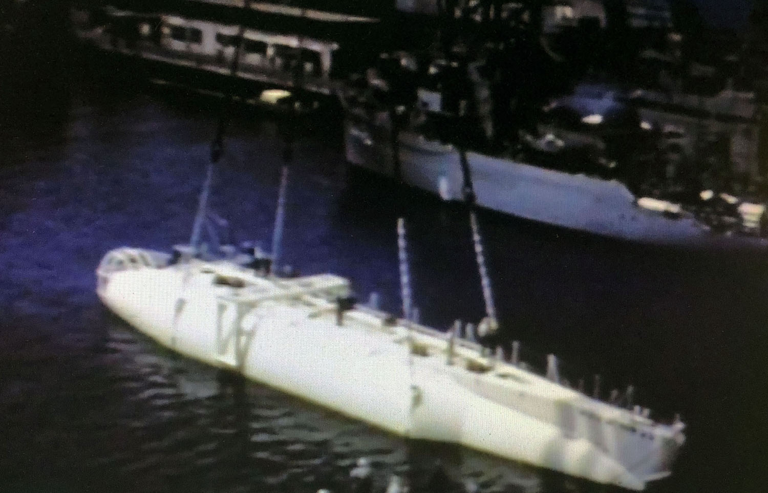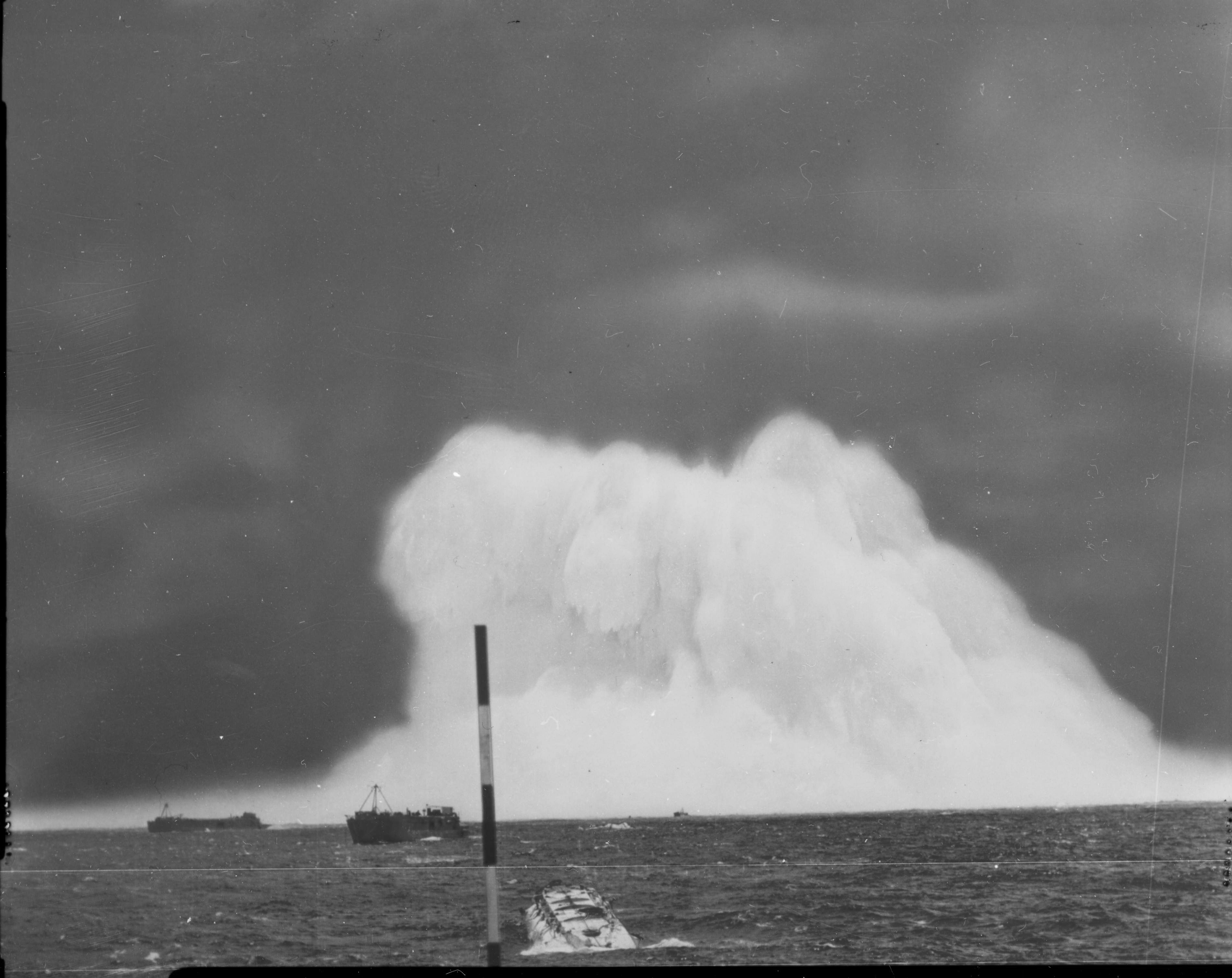 1.35k | Background statement from Operation WIGWAM, Scientific Director's Summary Report" "Operation WIGWAM was the code name of the first deep underwater nuclear explosion in history. These faux submarines, base on the Tang (SS-563) submarine design, were used as test targets as part of Operation Wigwam. The test target submarines (one of which appears closest to the camera on the right) were referred to as SQUAWS, & were constructed at Long Beach Naval Shipyard under the contract with the US Navy. |