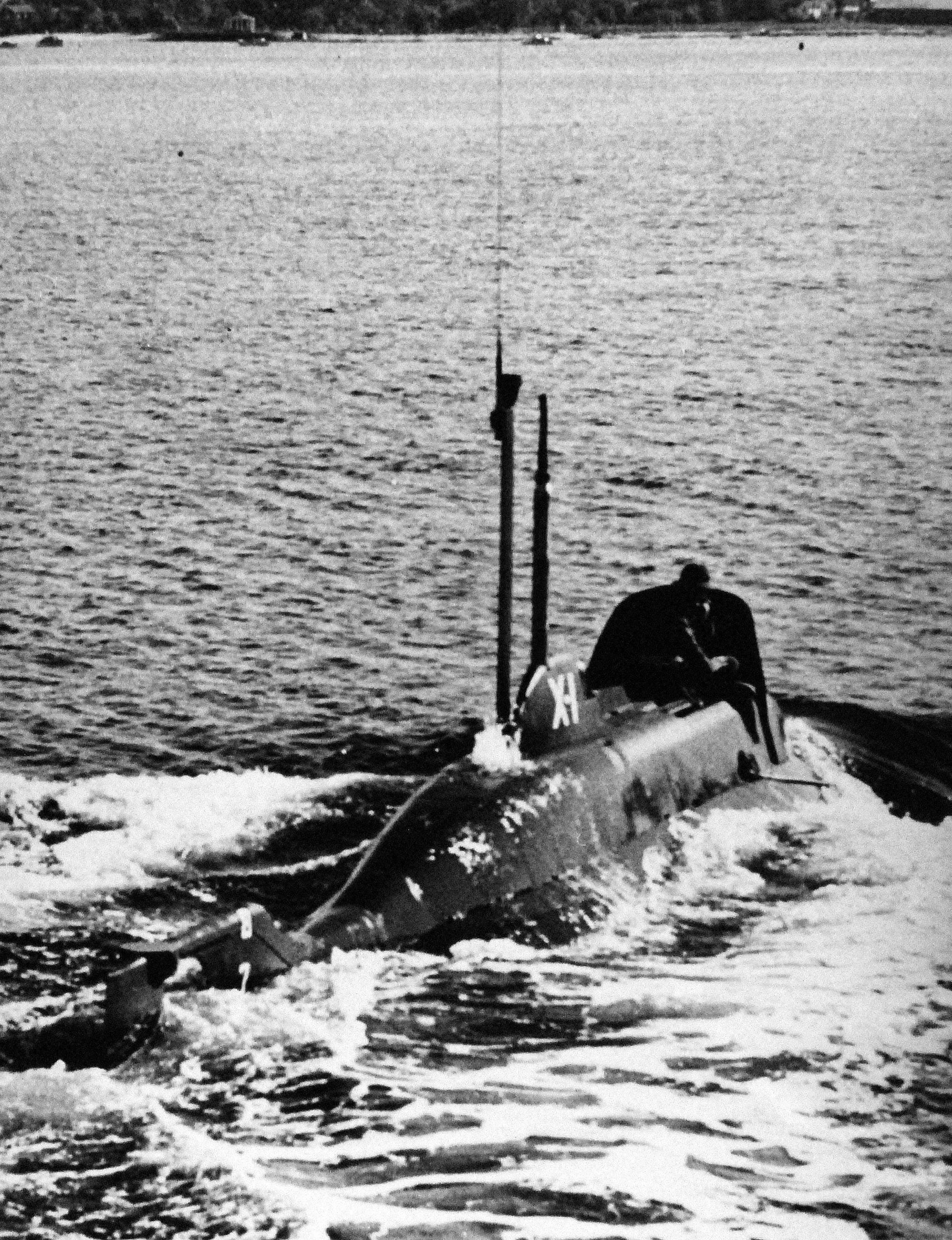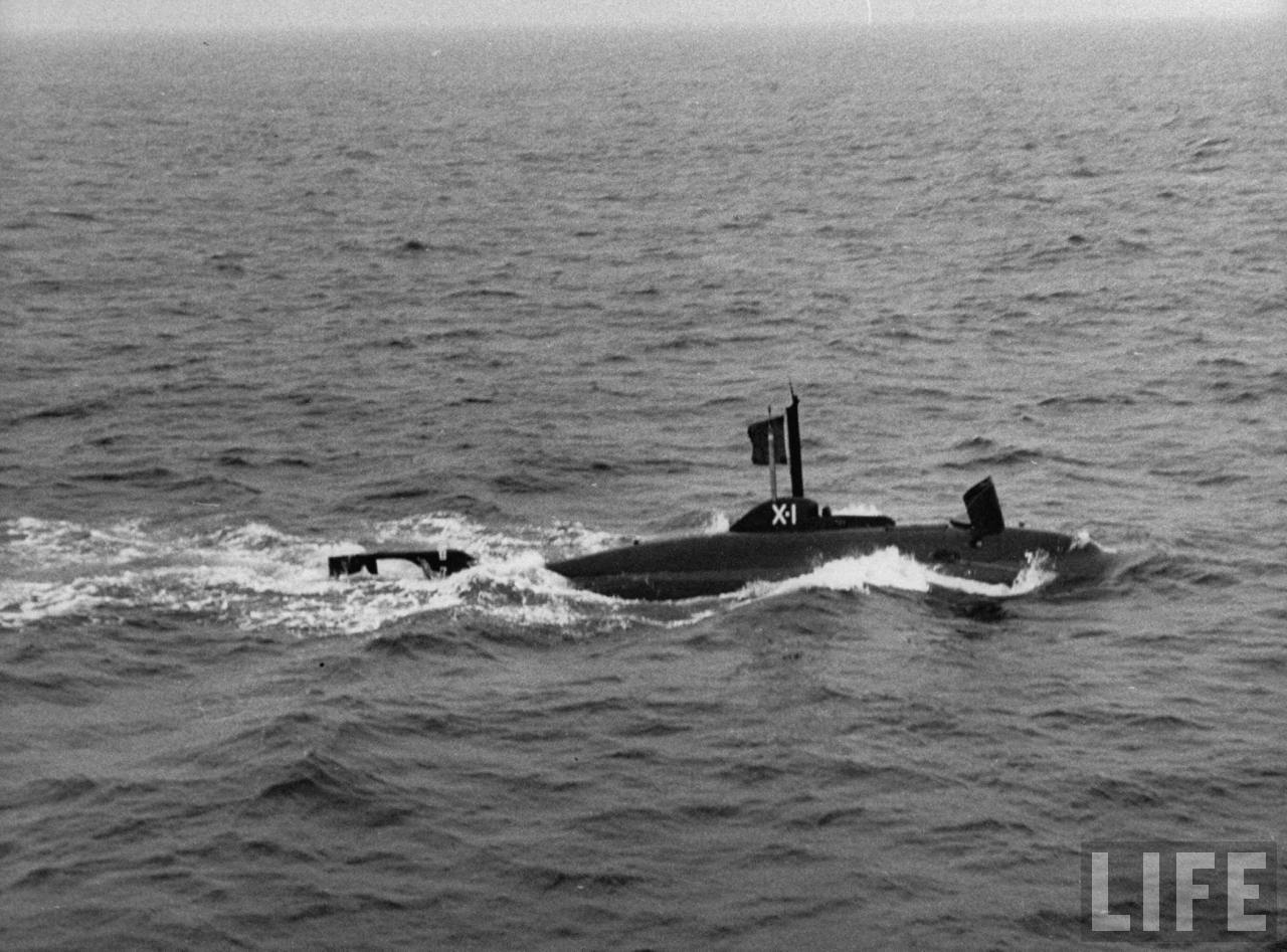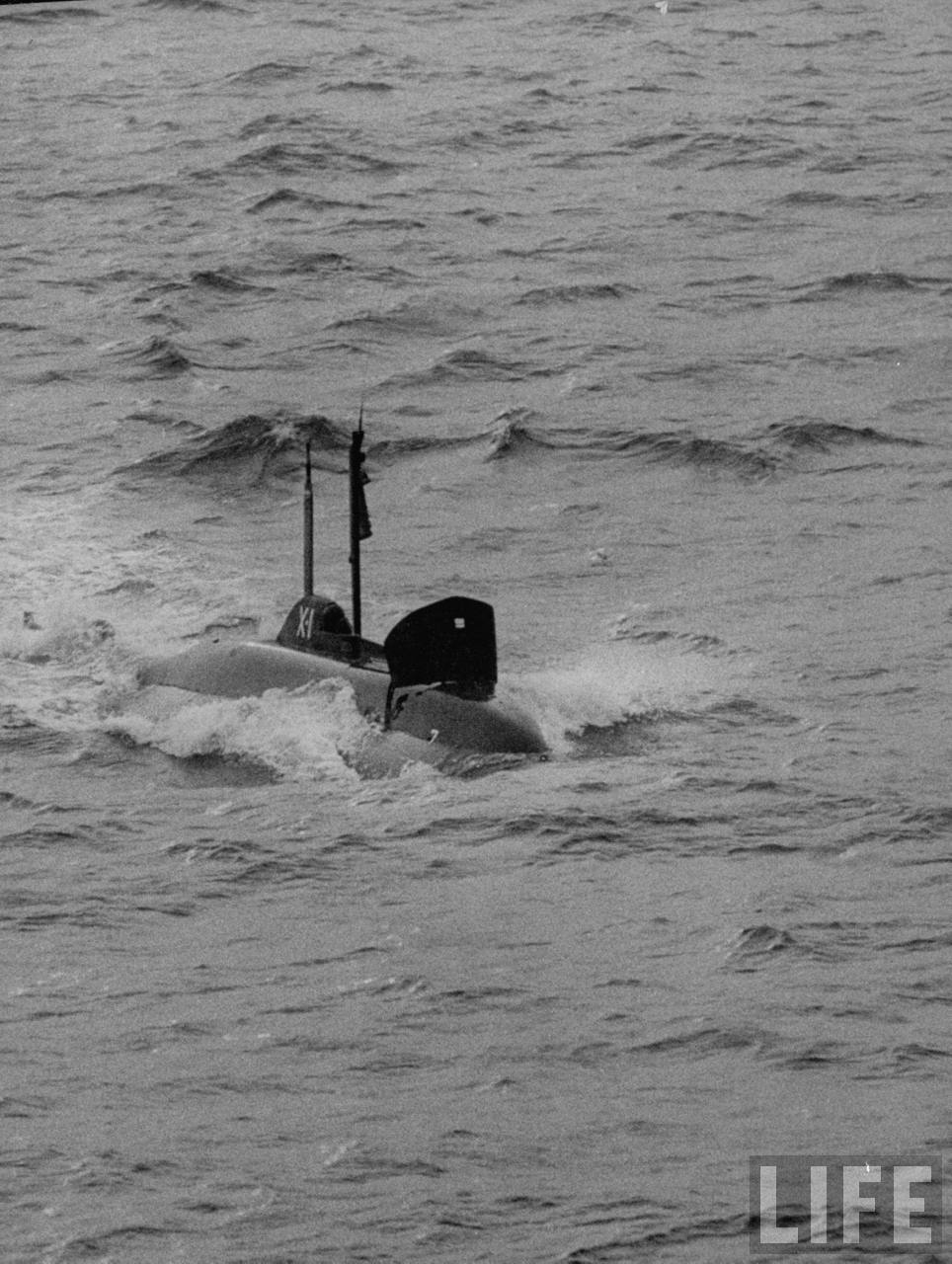 177k | Midget submarine X-1, cruising on surface, October 1955. | Photographer: Grey Villet, courtesy of life.time. | |