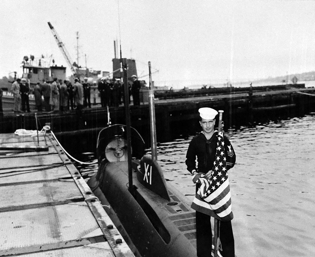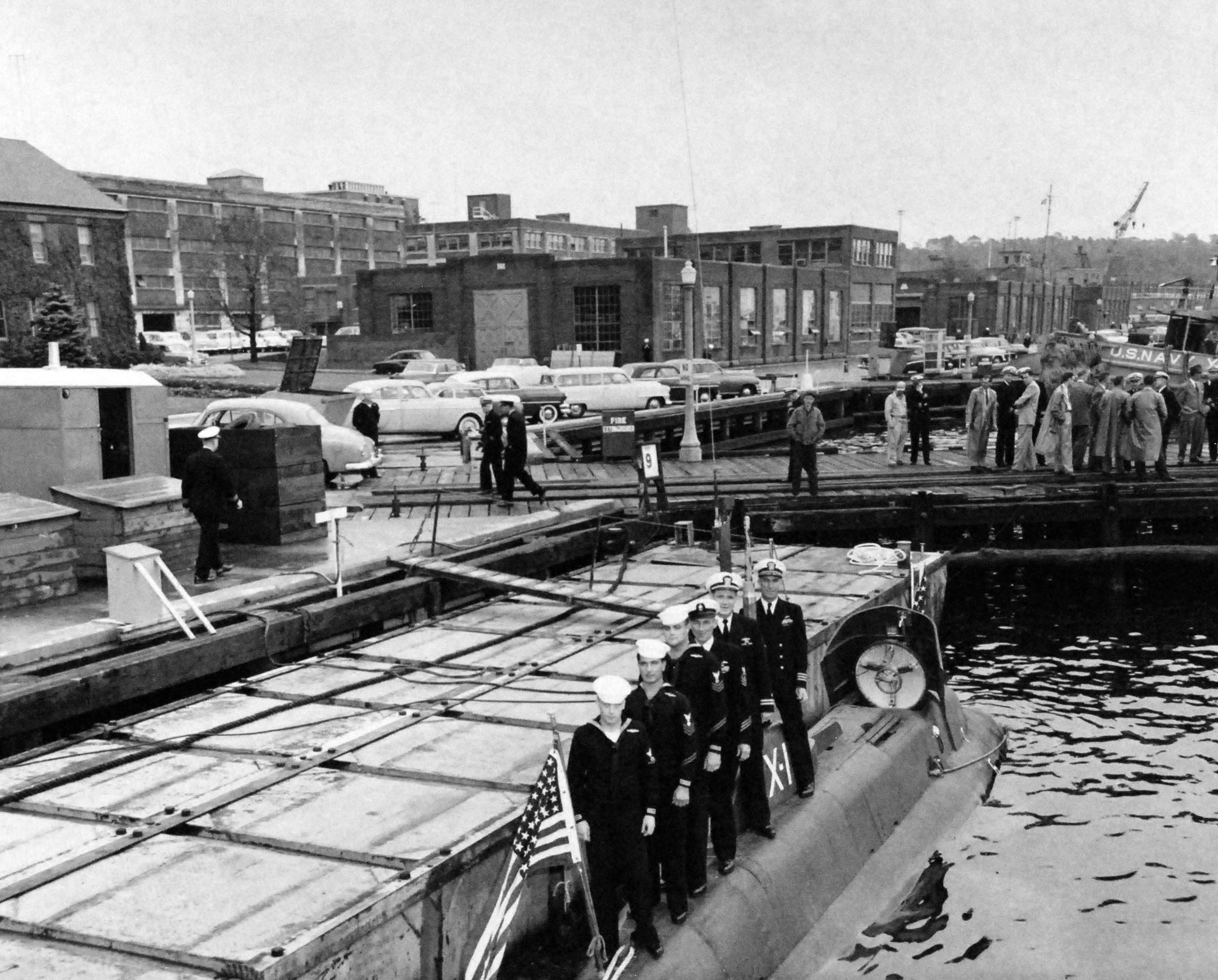 525k | Crew of X-1, 7 October 1955, at New London, Groton, Connecticut. | Photo # 80-G-683343 courtesy of the National Museum of the U.S. Navy, via flickr.com. | |