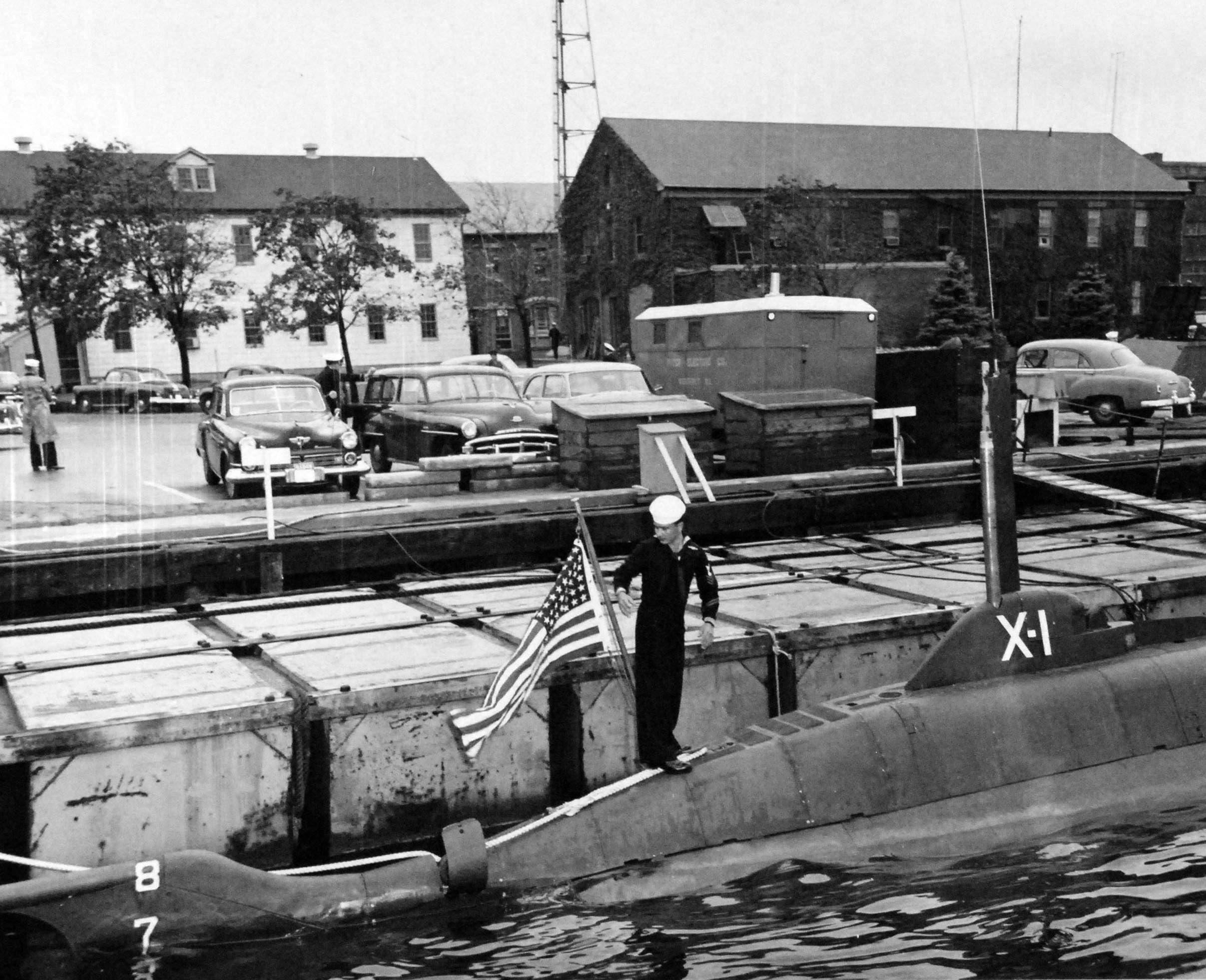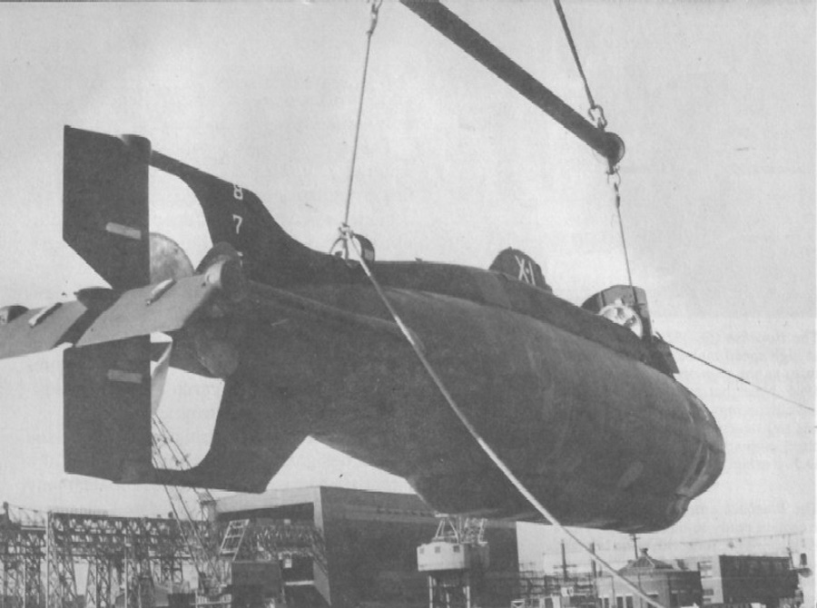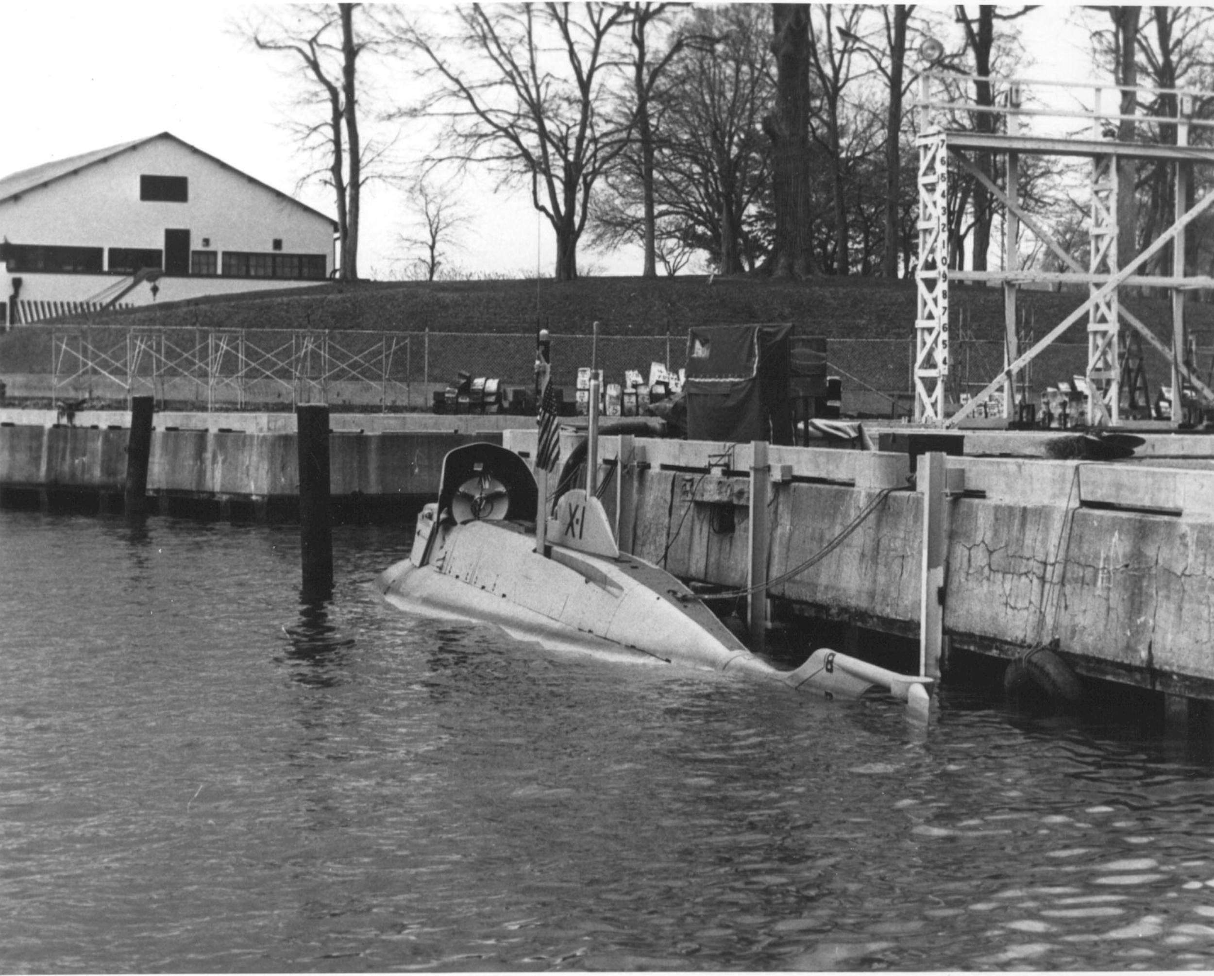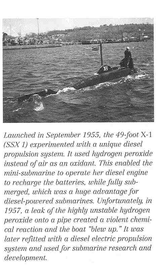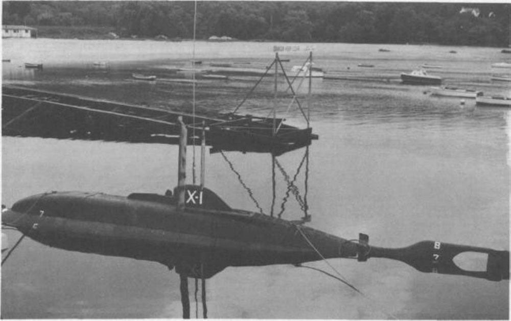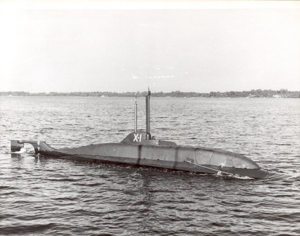 1.47k | X-1, commanded by Lieutenant Kevin Hanlon, USN, undergoes test. In addition to the officer-in-charge, the X-1 has an enlisted crew of four men. The craft is based at U.S. Submarine Base, New London, Connecticut. The X-1, the Navy's first midget submarine, was built to assist in testing the harbor defense installations of our coastal ports. The 25-ton, 50-foot submersible craft was recently completed by the Engine Division of the Fairchild Engine and Airplane Corporation, Farmingdale, New York. She was launched at Oyster Bay, September 7, 1955, being the first naval vessel of any kind designed and constructed by a U.S. Aircraft Manufacturer. The X-1 was "in service" rather than in commission. Photograph released 14 November 1955. | Photo # USN 682142 courtesy of the National Museum of the U.S. Navy, via flickr.com. | |