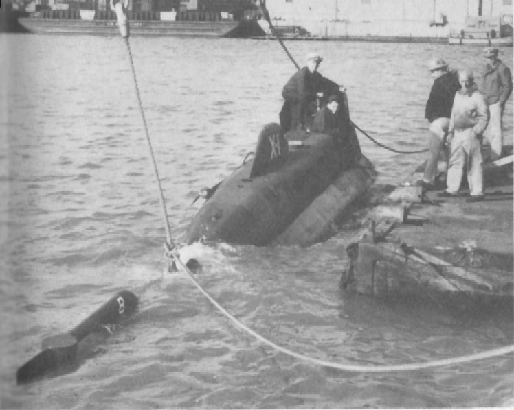 132k | X-1 being lifted by crane into the water. | USN photo taken from The American Submarine, by Norman Polmar & submitted by Robert Hurst. | |