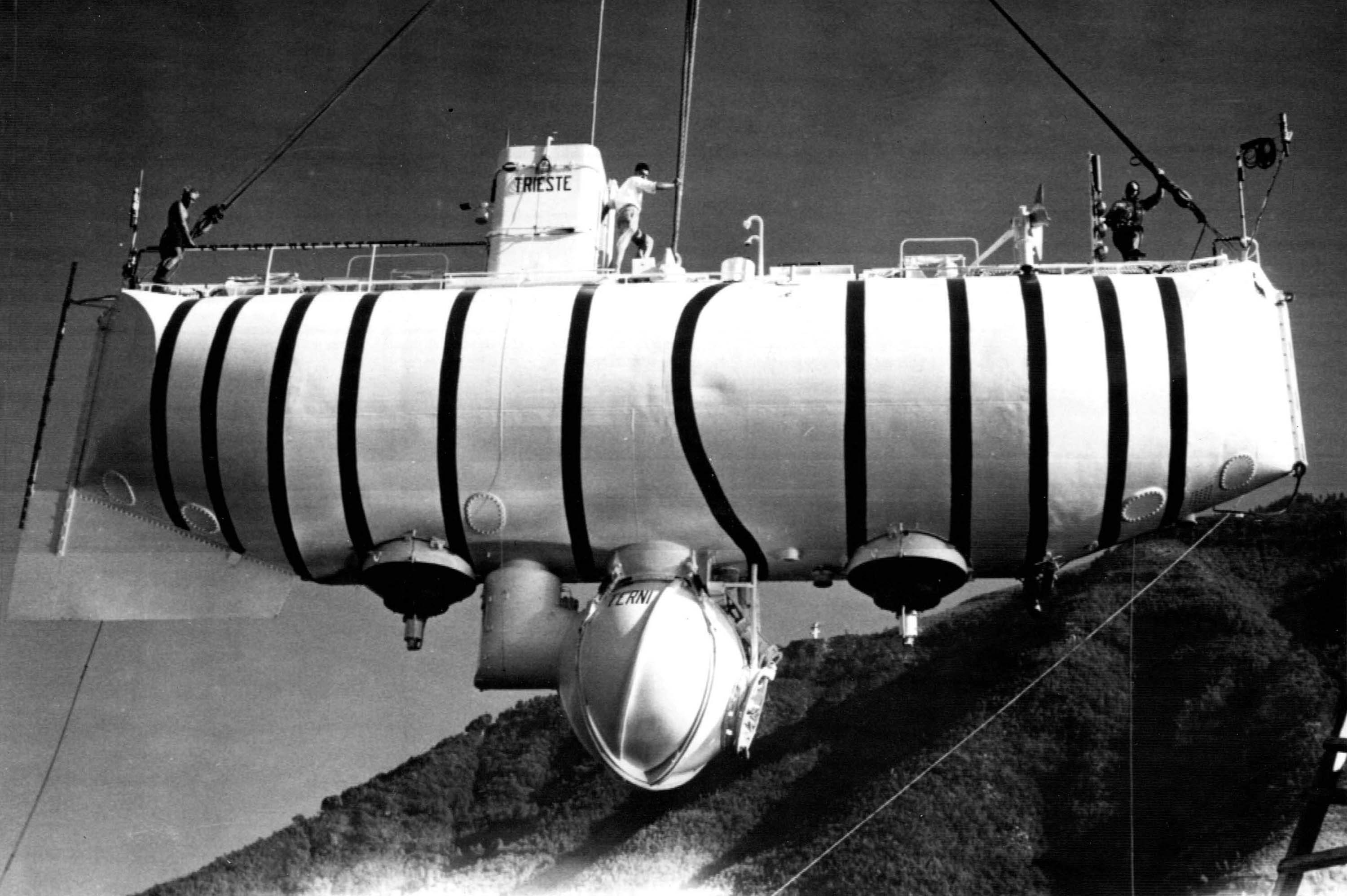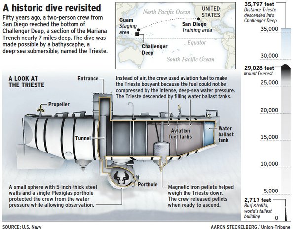 74k | The U.S. Navy's bathyscaphe Trieste is seen slung on cables out of the water in March 1959 in San Diego. Fifty years ago, two men in an odd-looking vessel out of San Diego ventured to a place no human had gone before — a site as remote and dangerous as a lunar landscape. There was no air, and the atmospheric pressures were crushing — up to 8 tons per square inch, strong enough to bend steel. On 23 January 1960, Don Walsh and Jacques Piccard became the first people to reach the bottom of Challenger Deep in the Mariana Trench. This spot, 35,797 feet below the surface, is the deepest surveyed point of Earth's oceans. "These guys were pioneers in the truest sense," said Kevin Hardy, vice president at Deep sea Power & Light, a submersible-technology company in Kearny Mesa. "Step by step, they pushed back the frontier and helped open up a new world. San Diego should be as proud of this as of building (Charles) Lindbergh's Spirit of St. Louis." On this January 23, Walsh and other participants in the historic dive of the Trieste bathyscaph will gather at the Town and Country Resort in Mission Valley to commemorate their achievement. "It was like putting a man on the moon," said David Sandwell, a geophysicist at the Scripps Institution of Oceanography in La Jolla, part of the University of California San Diego. He helped develop the first detailed maps of the global seafloor in the 1990s. There is one notable difference: A dozen astronauts, all from the Apollo program, walked on the moon. Walsh and Piccard remain the only humans to have delved so deeply into the Mariana Trench, an undersea subduction zone where tectonic plates collide and plunge back into Earth's molten mantle. Only two unmanned attempts have successfully replicated the feat: a Japanese robotic probe called Kaiko in 1995 and a remotely operated American vehicle named Nereus last year. The Trieste was the creation of Auguste Piccard, a Swiss physicist who invented a pressurized aluminum gondola that set a balloon altitude record of 51,775 feet in 1931. He then shifted his attention downward, realizing that his gondola might also take humans into the depths of the sea. His first bathyscaph — a word Piccard coined from the Greek "baths," meaning deep, and "scaphe," meaning ship — was built and sold to the French navy. Piccard used the proceeds to construct and launch the Trieste in 1953. The vessel was named after the Italian city where much of it was built. By today's standards, the Trieste technologies were relatively crude. Two people occupied a 6½-foot steel sphere that was attached underneath a 50-foot-long steel float filled, in part, with 28,000 gallons of buoyant aviation fuel. To descend, the crew flooded air-filled ballast tanks. To ascend, internal hoppers released tons of iron pellets. A cash-strapped Piccard sold the Trieste to the U.S. Office of Naval Research in 1958 for $250,000. The Navy was looking for a vehicle capable of deep-sea ventures. It had the bathyscaph shipped to San Diego for testing and modifications over the next year and a half. In 1959, Walsh, a 27-year-old submarine lieutenant, volunteered to become the Trieste's first officer in charge. It got him out of shore duty, though later he said no one had told him about the Challenger Deep plans. "The subs I had worked operated at maximum depths of 300, 400 feet," he said. "But I wasn't concerned. It just made me more curious." The project was headed by Scripps graduate and deep-sea pioneer Andreas Rechnitzer of the Naval Electronics Laboratory on Point Loma. Jacques Piccard, the son of Auguste, served as a consultant. Their goal was simple: Prove that humans could safely explore the ocean's depths. The Trieste's descent 23 January 1960, was largely uneventful. The dive began at 8 a.m. in rough seas, but once beneath the waves, the craft plunged smoothly and steadily at a rate of about 180 feet per minute. It took nearly five hours to reach the sea bottom — nearly seven miles down. Walsh recalls the downward trip as being relatively boring. He and Piccard, who died in 2008, monitored a handful of instruments, looked for leaks and watched passing bioluminescent creatures from the sphere's single porthole. The only moment of excitement happened at 31,000 feet, when the crew heard a loud bang. "Since our instruments indicated no problems and we were still alive, Jacques and I decided to proceed," Walsh said. The bang turned out to be a secondary Plexiglas window in the entry tube cracking from changing sea pressures, though it posed no mortal threat. Walsh and Piccard remained on the sea bottom for 20 minutes. They wanted to get back to the surface before darkness, and frankly, there wasn't much to see, Walsh said. The Trieste landing had stirred up a cloud of "diatomaceous ooze" — very fine, light-colored sediment that refused to settle or drift away. "It was like looking into a bowl of milk," Walsh said. The ascent went quicker: three hours, 15 minutes. Word of success spread just as rapidly. For a time, the ungainly Trieste was an international sensation. "Trieste's dive took the blinders off," said retired Navy Capt. Charles MacVean, a San Diegan who commanded the squadron that included the bathyscaph. "We became unfettered from fears of going deep." The Trieste never made another dive as deep, but it did have at least one other notable accomplishment: In 1963, it was used to find wreckage of the Thresher (SSN-593), a Navy submarine lost in 8,400 feet of water off New England. Operating the bathyscaph required its team to design and create virtually every piece of equipment, down to individual bolts. "Almost nothing was off the shelf," said John Michel, who was the Trieste's 26-year-old chief of the boat and the vessel's main machinist and repairman. As a result, the Trieste and its subsequent sister vessel, the Trieste II, produced numerous engineering breakthroughs and developments. Those included the first manipulator arm; the first