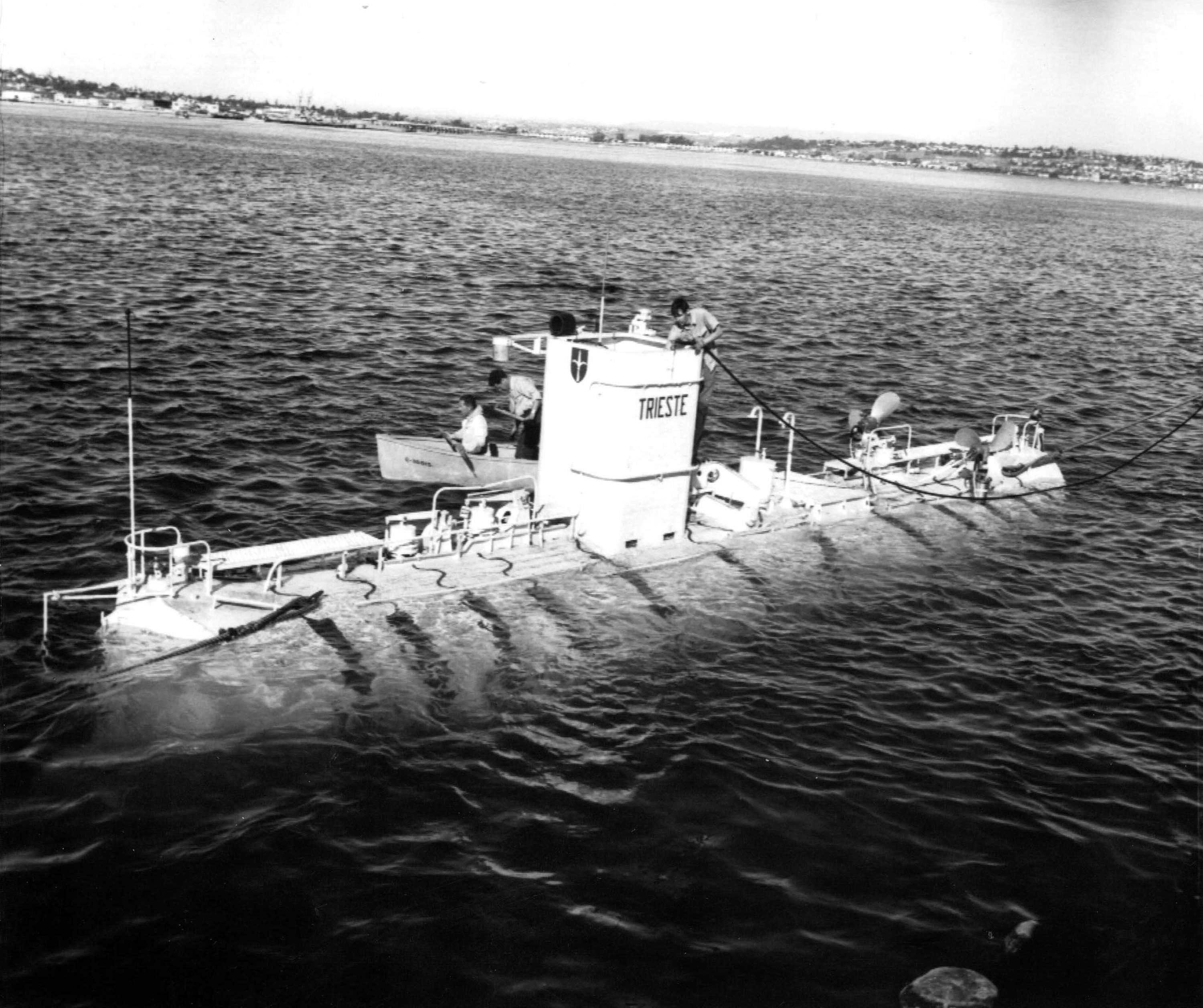 700k | Trieste under tow by the Preserver (ARS-8) in Boston harbor 20 June 1963 standing out to sea to search for the Thresher (SSN-593). | Photo from the files of the Vallejo Naval and Historical Museum via Darryl L. Baker. | |