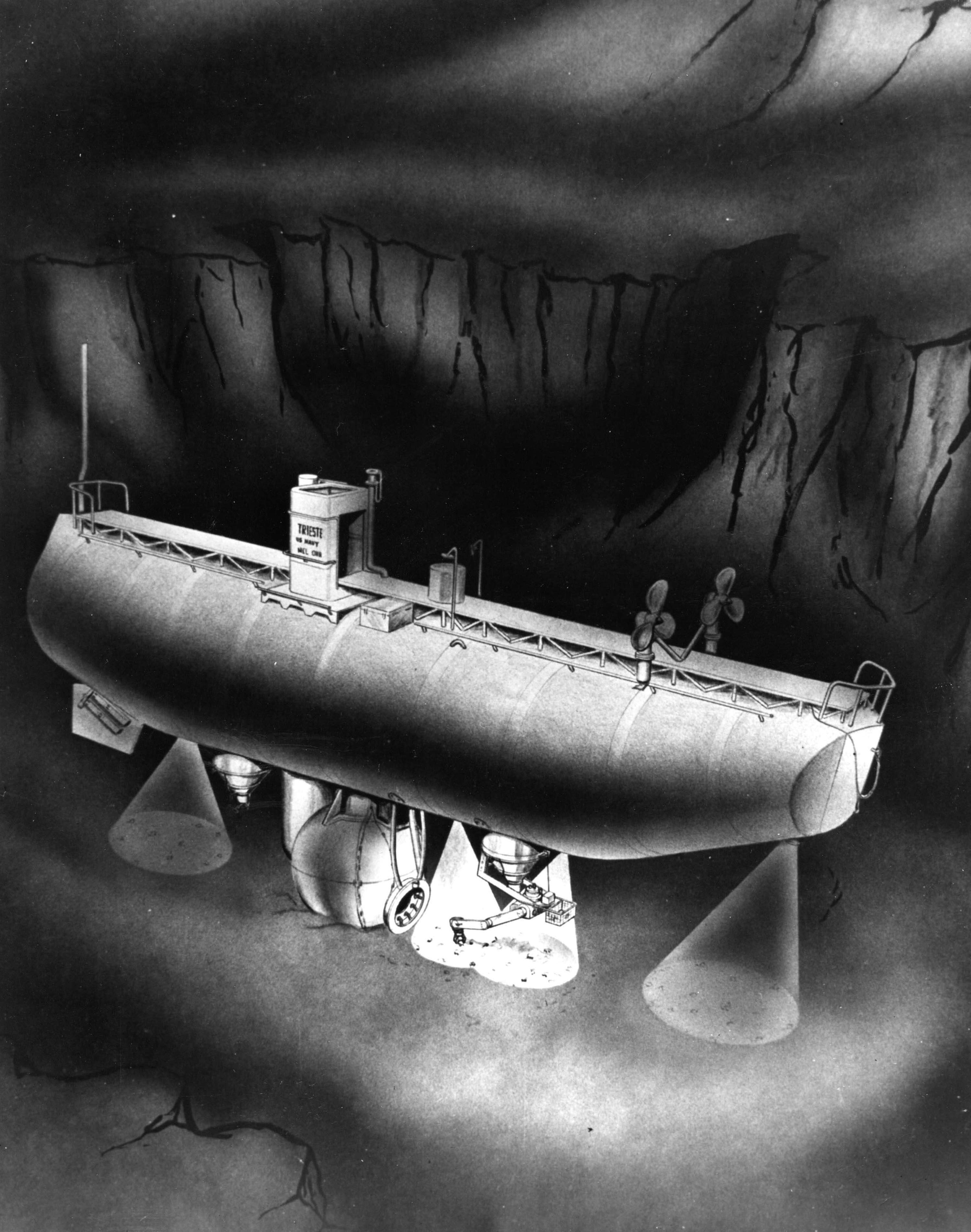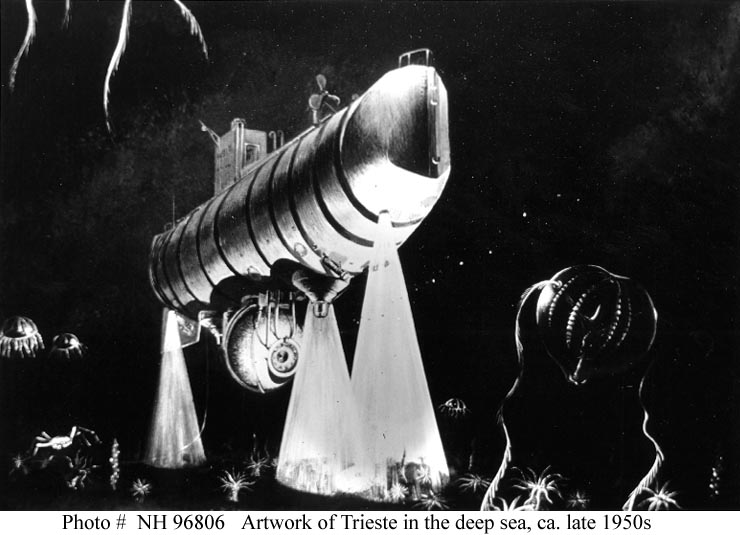 62k | U.S. Navy Bathyscaphe Trieste, a late 1950's artwork, depicting Trieste operating on the deep ocean floor. | USNHC # NH 96806. U.S. Naval Historical Center Photograph. | |