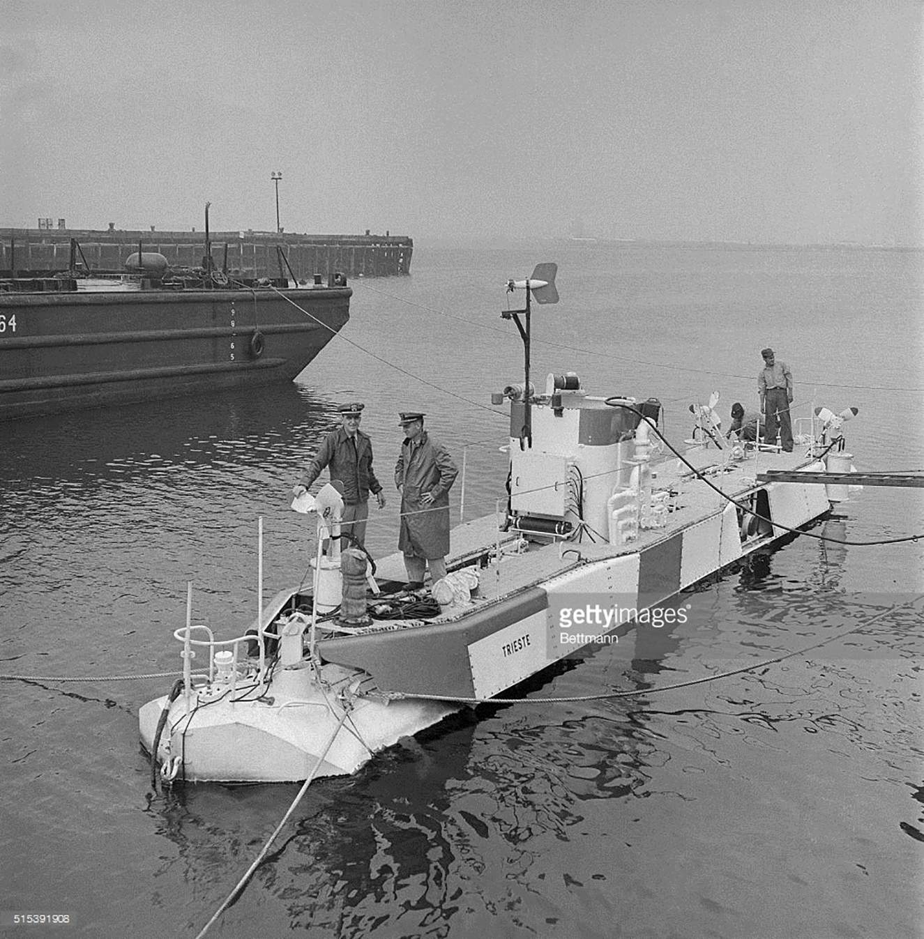 251k | (Original Caption) Lt. Donald Keach (left) and Lt. George Martin (right), who will man the Navy's deep-diving bathysphere, Trieste, stand on bow, as sailors aft make craft ready for sea. The Trieste, left the South Boston Naval Annex on 20 June 1963, under tow to take part in search for the sunken nuclear submarine,Thresher (SSN-593), some 220 miles east of Cape Cod. | Photo by Bettmann Collection/Getty Images, courtesy of gettyimages.com. | |