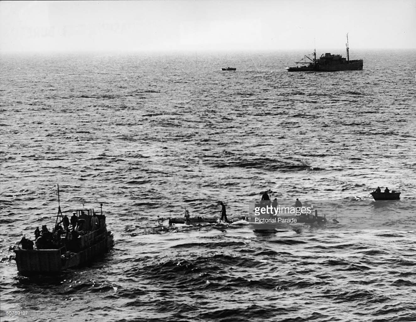 ![]() | 649k | The crew of the Trieste prepare to dive as they attempt to locate the sunken submarine Thresher (SSN-593) on 24 June 1963. The Preserver (ARS-8) appears above after towing her to the site. | Photo by Pictorial Parade/Getty Images, courtesy of gettyimages.com. | |