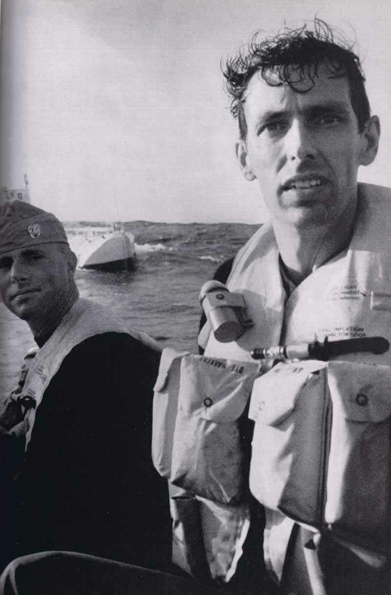 77k | Spray drenched and bone tired, Jacques Picard and Lt. Don Walsh pull away from U.S. Navy Bathyscaphe Trieste after their dive to a corrected depth of 35,800 feet. | Photo by Thomas J. Abercromie from the book Great Adventures with National Geographic, 1963. Page 330. | |