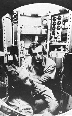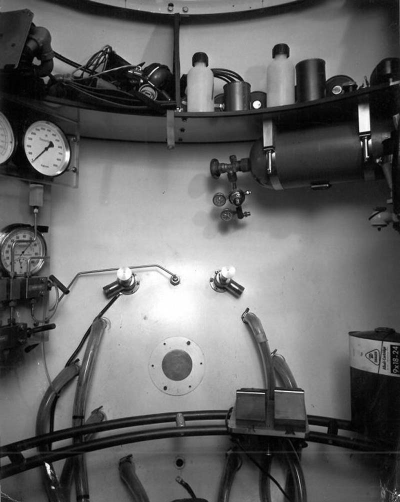 76k | The interior of the Trieste's 6½-foot-diameter pressure sphere: The two crew members could look outside through the small viewing port (lower center). The canister above contained oxygen, which was manually released when instruments indicated nitrogen levels were rising. | Photo & text courtesy of San Diego Union-Tribune. | |