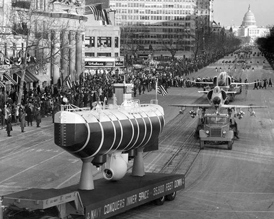 122k | A full-scale model of the Trieste at John F. Kennedy's Inaugural Day parade: 18 January 1961. | Photo & text courtesy of San Diego Union-Tribune. | |