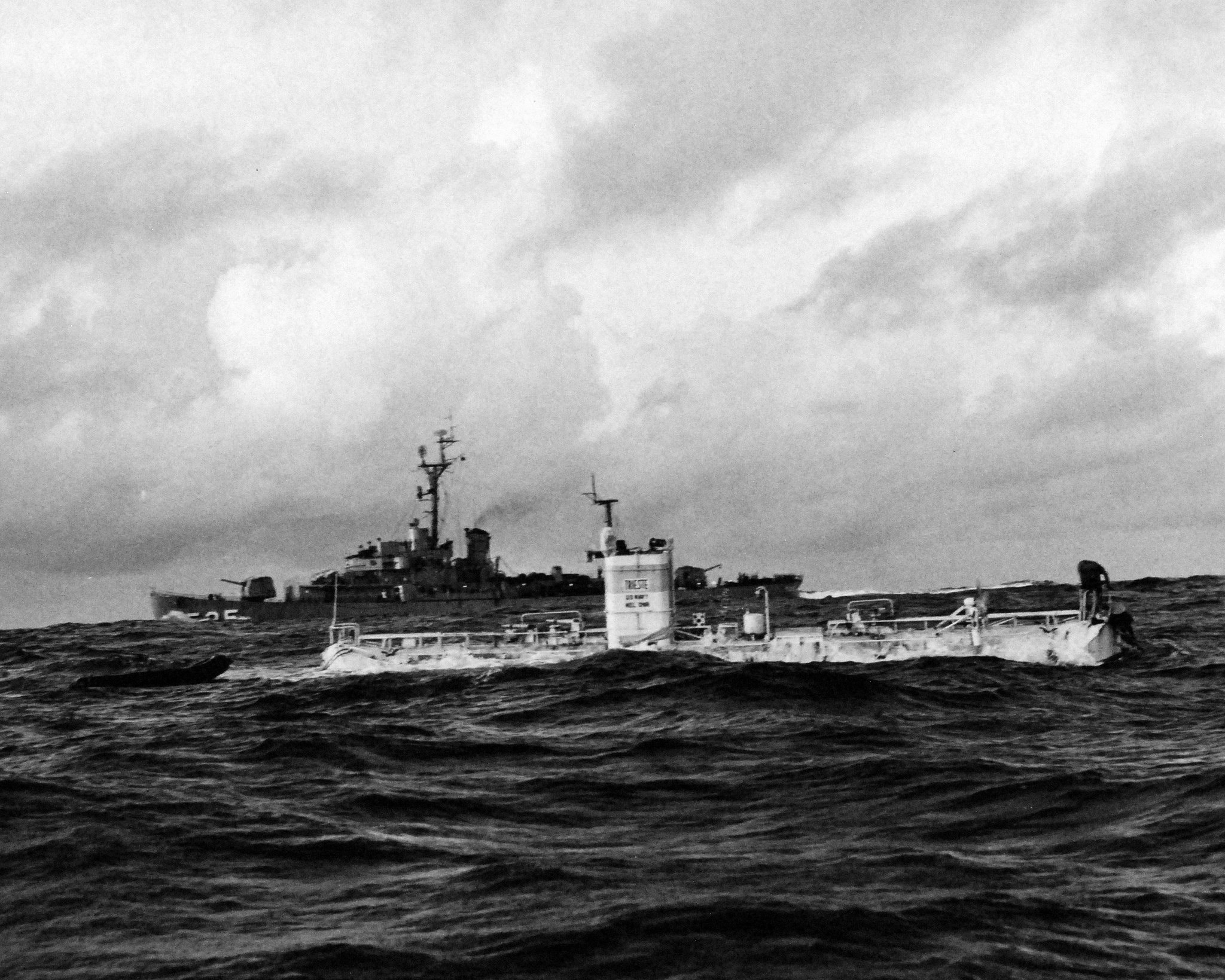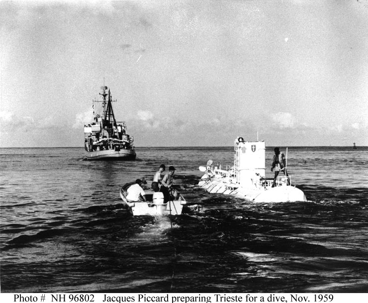 788k | U.S. Navy Bathyscaphe Trieste, just before her record dive to the bottom of the Marianas Trench, 23 January 1960. The dive, to a depth of 35,800 feet in the Challenger Deep, off Guam, was made with Lieutenant Don Walsh, USN, and Swiss scientist Jacques Piccard on board. Waves were about five to six feet high when the two men boarded Trieste from the rubber raft seen at left. Lewis (DE-535) is steaming by in the background. | Official USN photograph # USN 10446612 courtesy of the National Museum of the U.S. Navy, via flickr.com. | |