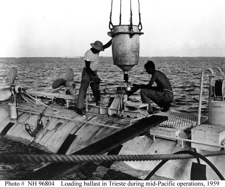 107k | U.S. Navy Bathyscaphe Trieste, Jacques Piccard (right), co-designer of the bathyscaphe, and Ernest Virgil loading iron shot ballast into Trieste, prior to her record 18,600 foot descent in in the Marianas Trench, off Guam. The dive was made on 15 November 1959. Photo was released for publication on 28 November 1959. | USNHC # NH 96804. U.S. Naval Historical Center Photograph. | |