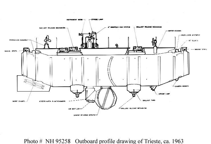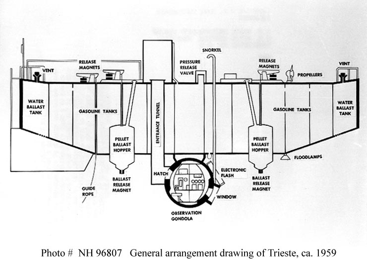 58k | U.S. Navy Bathyscaphe Trieste, General arrangement drawing, showing the bathyscaphe's main features. Drawing was released in connection with Trieste's record dive to 35,800 feet in the Challenger Deep, off Guam, on 23 January 1960. | USNHC # NH 96807. U.S. Naval Historical Center Photograph. | |