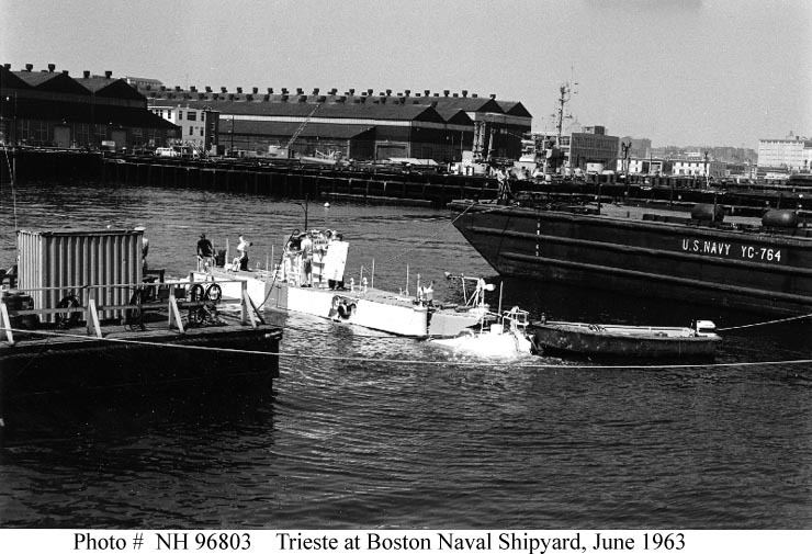 93k | U.S. Navy Bathyscaphe Trieste, operating at dockside at the Boston Naval Shipyard, Charlestown, Massachusetts, with a diver and crew assisting, 12 June 1963. Barge YC-764 is at right, and Billfish (SS-286) is in the center distance. Photographed by Belcher, Mobile Photo Group. View was probably taken during tests supporting the investigation into the loss of Thresher (SSN-593). | USNHC # NH 96803. U.S. Naval Historical Center Photograph. | |