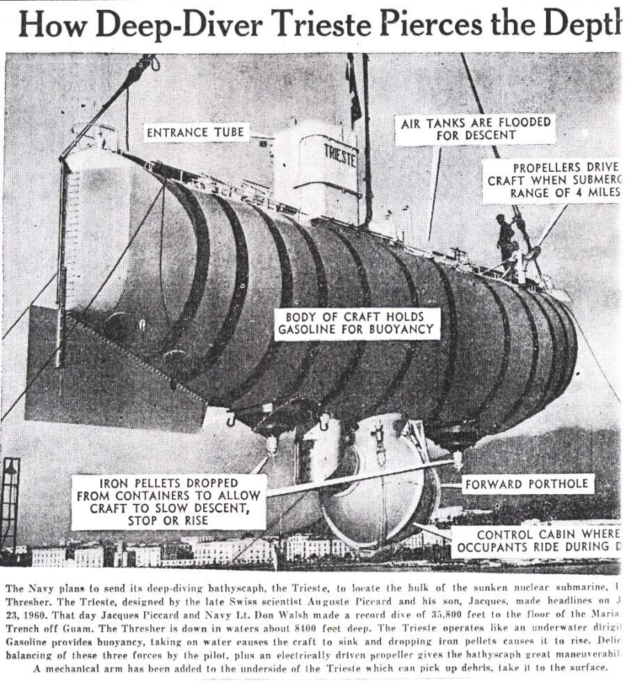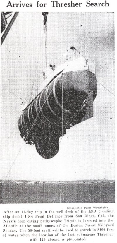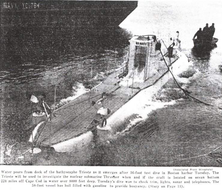212k | U.S. Navy Bathyscaphe Trieste. | UPI photo courtesy of the Springfield Mass. Morning Union newspaper, 18 April 1963. Submitted by Stan Svec. | |