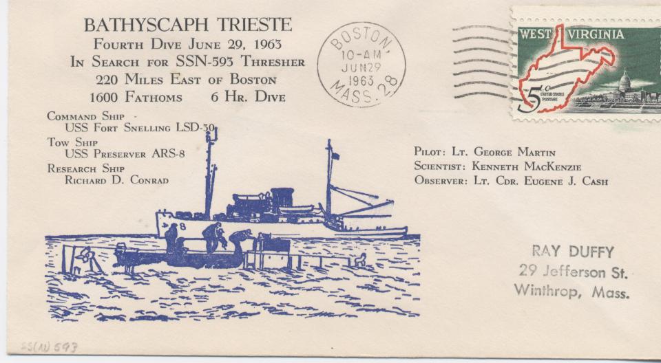74k | Commemorative post mark on the occasion of U.S. Navy Bathyscaphe Trieste fourth dive on 29 June 1963, while in search of the Thresher (SSN-593) in 1600 fathoms of water. | Photo courtesy of Jim Richardson. | |