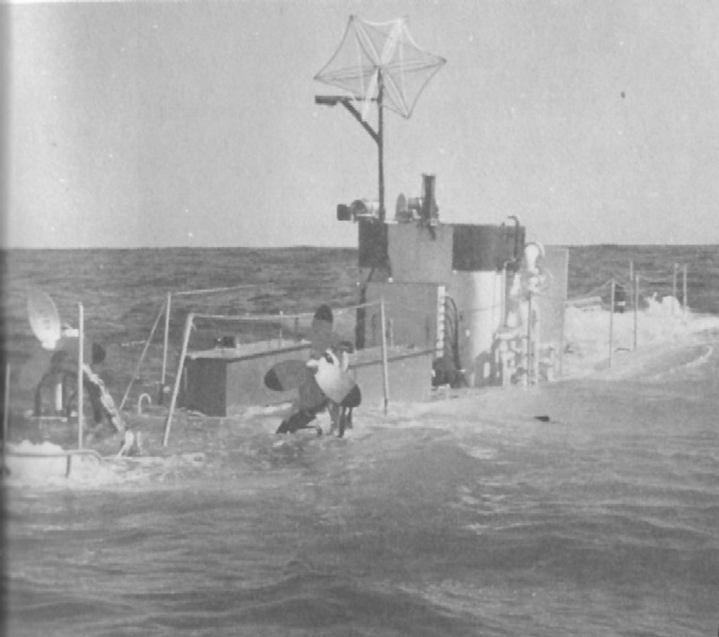117k | U.S. Navy Bathyscaphe Trieste wallowing on the surface, awaiting a support ship. Note the small propellers for underwater manoeuvring. The kite-like affair is a radar reflector to help support ships locate the low-lying craft. | USN photo courtesy of The American Submarine, by Norman Polmar & submitted by Robert Hurst. | |