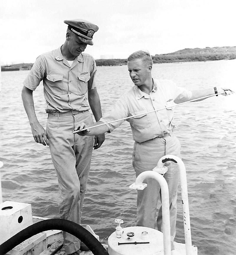 86k | Captain Don Walsh is pictured on the right side with his Operation Nekton team member U.S. Navy Lieutenant Larry Shumaker who is wearing his hat at Guam in November 1959. Lieutenant Larry Shumaker had previously served with Captain Don Walsh on the U.S. Navy submarine named The Rasher (SS-269). Don and Larry were great friends and Larry served as Captain Walsh's assistant, and they were classmates at the Annapolis Naval Academy. U.S. Navy Captain Don Walsh had an amazing career in the U.S. Navy. In 1958 he was a submarine Lieutenant serving on the staff of Submarine Flotilla One in San Diego, California as part of the U.S. Submarine Force. Submarine Flotilla One commanded 24 submarines along with 4 support ships which gave it a large theater of operations as part of the Pacific Fleet. | Photo courtesy of Life Magazine via Bill Gonyo. | |