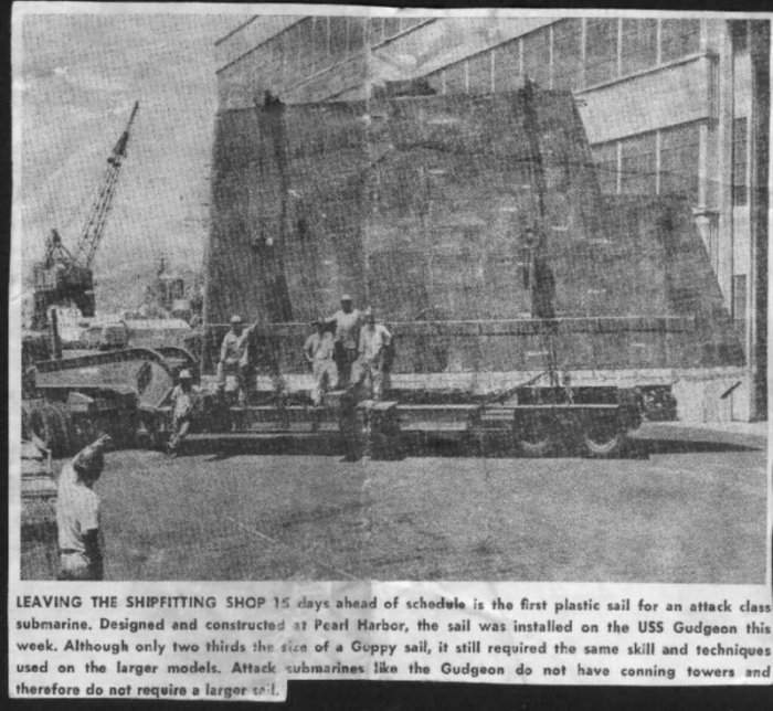 37k | Leaving the shipfitting shop 15 days ahead of schedule is the first plastic sail for an attack class submarine. Designed and constructed at Pearl Harbor, the sail was installed on the Gudgeon (SS-567) this week. Although only 2/3rds the size of a Guppy sail, it still required the same skill and techniques used on the larger models. Attack submarines like the Gudgeon do not have conning towers and therefore do not require a larger sail. | Photo courtesy of ussgudgeon.photosite.com. | |