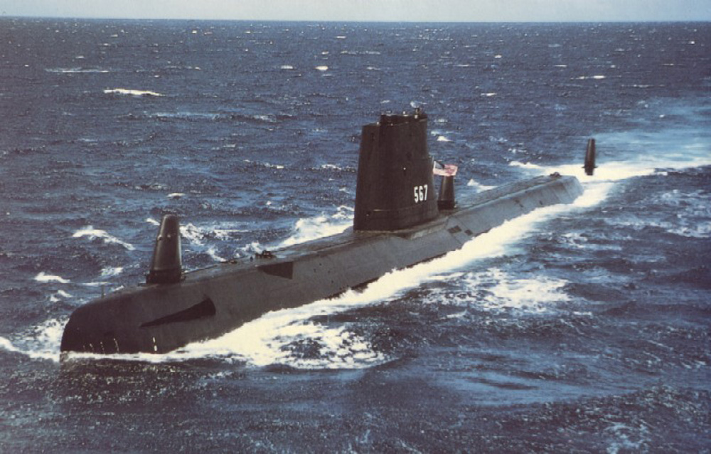 258k | Gudgeon (SS-567) underway with the shark fin arrays with the standard BQG-4 PUFFS system. Circa 1963. | Text by QM2(SS)David Johnston (USN, retired) Photo courtesy of ussgudgeon.photosite.com. |