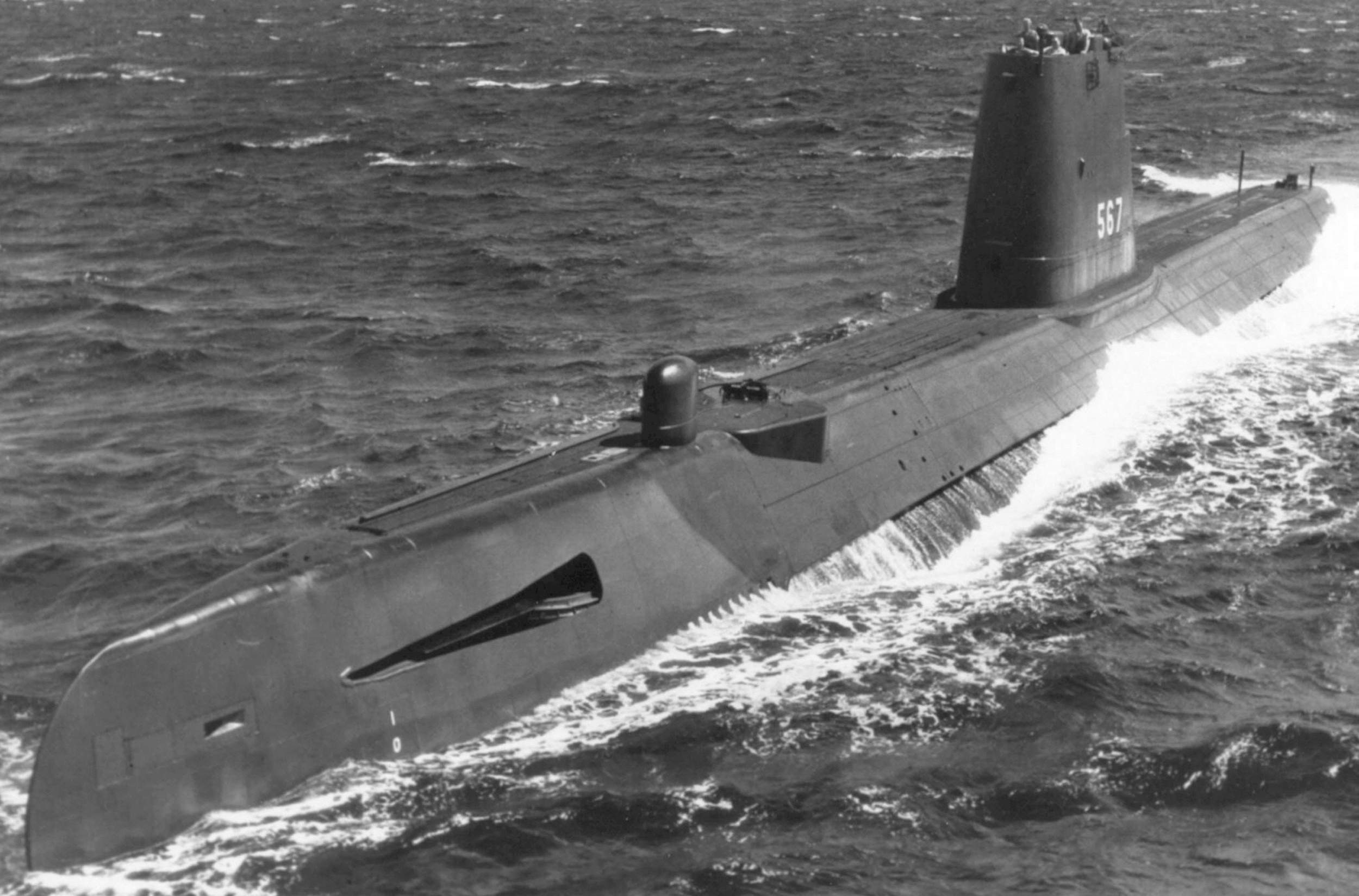 663k | The Gudgeon (SS-567) runs off Block Island, 25 May 1953. Her snorkel induction and ECM (ESM) masts are raised. The big fairing on the starboard side (abaft the sonar dome) supports her trainable BQR-3 attack sonar. | Text courtesy of U.S. Submarines Since 1945, An Illustrated Design History by Norman Friedman & James L. Christley.