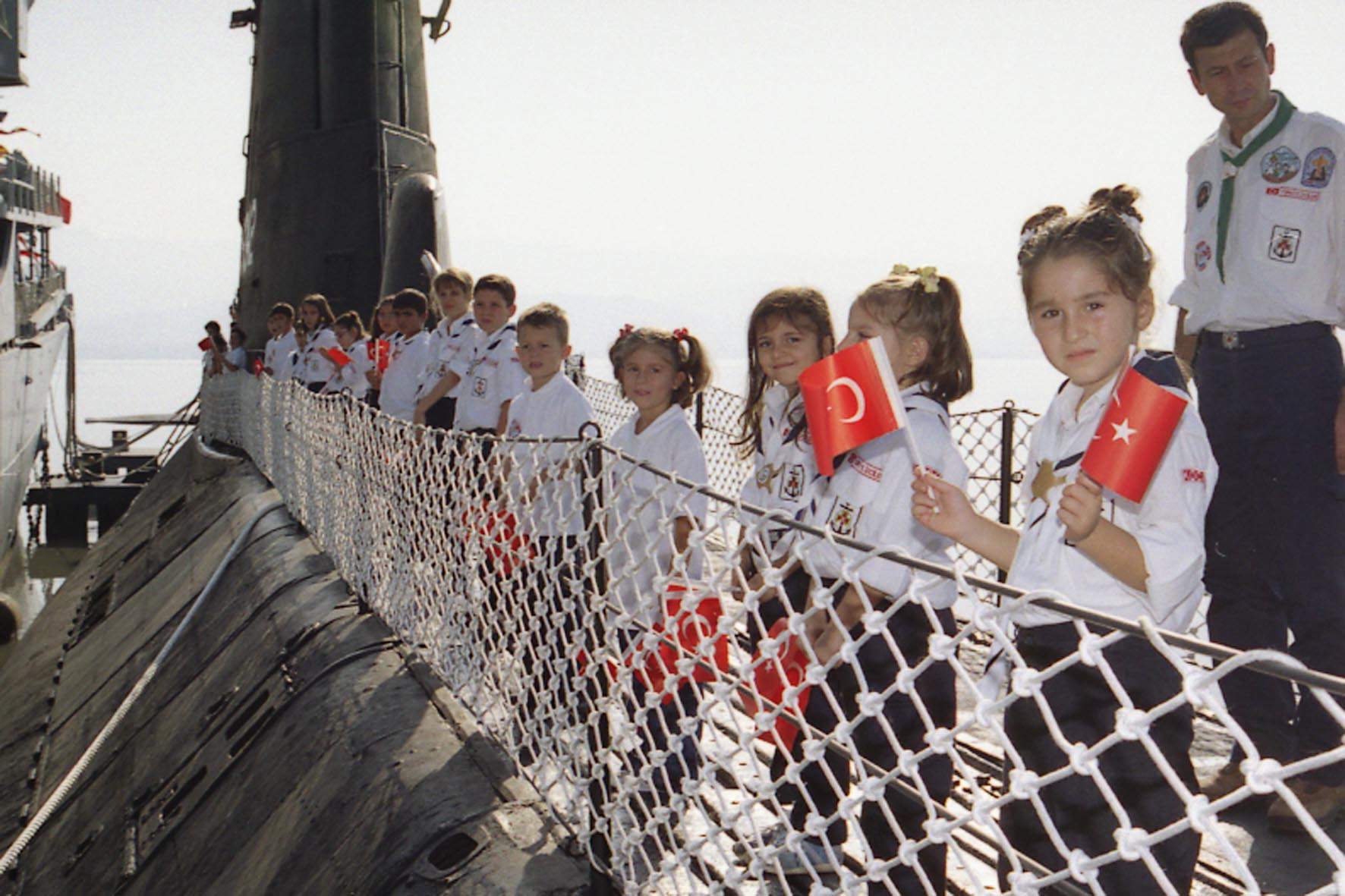205k | Kids are the same everywhere, give them a flag and show them a sub, as seen here aboard Hizirreis (S-342), Spring 2005. | Turkish Navy Photo courtesy of RADM. Can Erenoglu,Commander of Turkish Submarine Fleet. | |