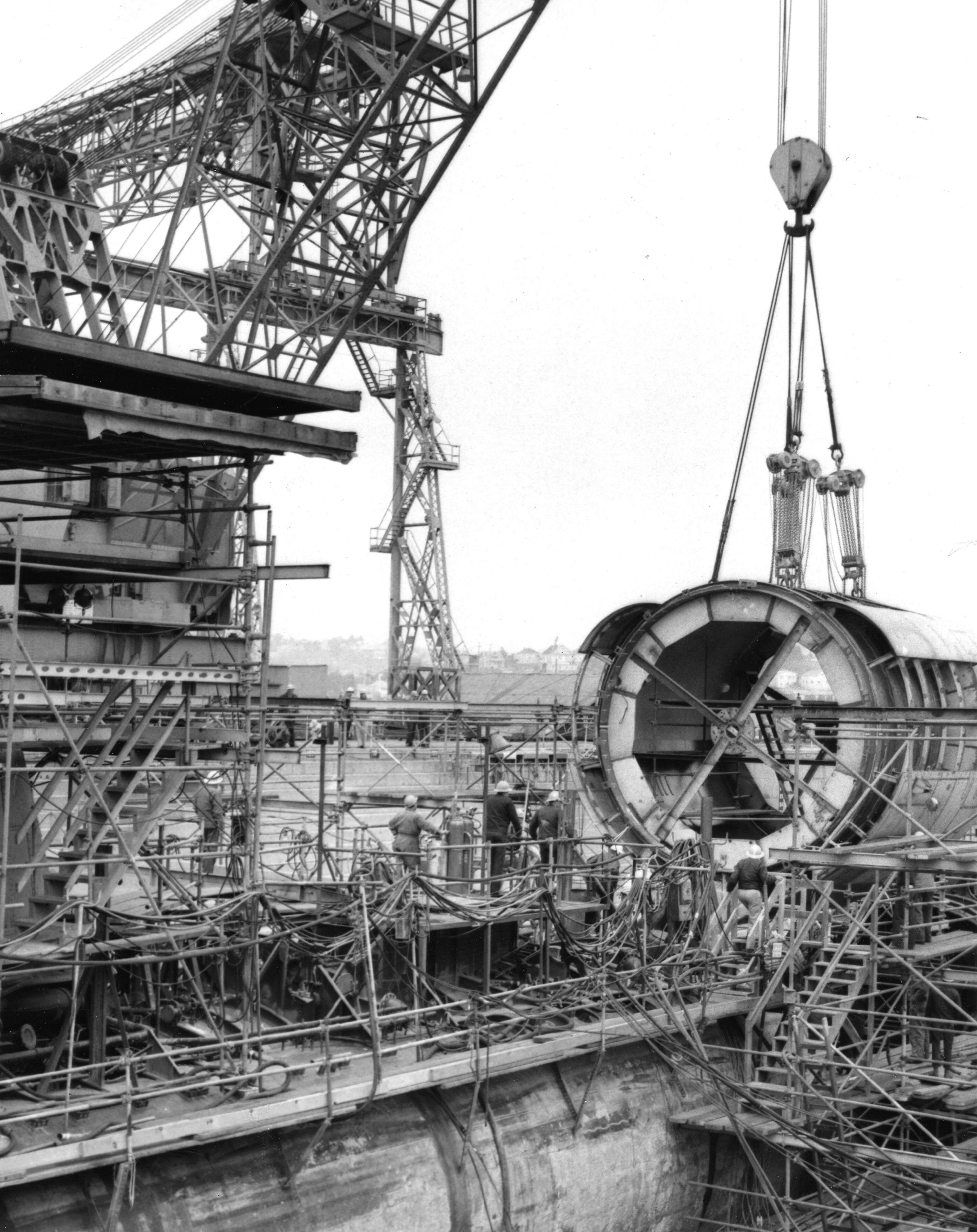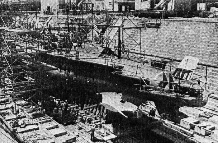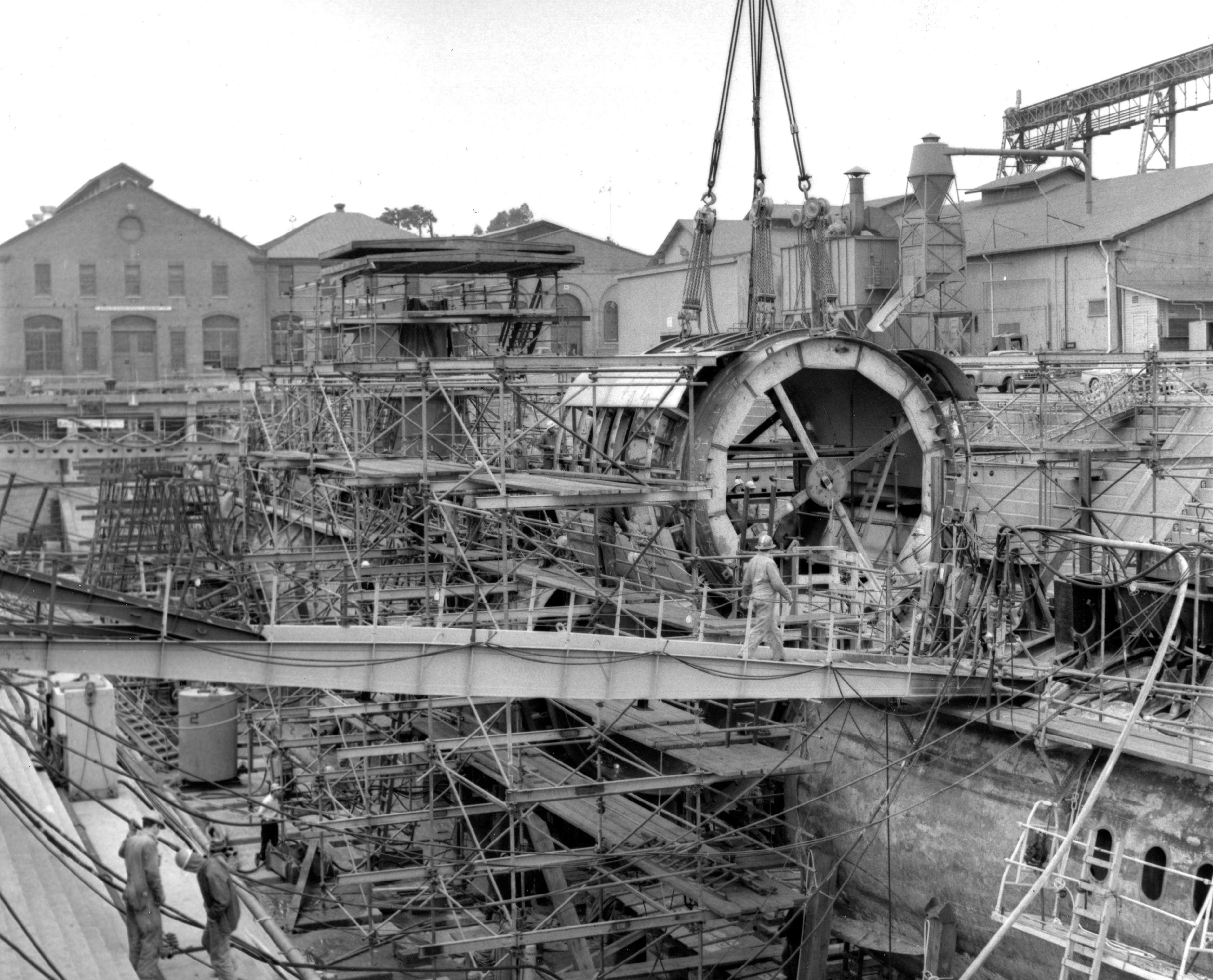 838k | The landing of Gudgeon's (SS-567) new 18 foot hull section at Mare Island on 7 March 1966. The submarine is in the shipyard's dry dock #1. | Photo courtesy of the Vallejo Naval and Historical Museum via Darryl L. Baker. | |