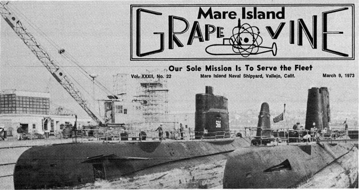 84k | The Trout (SS-566), left and the Gudgeon (SS-567) right are in dry dock #4 at Mare Island in February 1973. Both boats were in dock from 22 February until 3 October 1973. Gudgeon was in overhaul from 22 February until 21 December 1973 and Trout from 22 February 1973 until 28 January 1974. Photo from the 9 March 1973 edition of Mare Island's newspaper "Grapevine". | Courtesy of Darryl L. Baker. | |