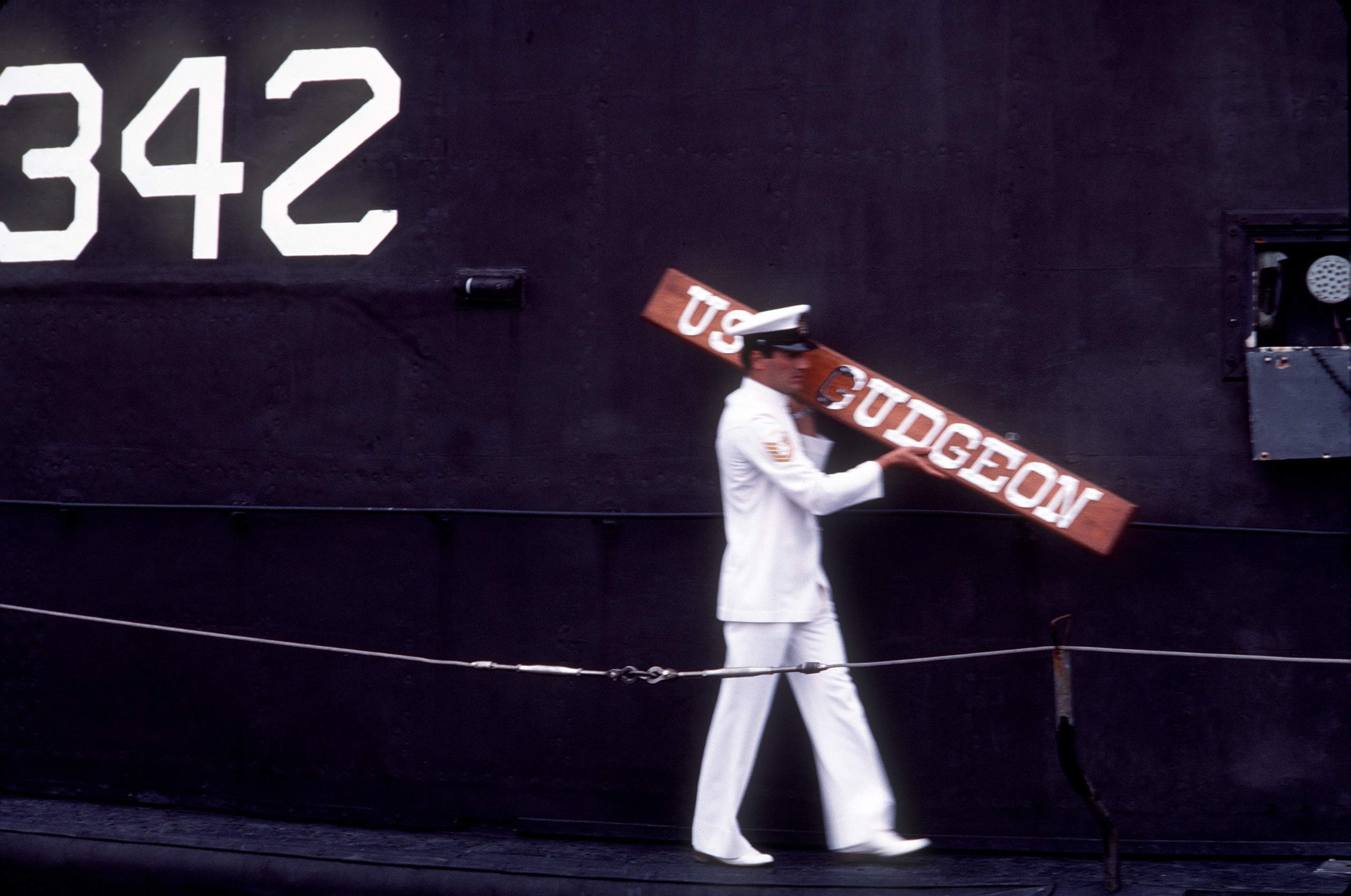 374k | A Turkish sailor removes the name from the Tang class submarine ex-Gudgeon (SSAG-567) during the transfer ceremony at Point Loma, CA. on 30 September 1983. The Gudgeon was decommissioned and is being immediately transferred to the Turkish Navy on a five-year lease. The submarine is being renamed to TCG Hizirreis (S-342). | USN photo # DN-ST-85-08684, by PH1 Bob Weissleder, from the Department of Defense Still Media Collection, courtesy of dodmedia.osd.mil & submitted by Bill Gonyo. | |