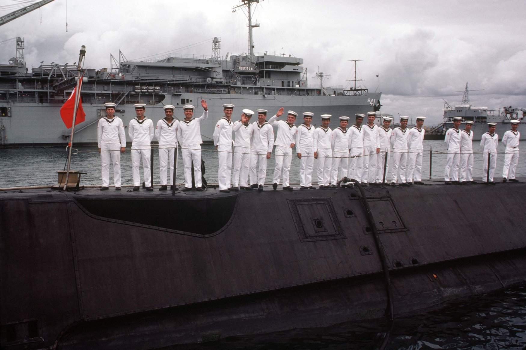 85k | A Turkish sailor raises the Turkish commissioning pennant aboard the Hizirreis (S-342) as members of its former crew stand in the foreground. The Tang class submarine ex-Gudgeon (SSAG-567) has been decommissioned and is being immediately transferred to the Turkish Navy on a five-year lease. | USN photo # DN-ST-85-08687, by PH1 Bob Weissleder, from the Department of Defense Still Media Collection, courtesy of dodmedia.osd.mil & submitted by Bill Gonyo. | |