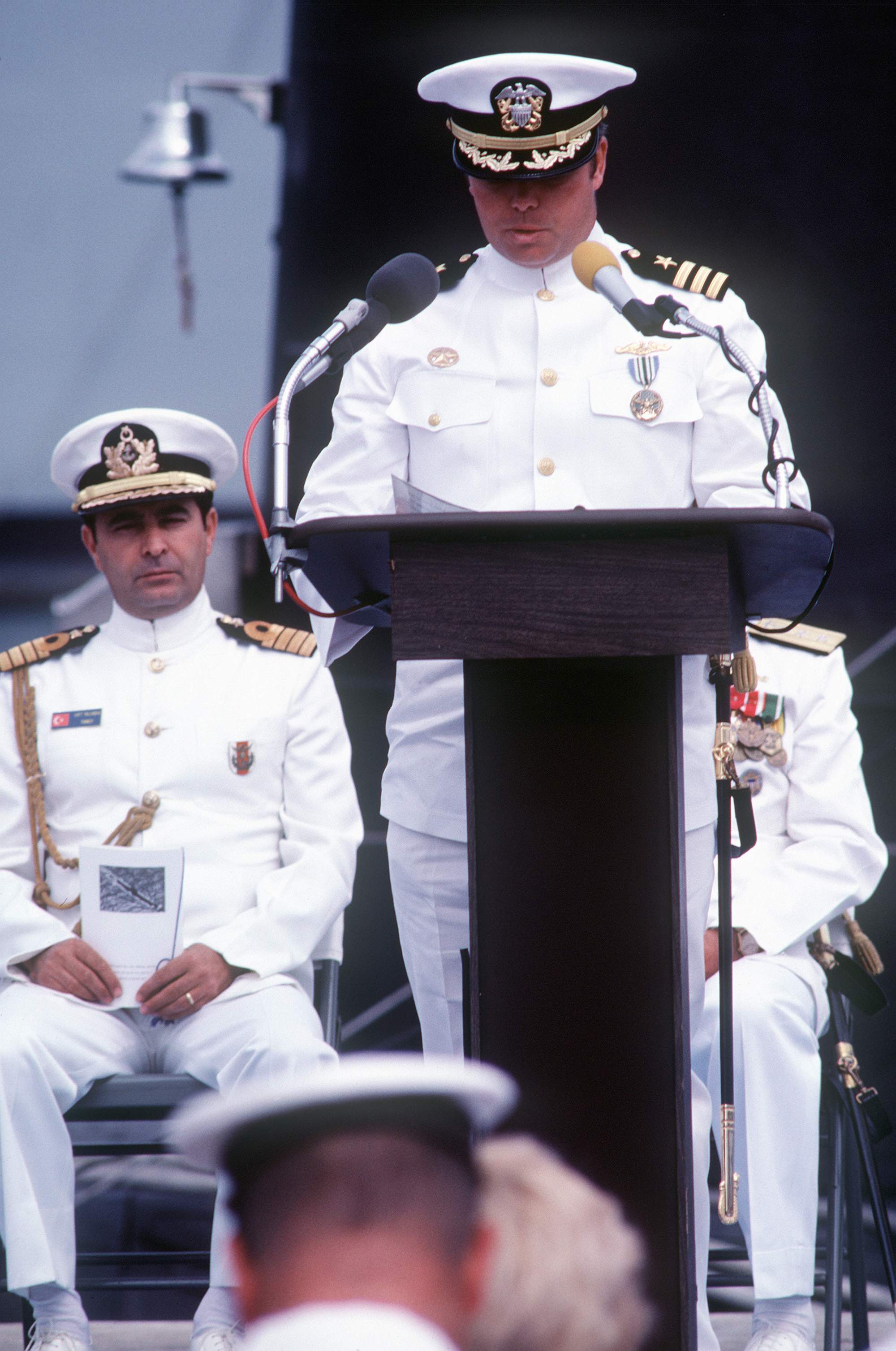 457k | Commander G. Mike Wilson, ex-commanding officer, reads the decommissioning and transferring orders for the ex-Gudgeon (SSAG-567). The Tang class submarine, upon decommissioning, is being immediately transferred to the Turkish Navy on a five-year lease. The submarine is being renamed to Hizirreis (S-342). | Image and text courtesy of NARA | |