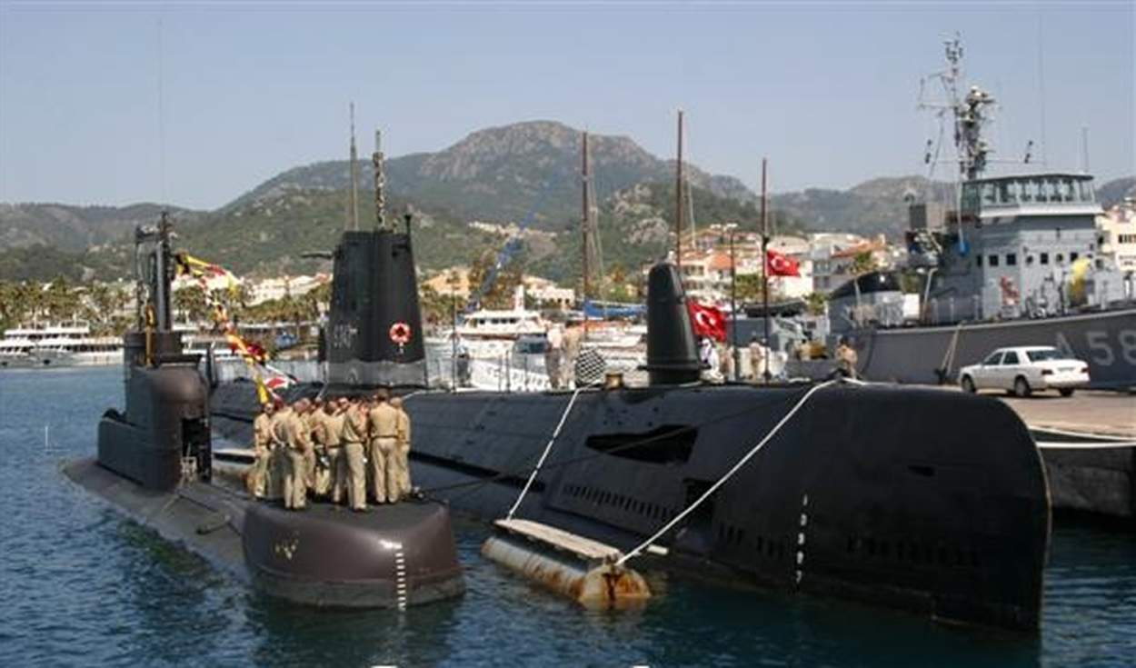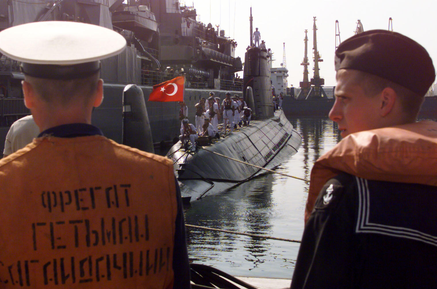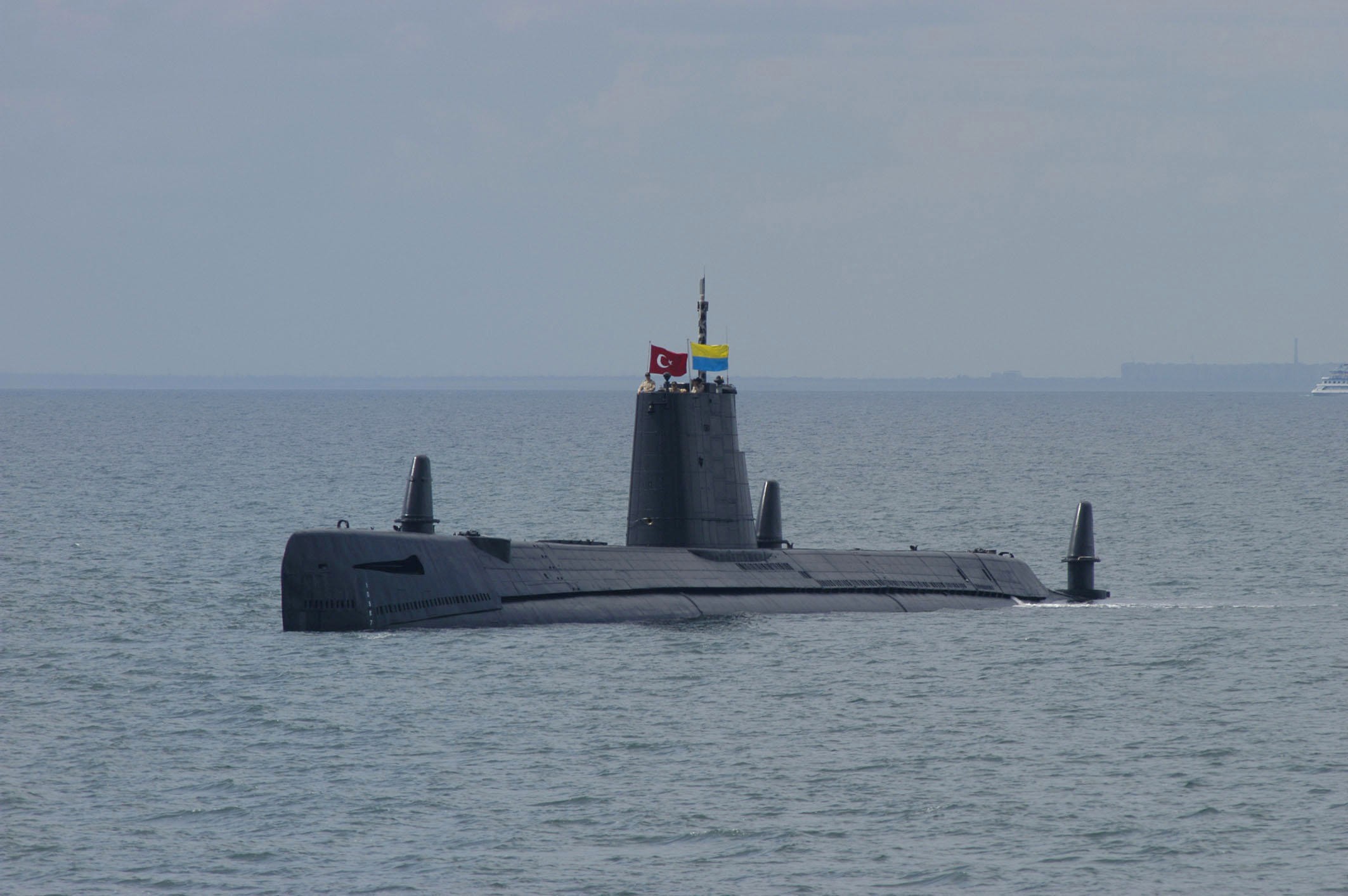 332k | Flying the Turkish and what might be an upside down Ukrainian flag, the Hizirreis (S-342) goes ahead slowly. | Photo courtesy of Y.M.Umar,CPO (Ret.),Turkish Navy. | |