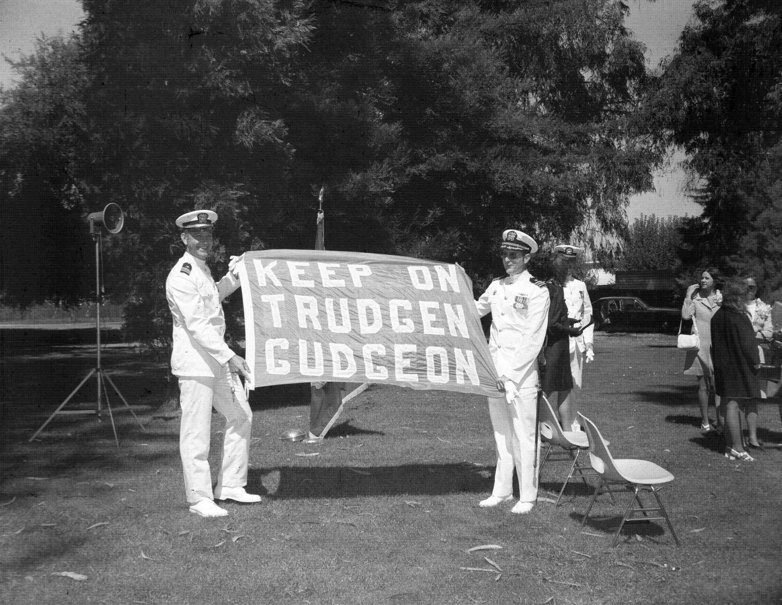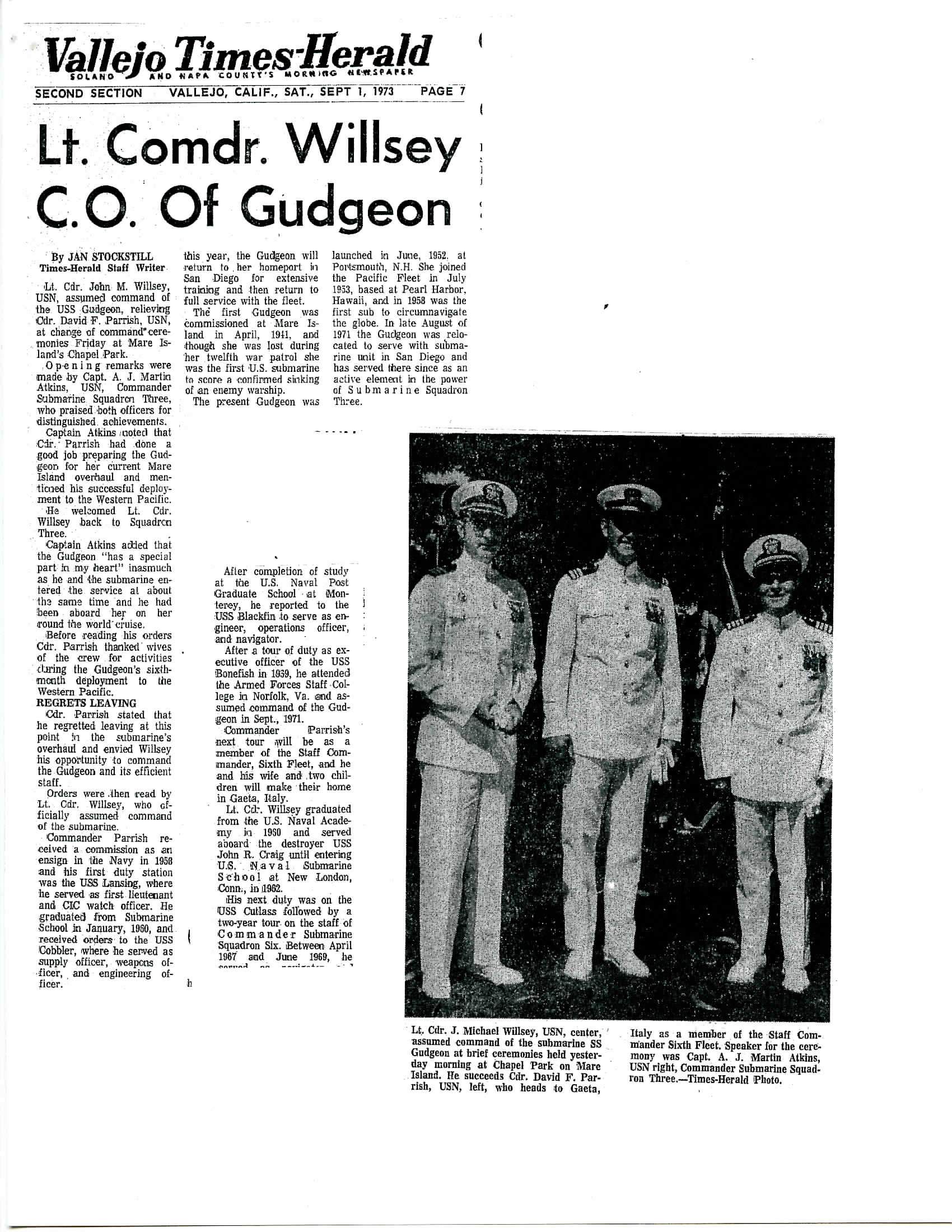 640k | LCDR John M. Willsey (new CO) and the former CO CDR David F. Parrish hold the Gudgeon (SS-567) flag at the conclusion of the change of command ceremonies at Mare Island on 25 September 1973. | USN photo # 118398-9-73, courtesy of Darryl L. Baker. | |