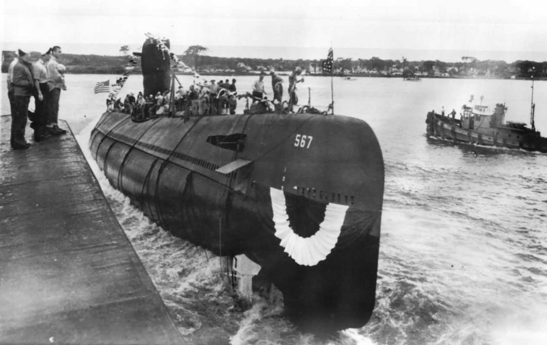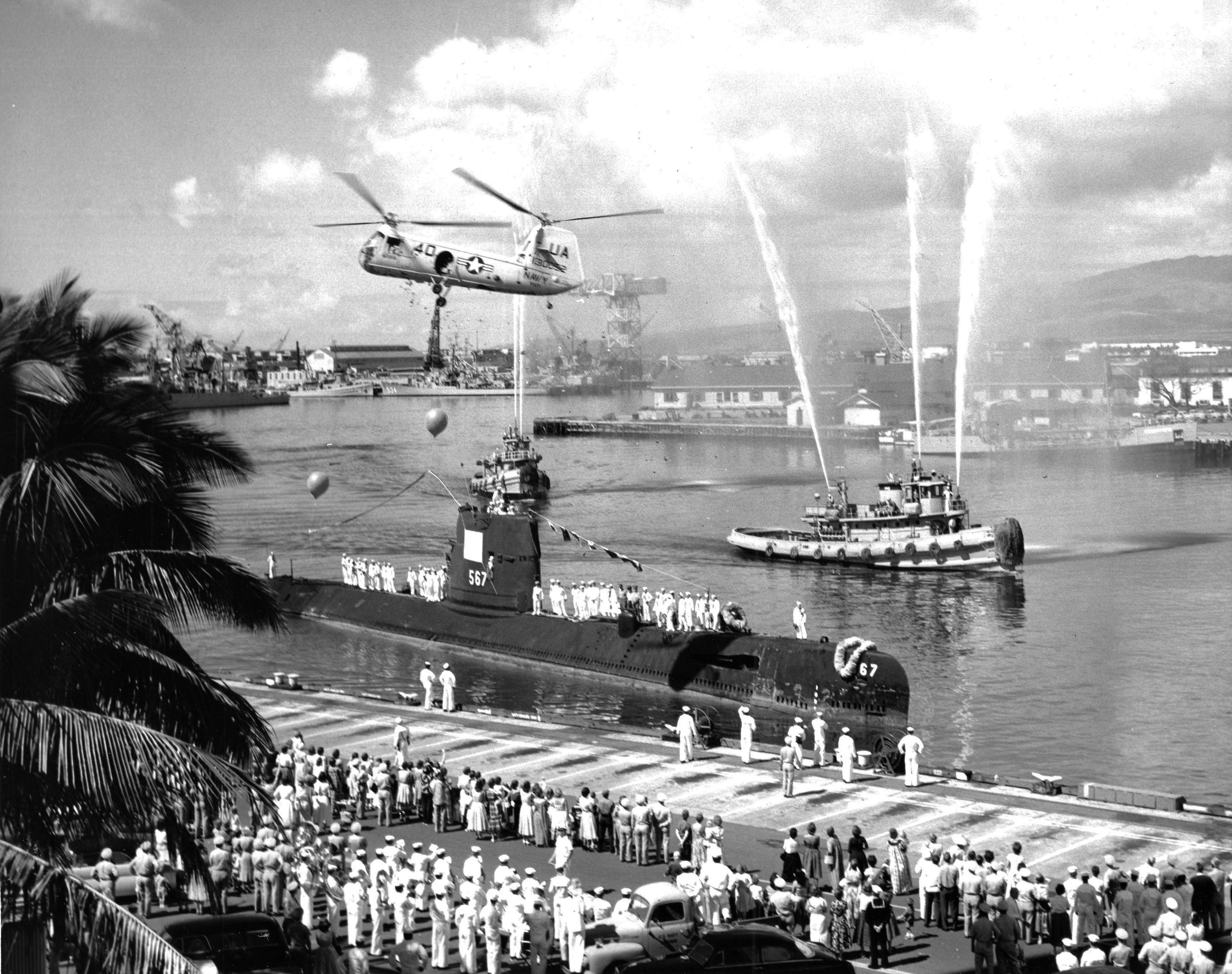 251k | A helicopter swooped in low and dropped a bouquet of flowers onto the bow of the submarine Gudgeon (SS-567) when it sailed into Pearl Harbor, Hawaii, in February 1958. The Gudgeon was completing an historic voyage – the first submarine to circumnavigate the globe. During its eight-month journey, the vessel marked another first – it was the first U.S. warship to pass through the Suez Canal. | Image and text courtesy of pocahontastimes.com | |