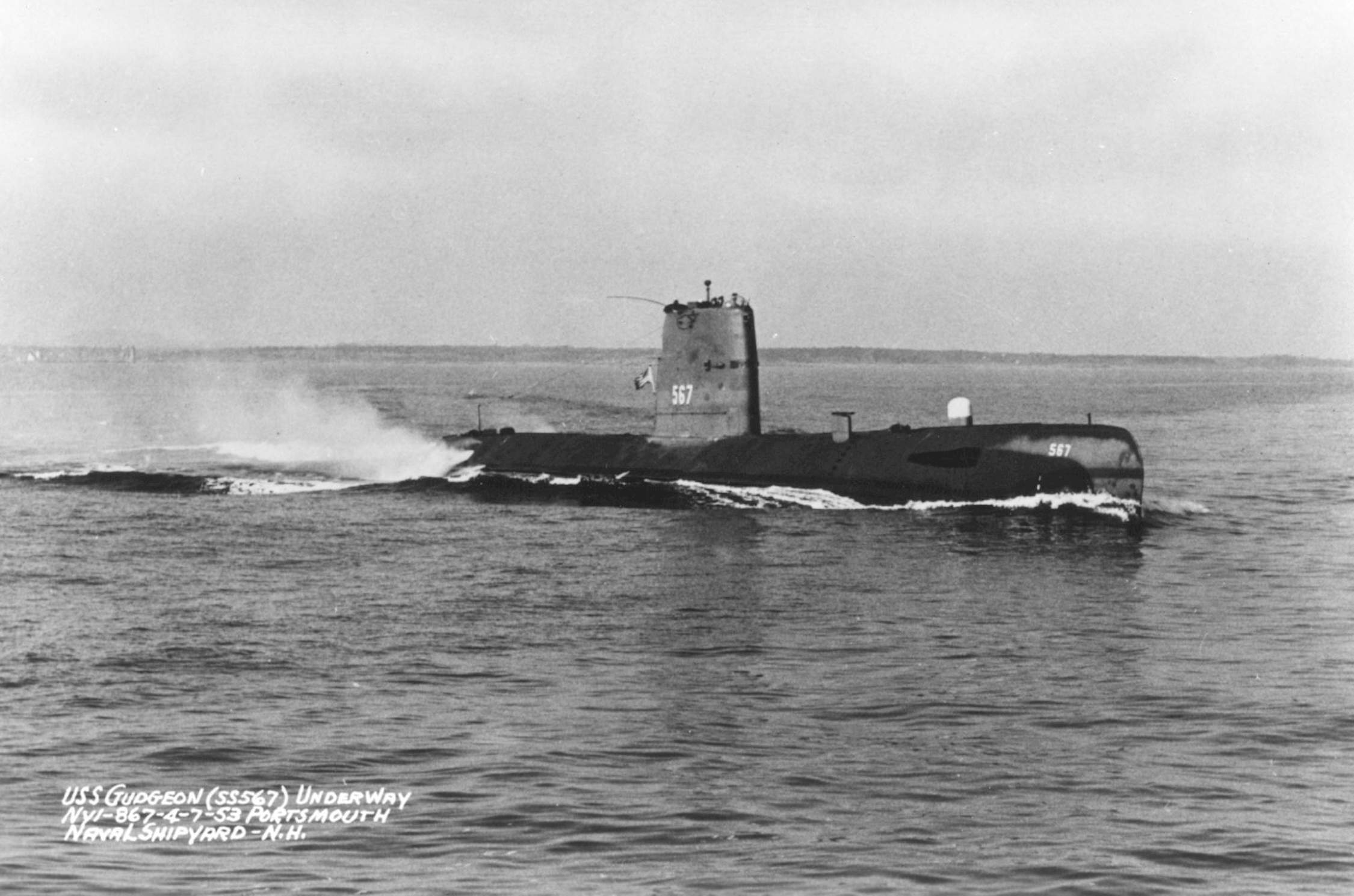 1.22k | Gudgeon (SS-567) 13 June 1957, in the Pacific. This photo was taken 3 weeks before her history-making cruise around the world, making the Pacific Fleet Submarine Force's flagship the first American submarine to circumnavigate the globe. | Text courtesy of DANFS. USN photo courtesy of Scott Koen & ussnewyork.com. | |