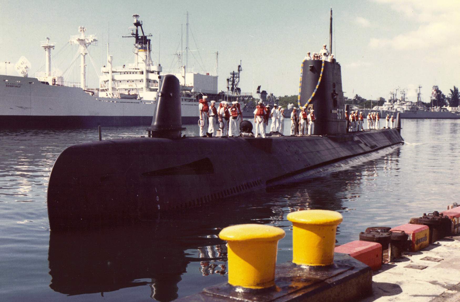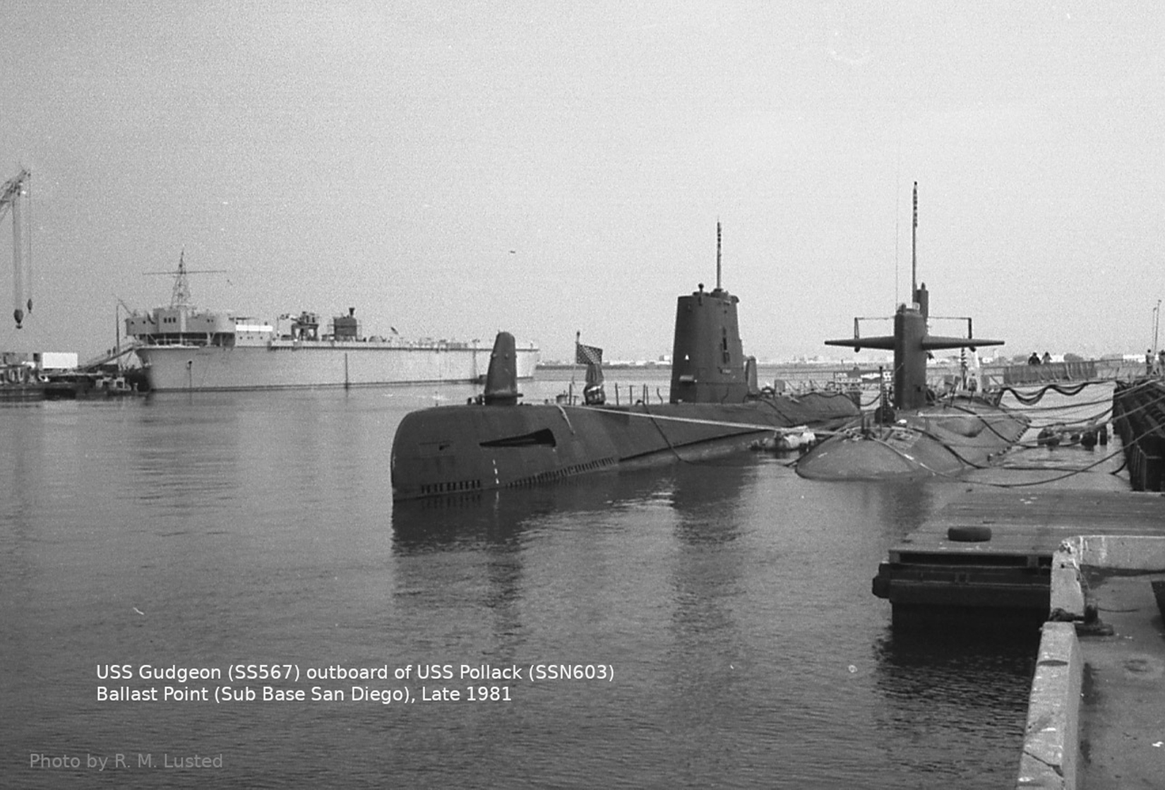 798k | Pollack (SSN-603) and Gudgeon (SS-567) tied up at Ballast Point, San Diego in late 1981. | Courtesy of Roderick Lusted. | |