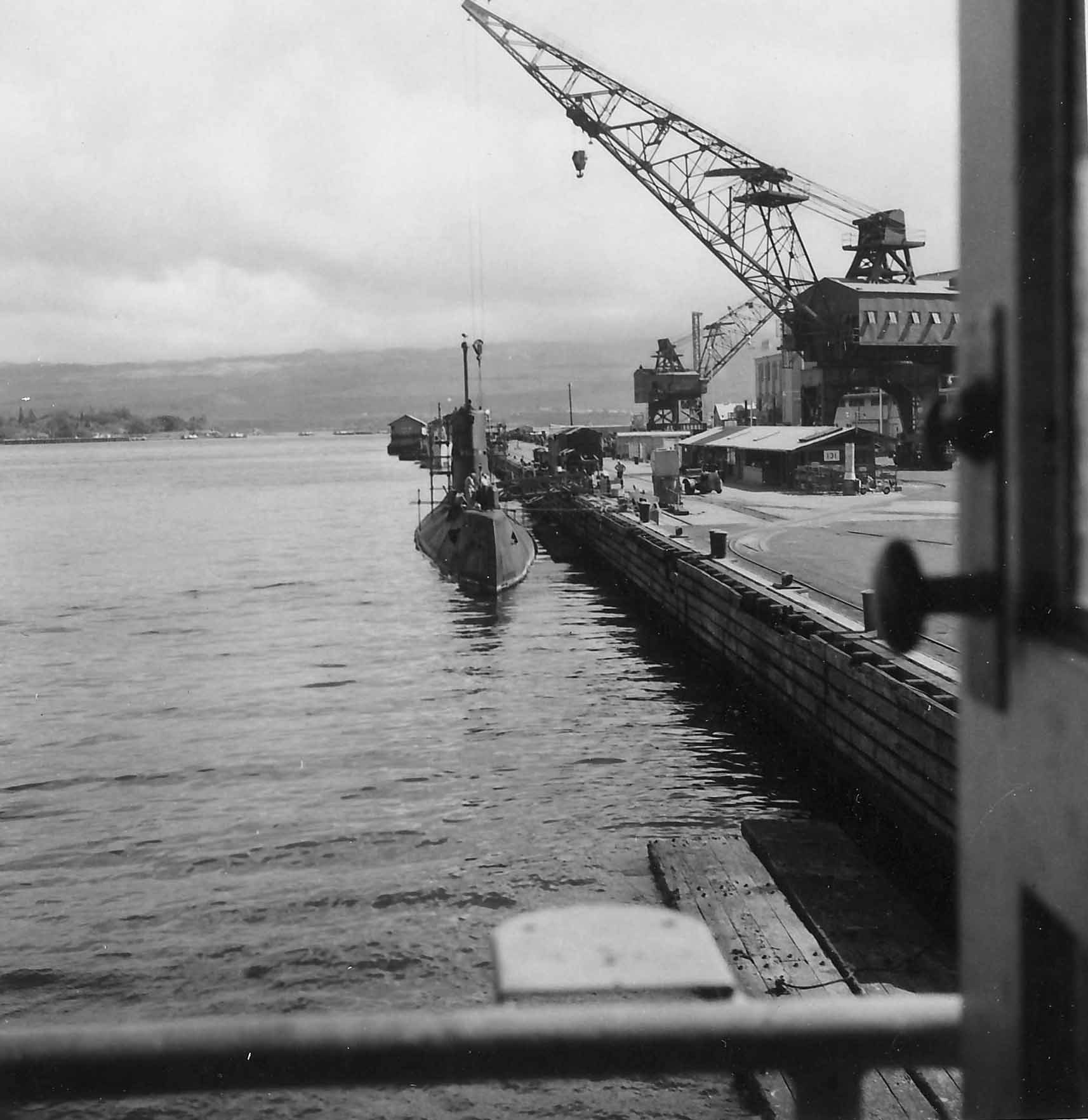 109k | Port side view of the Gudgeon (SS-567) as she appeared from the cigarette deck of the Archerfish (AGSS-311) in Pearl Harbor in late August 1963. | Photo courtesy of Fred Firks and submitted by Ken Henry. | |