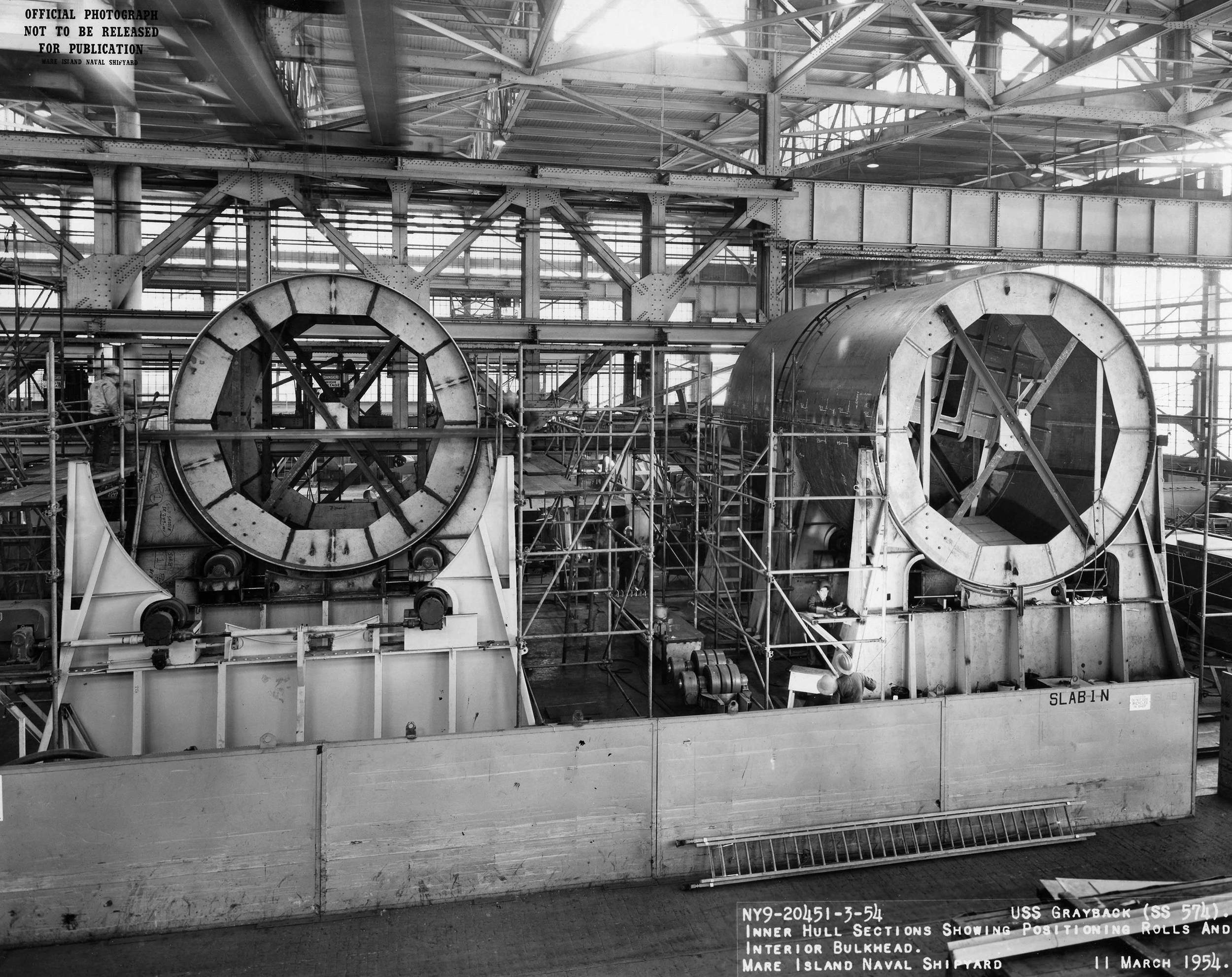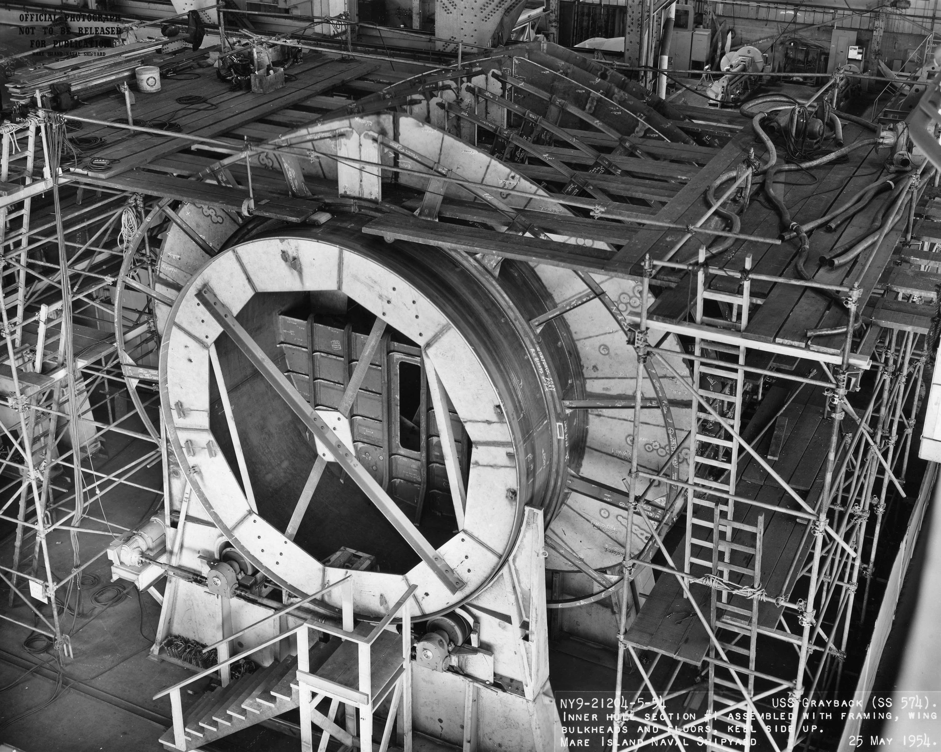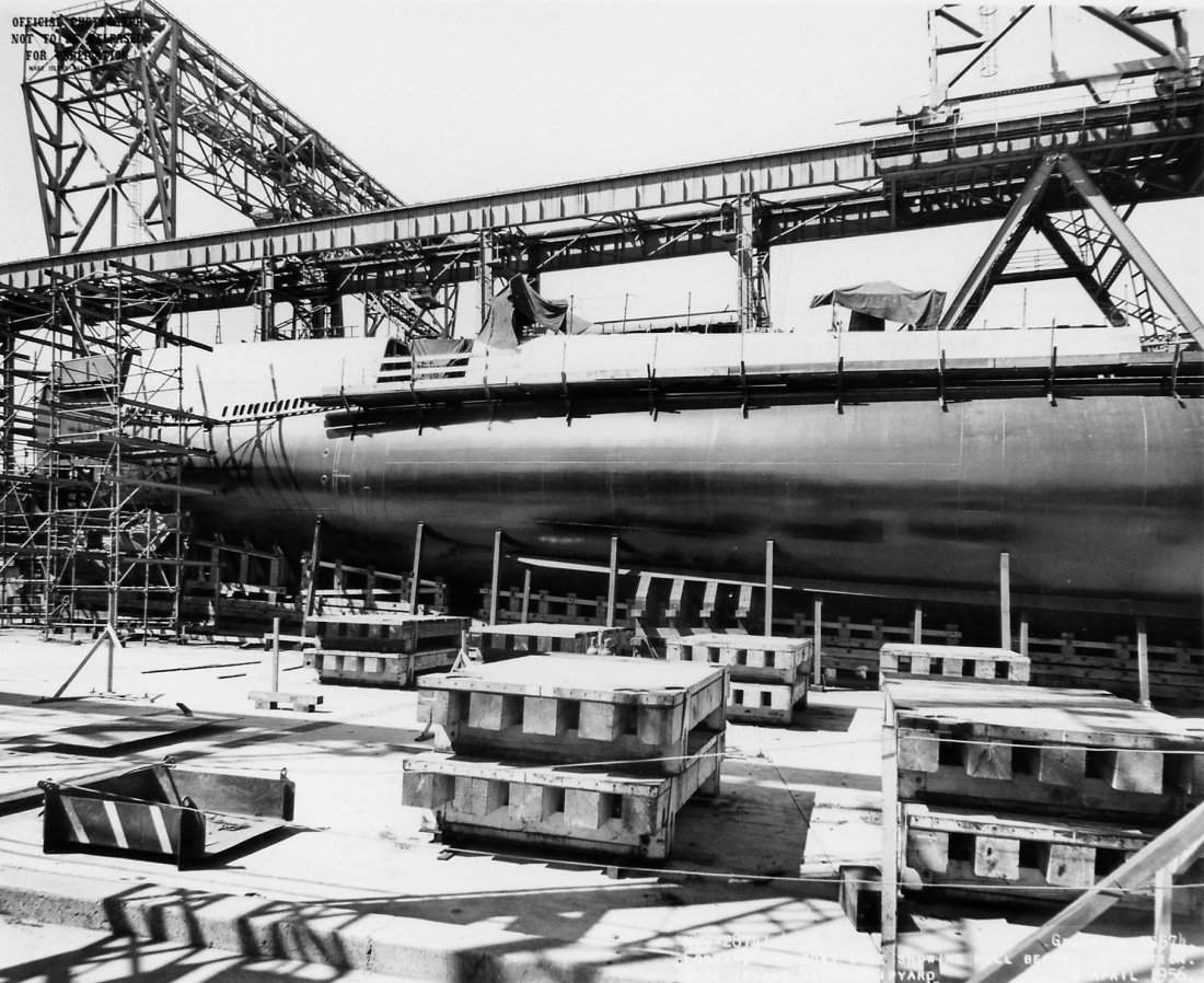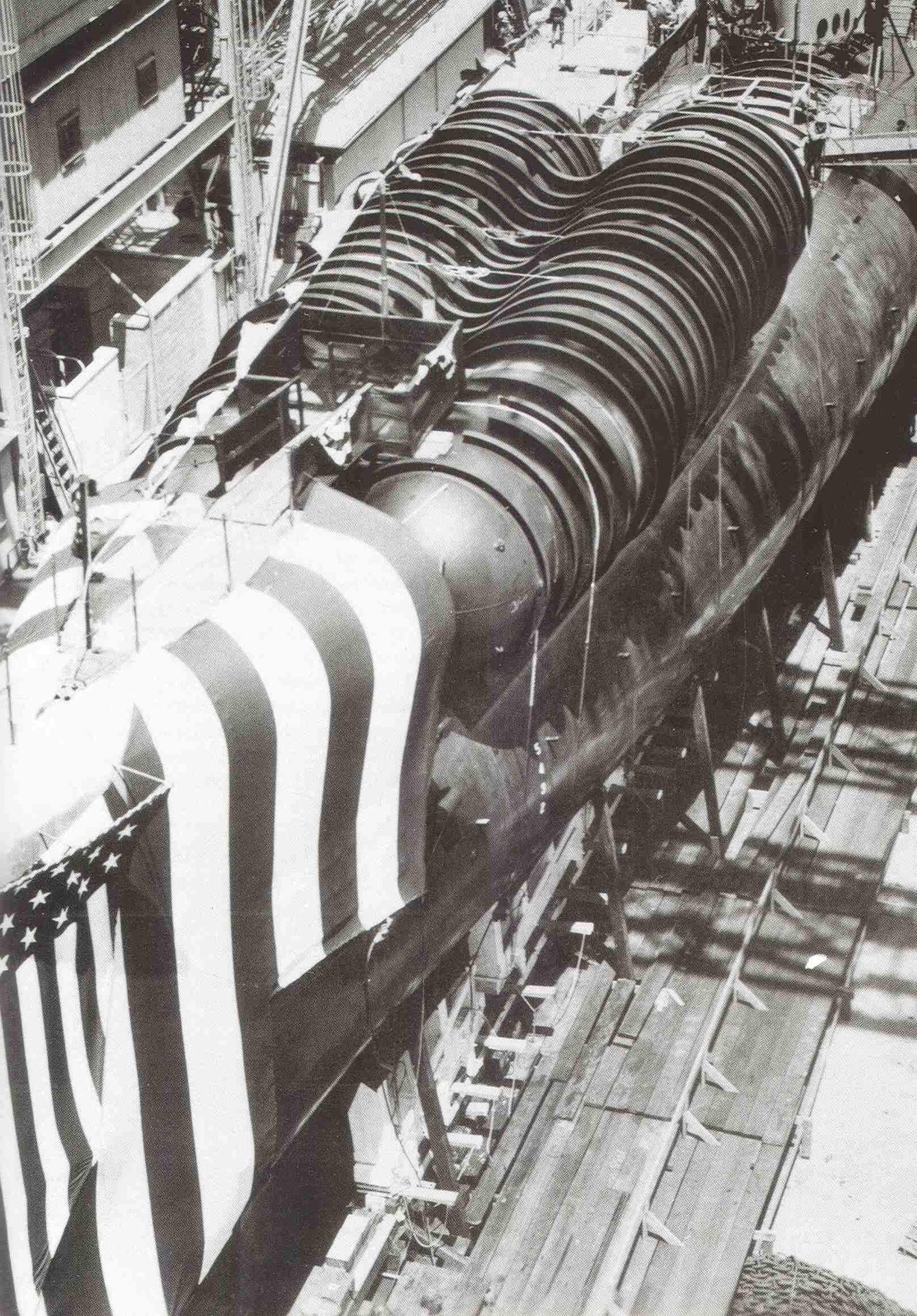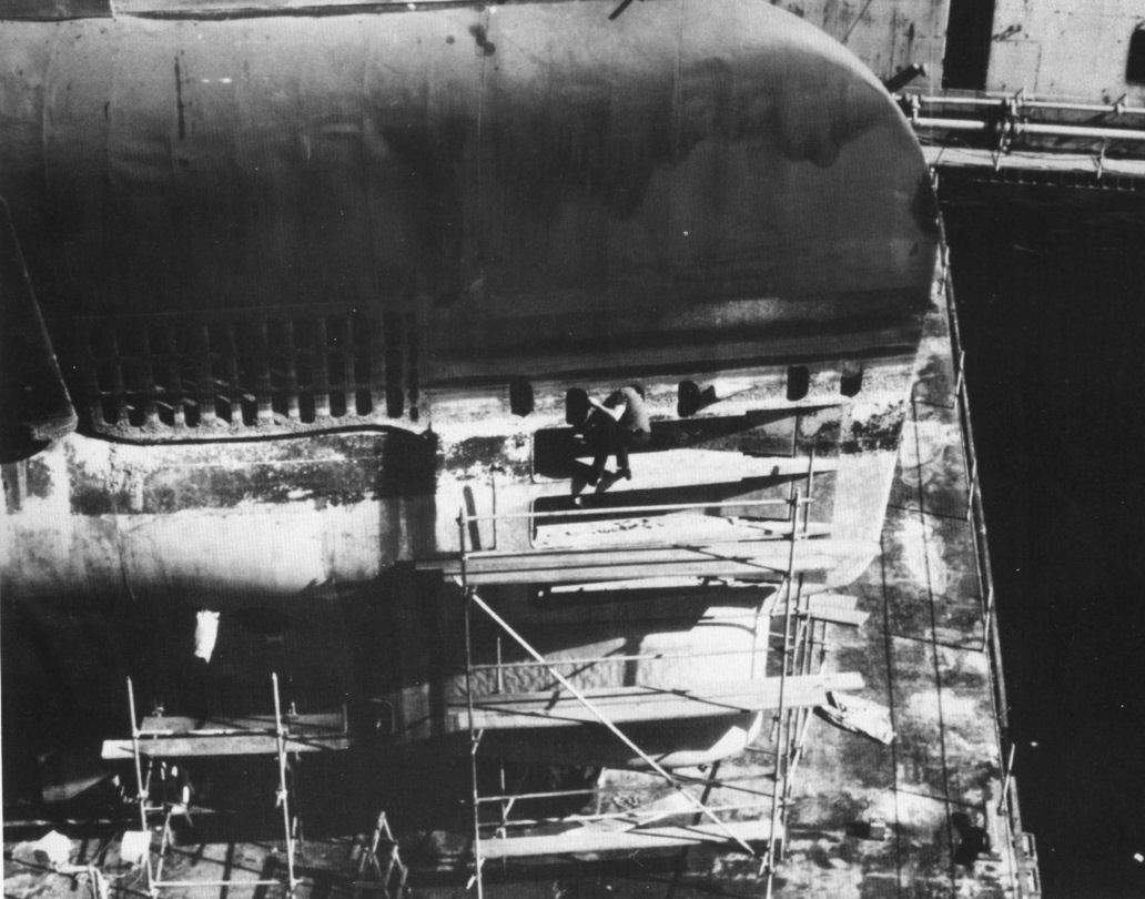 ![]() | 1.10k | Inner hull sections showing positioning rollers and interior bulkheads on 11 March 1954. | USN photo # 20451-5-54, courtesy of Darryl L. Baker. | |