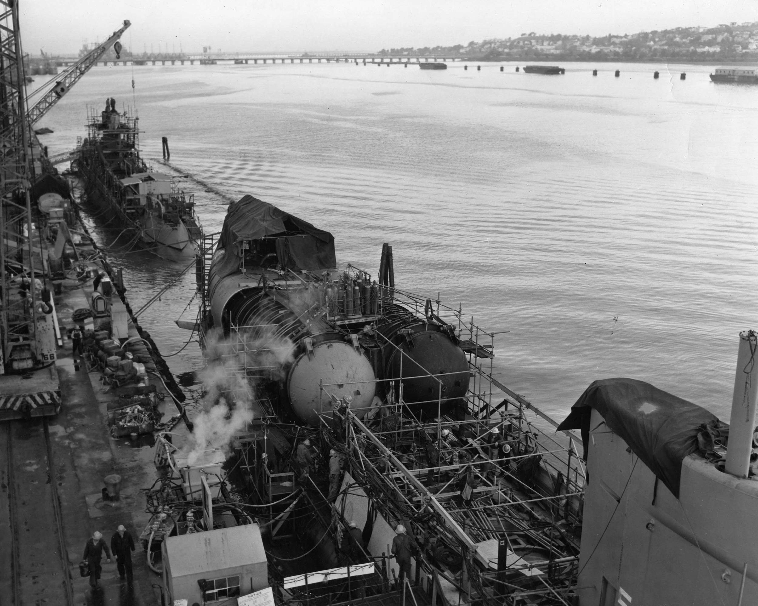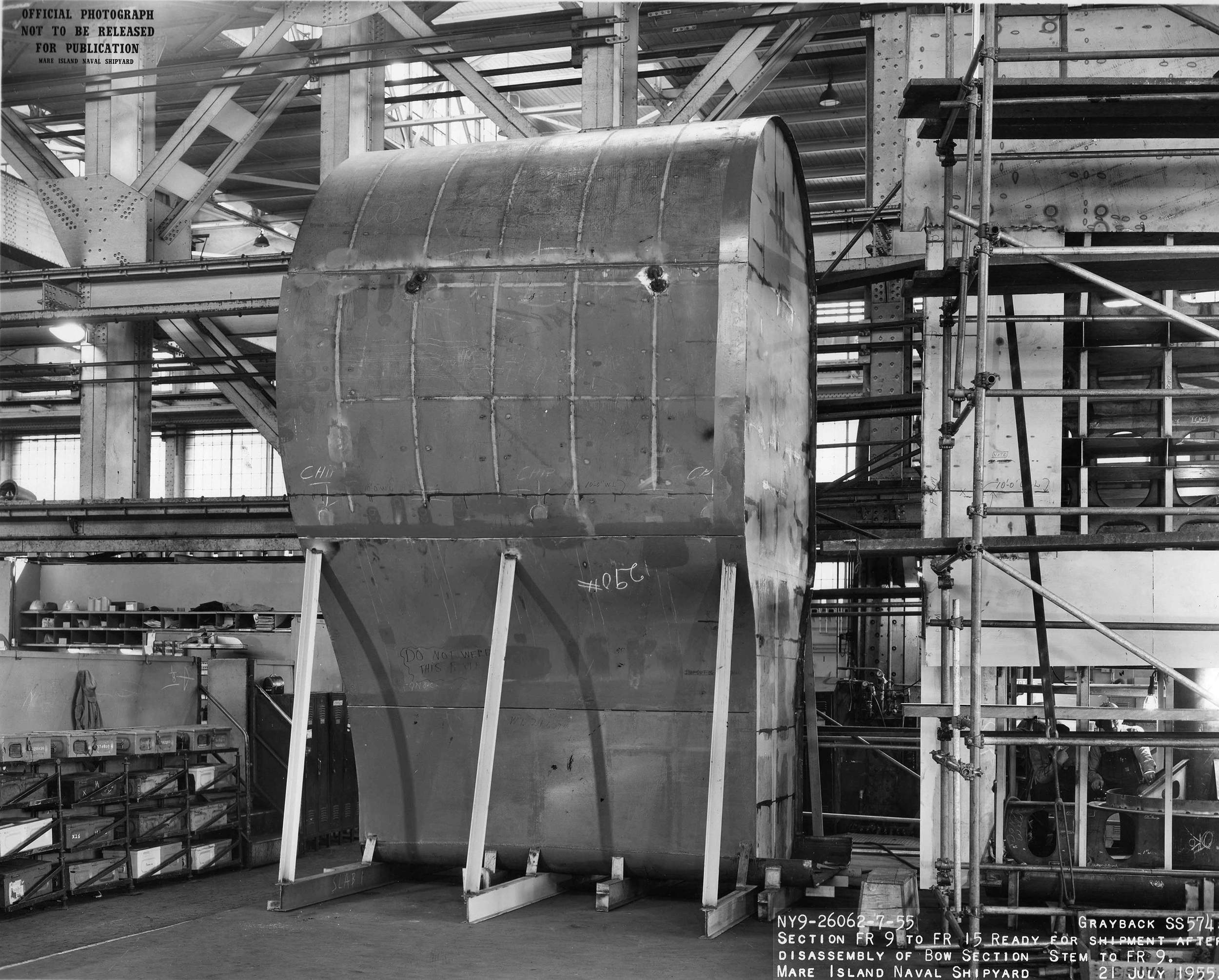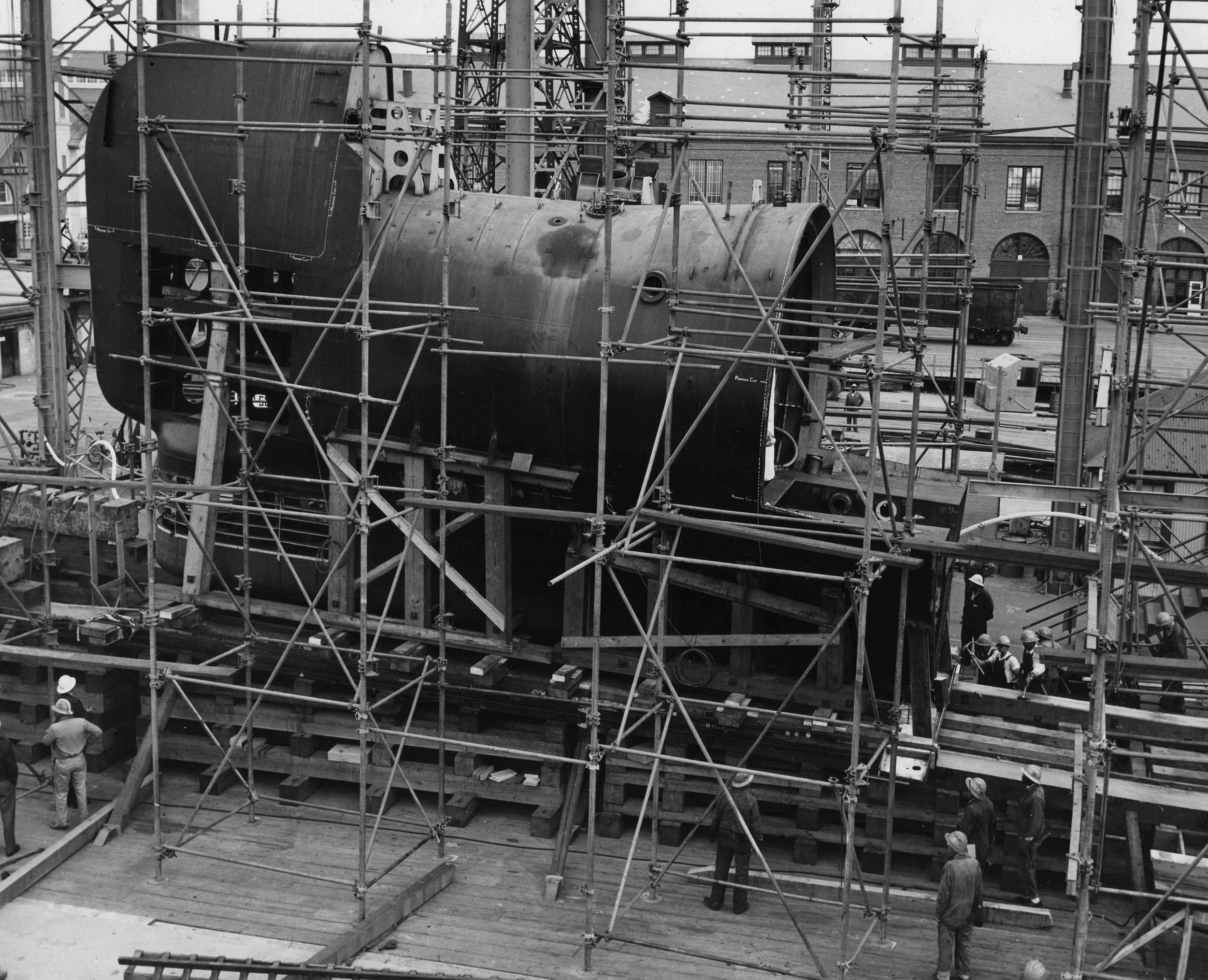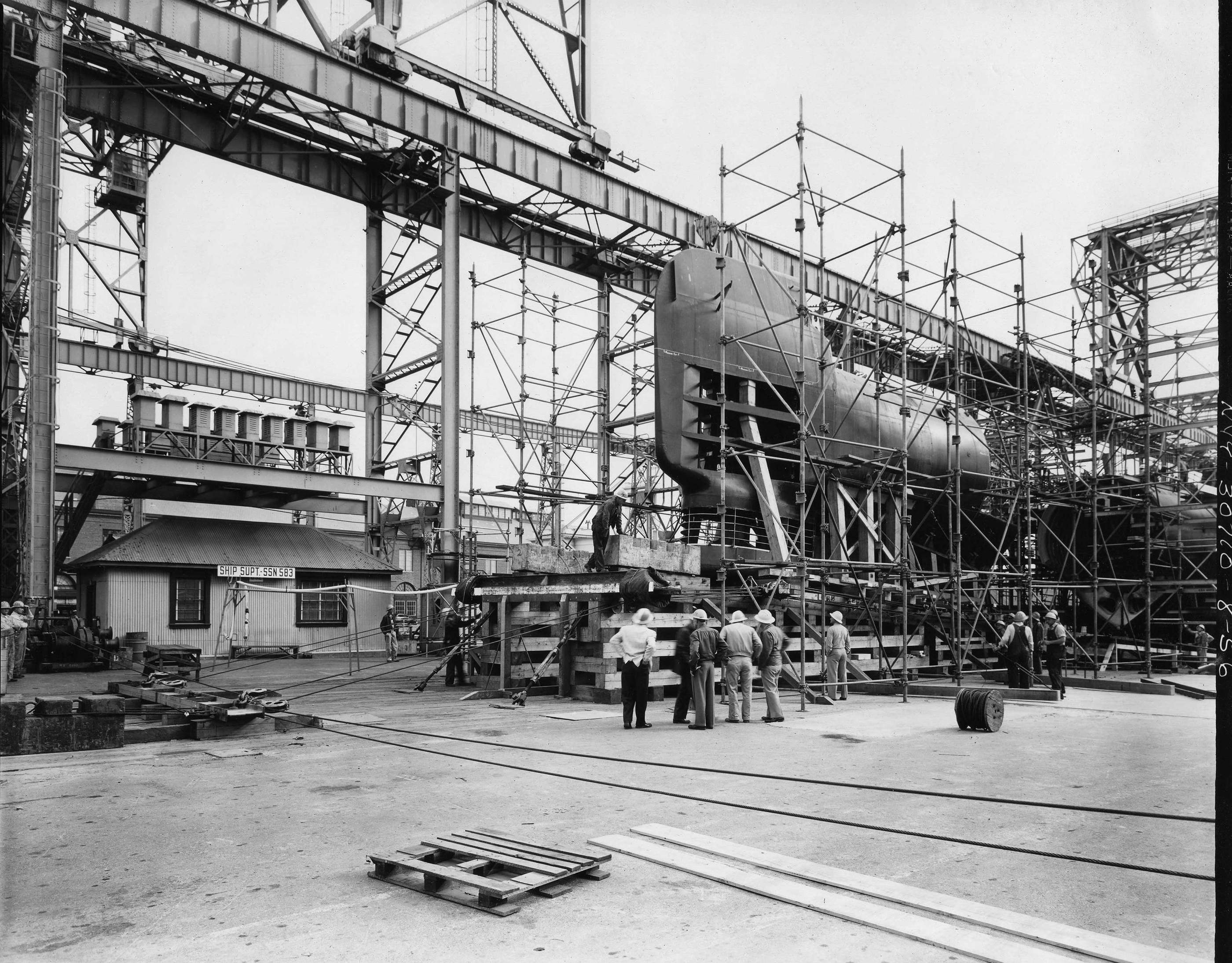 ![]() | 1.10k | Inner hull sections showing positioning rollers and interior bulkheads on 11 March 1954. | USN photo # 20451-5-54, courtesy of Darryl L. Baker. | |