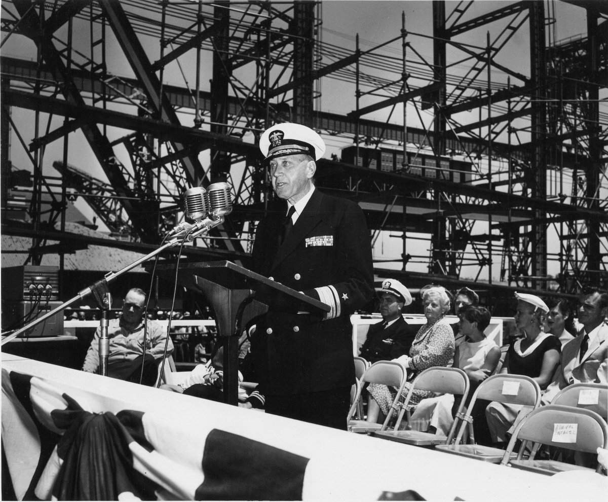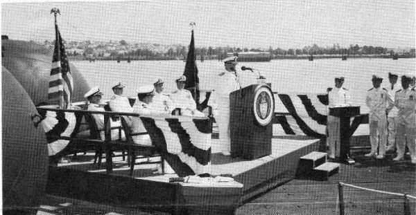 ![]() | 145k | RADM F. I. Entwistle, USN, Commander, Mare Island - Vallejo Area, U.S. Naval Base San Francisco delivers principle address at the keel laying ceremony for the Grayback (SSG-574) at Mare Island on 1 July 1954. Grayback was the last diesel powered submarine built at the yard. | USN photo # NY9 21864-7-54, courtesy of Darryl L. Baker. | |