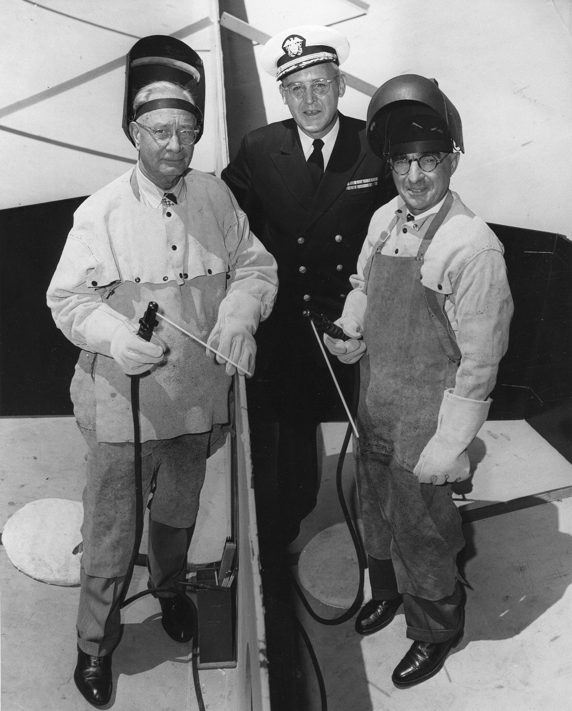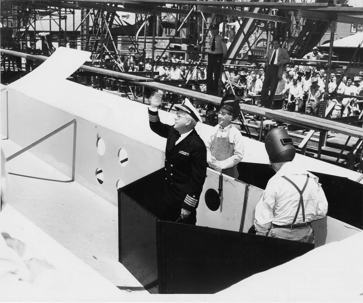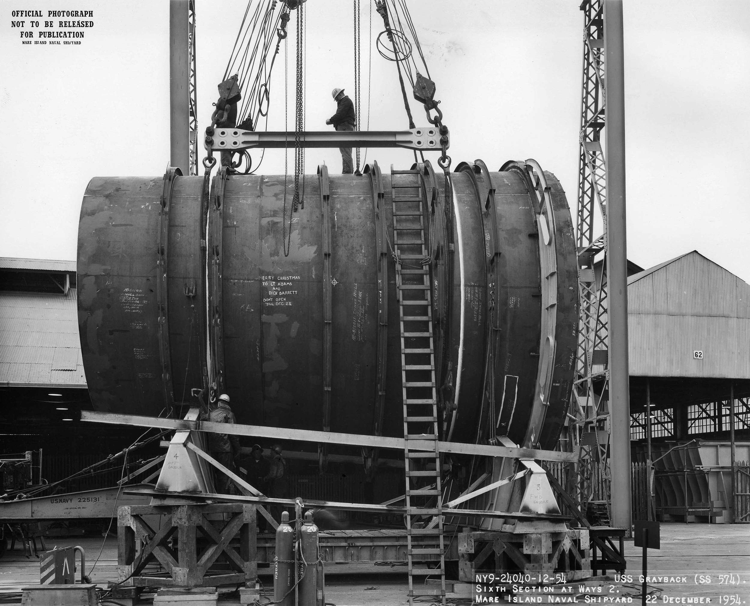 ![]() | 1.60k | Honorary keel layers of the Grayback (SSG-574) seen on the keel of the submarine at Mare Island on 1 July 1954. Left to right: Archie MacDonnel (Sheet metal Shop Master) Capt. Harlan M. Thorpe (Shipyard Production Officer) and E. E. Pozzi (Paint Shop Master). | USN photo # 218698-7-54 TH, courtesy of Vallejo Naval and Historical Museum via Darryl L. Baker. | |
