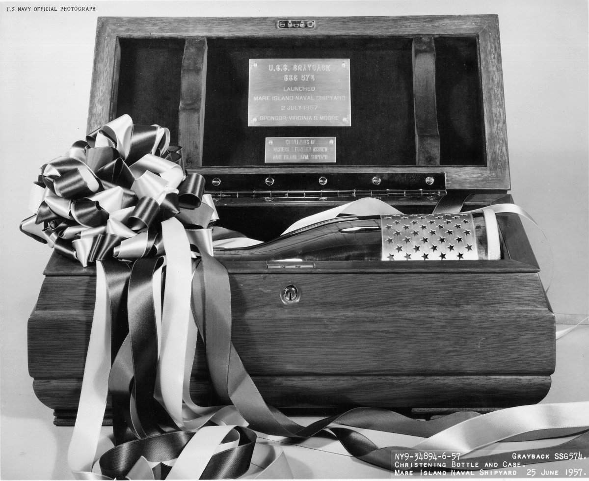 ![]() | 117k | Christening bottle (California Champagne) & case for the christening of Grayback (SSG-574) at Mare Island on 2 July 1957. | USN photo # NY9 34894-6-57, courtesy of Darryl L. Baker. | |