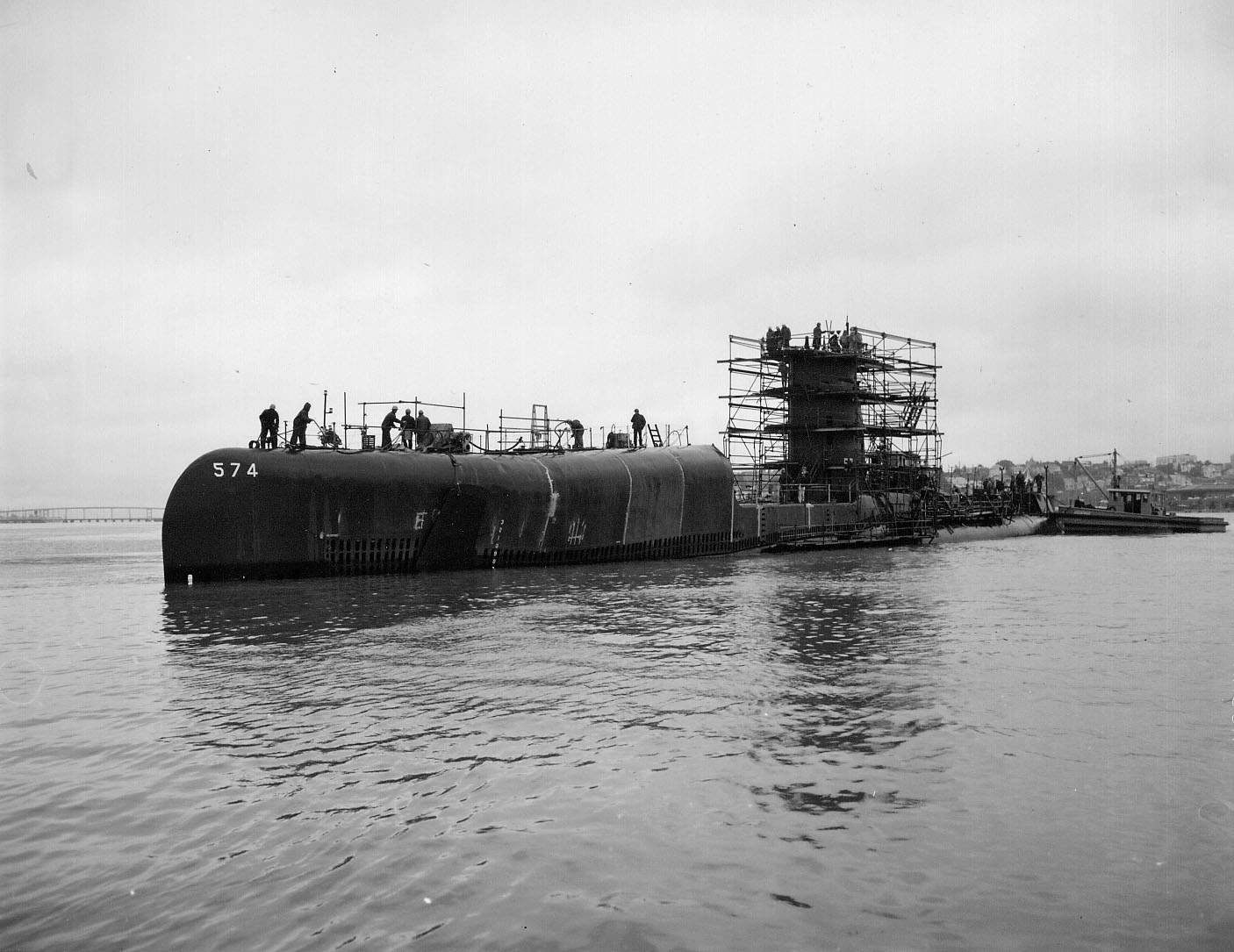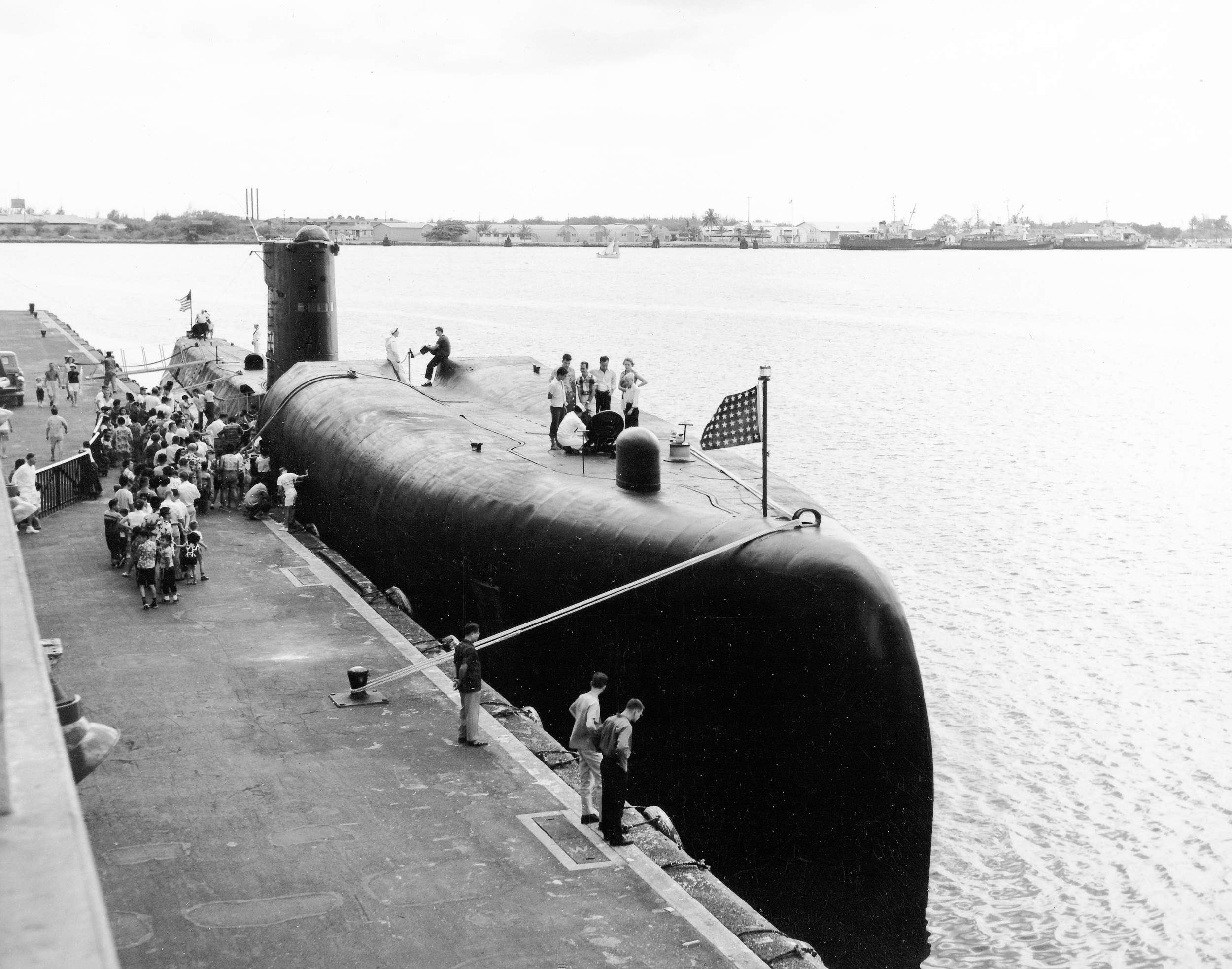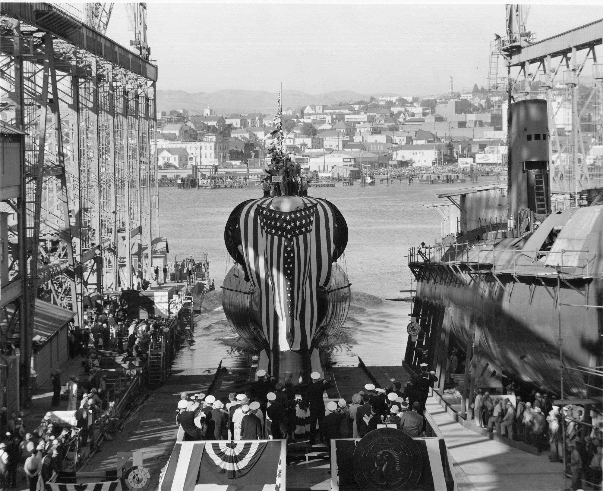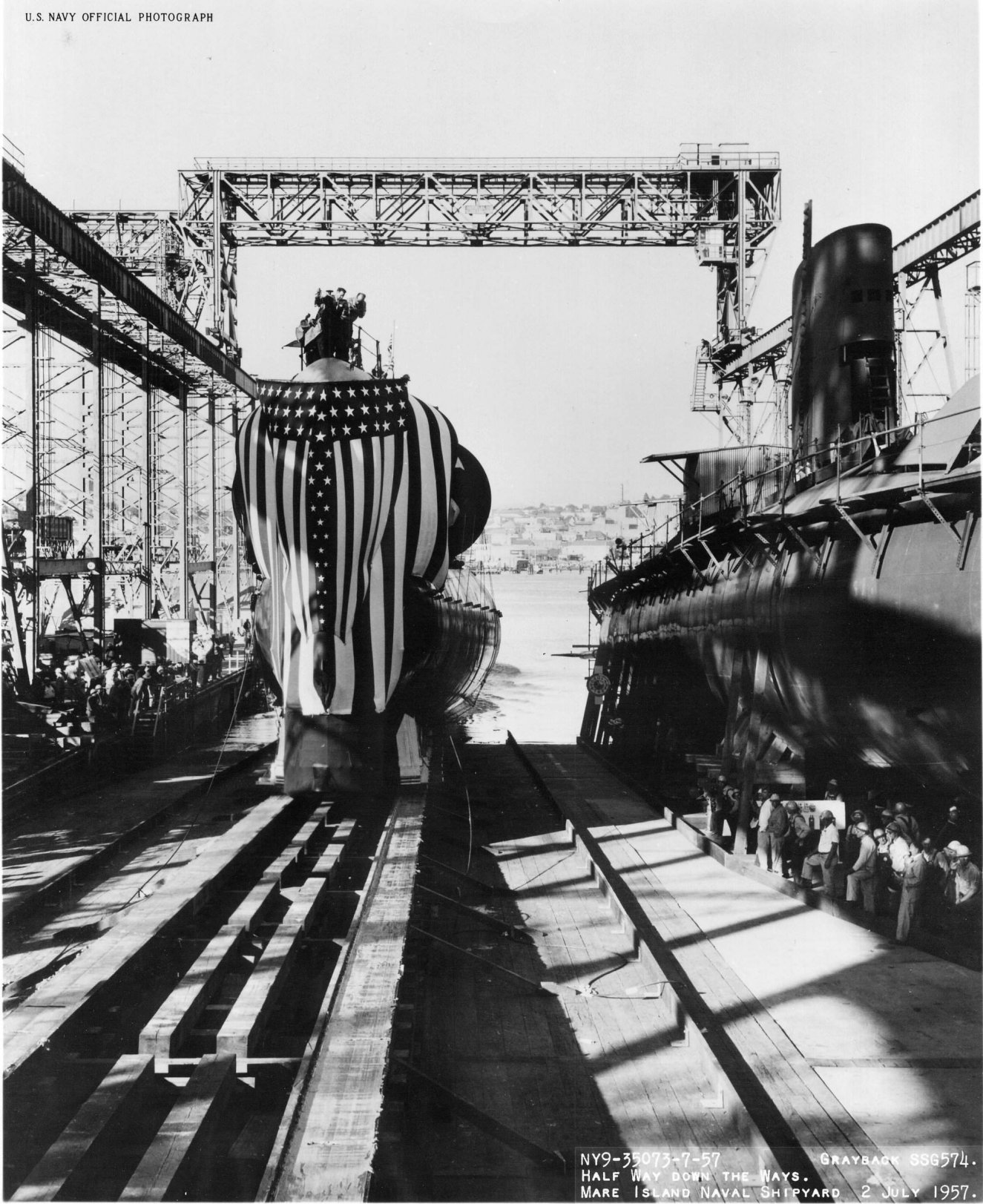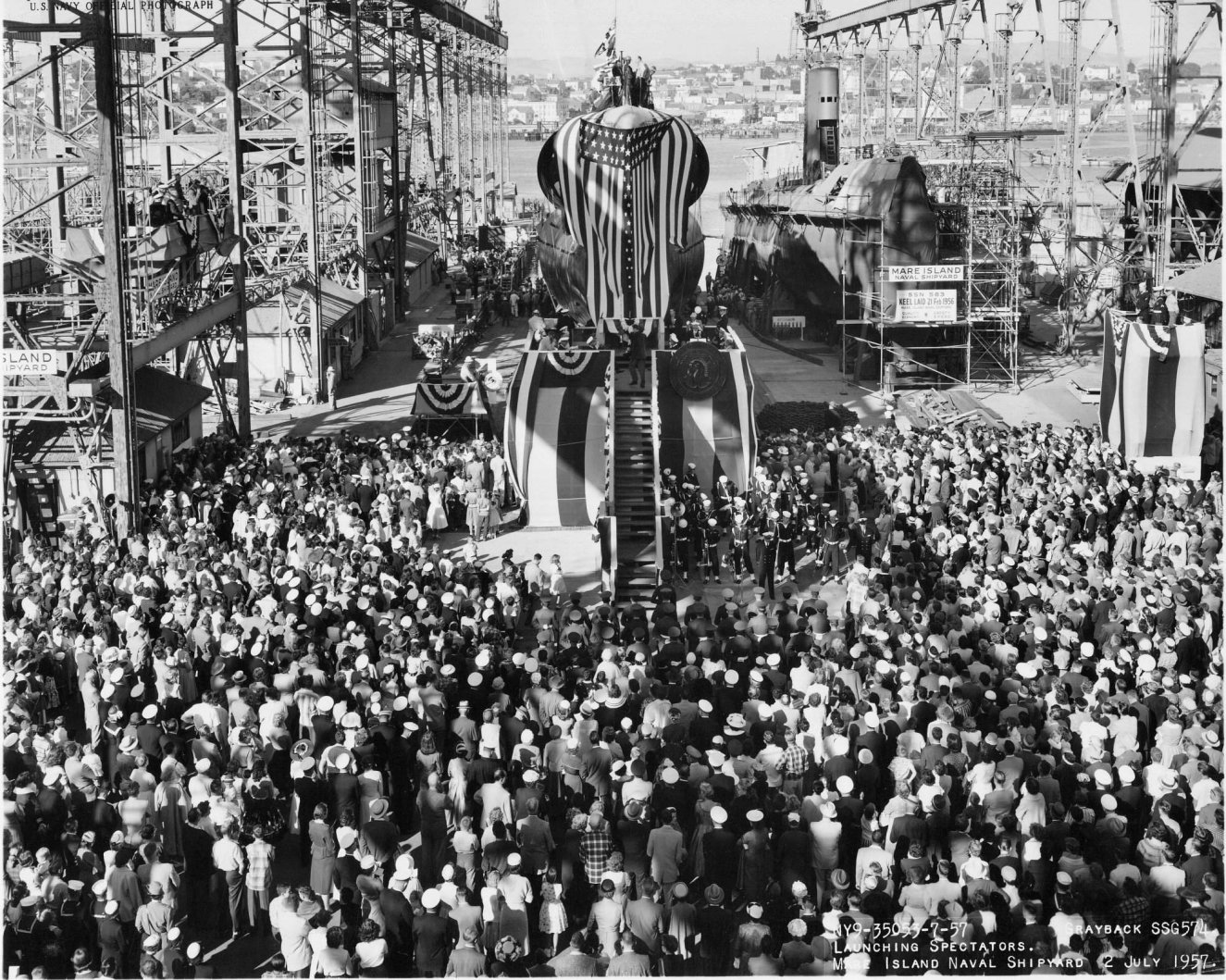 ![]() | 596k | The spectators gathered for the launching of the Grayback (SSG-574) at Mare Island Naval Shipyard on 2 July 1957. The yard's first nuclear submarine Sargo (SSN-583) is seen on the ways to the right. | U.S. Navy # NY9 35033-7-57, photo courtesy of Darryl L. Baker. | |