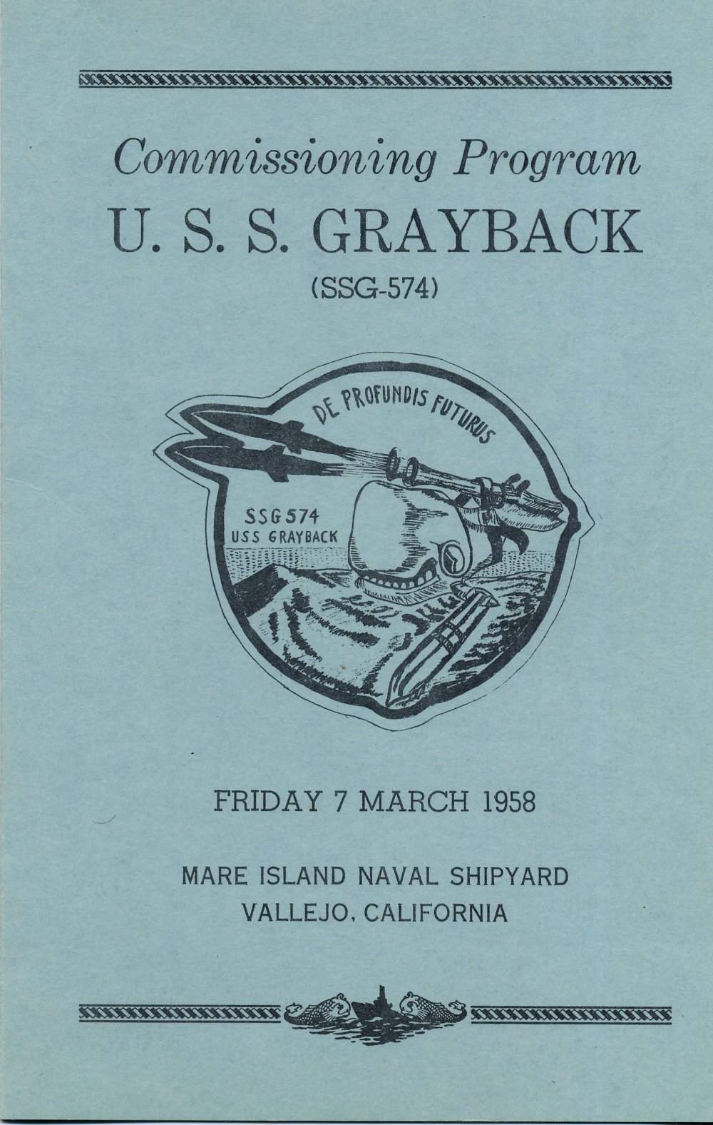 ![]() | 147k | The front cover of the Commissioning Program for Grayback (SSG-574) at Mare Island Naval Shipyard on Friday 1 March 1958. | USN photo courtesy of Darryl L. Baker. | |