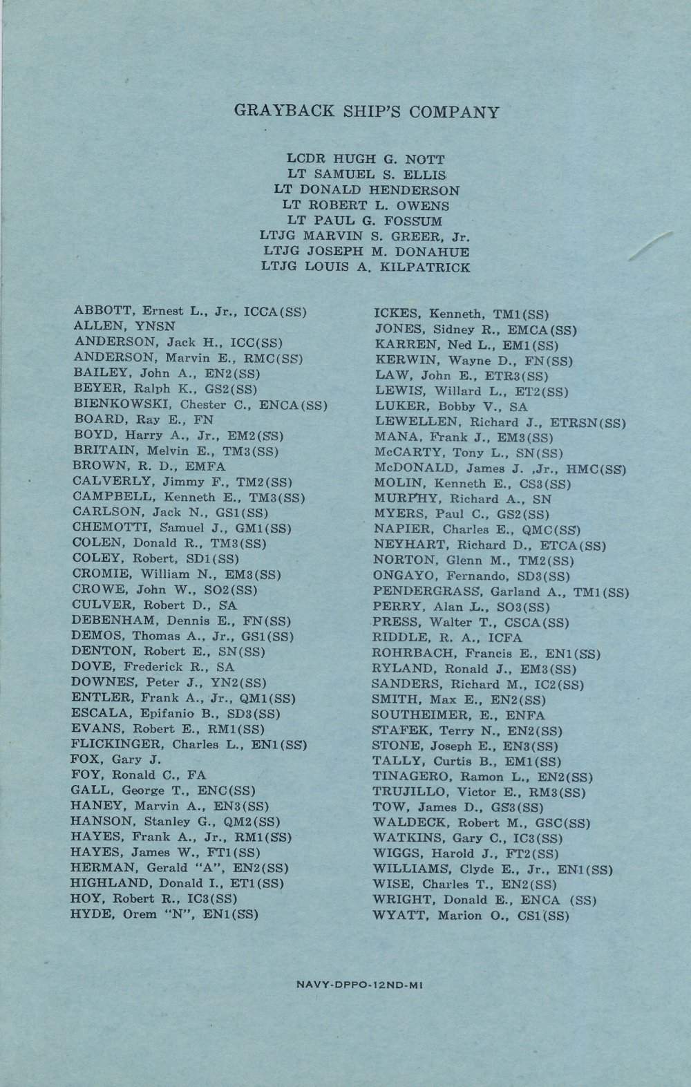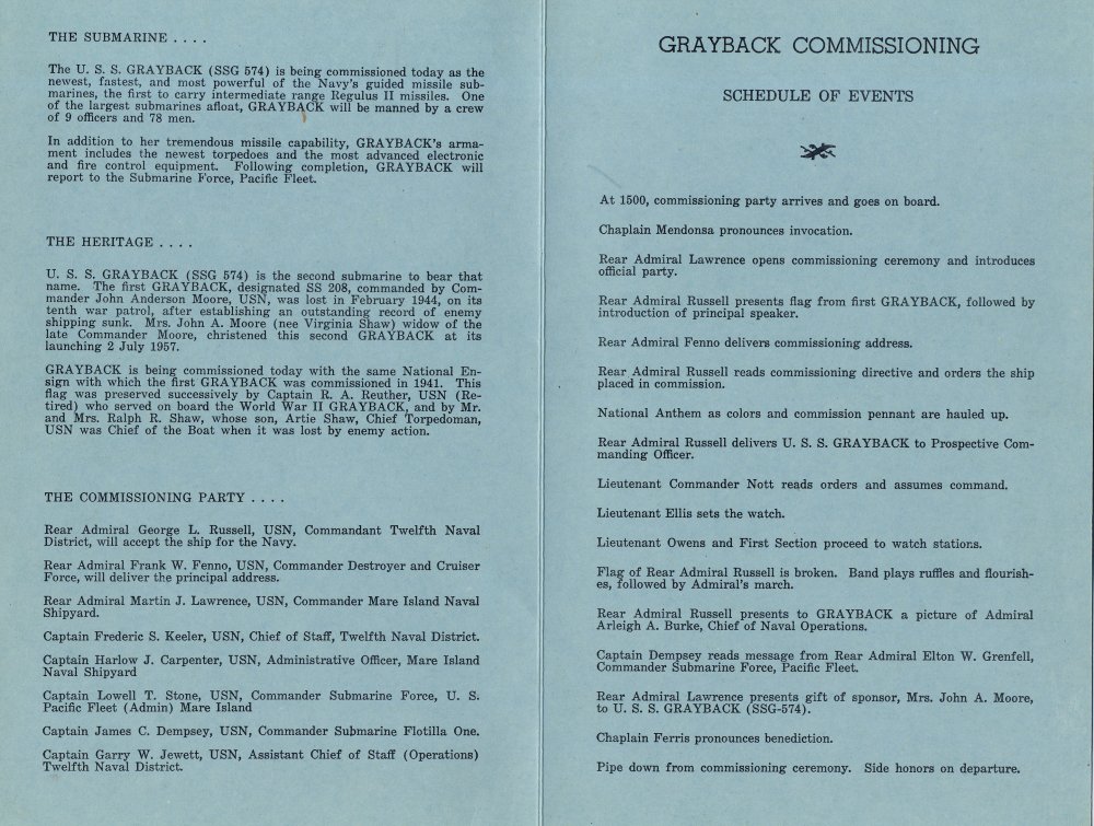 ![]() | 180k | Back cover of the Commissioning Program for Grayback (SSG-574) at Mare Island Naval Shipyard on Friday 1 March 1958 which list the ship's company at the time of commissioning. | USN photo courtesy of Darryl L. Baker. | |