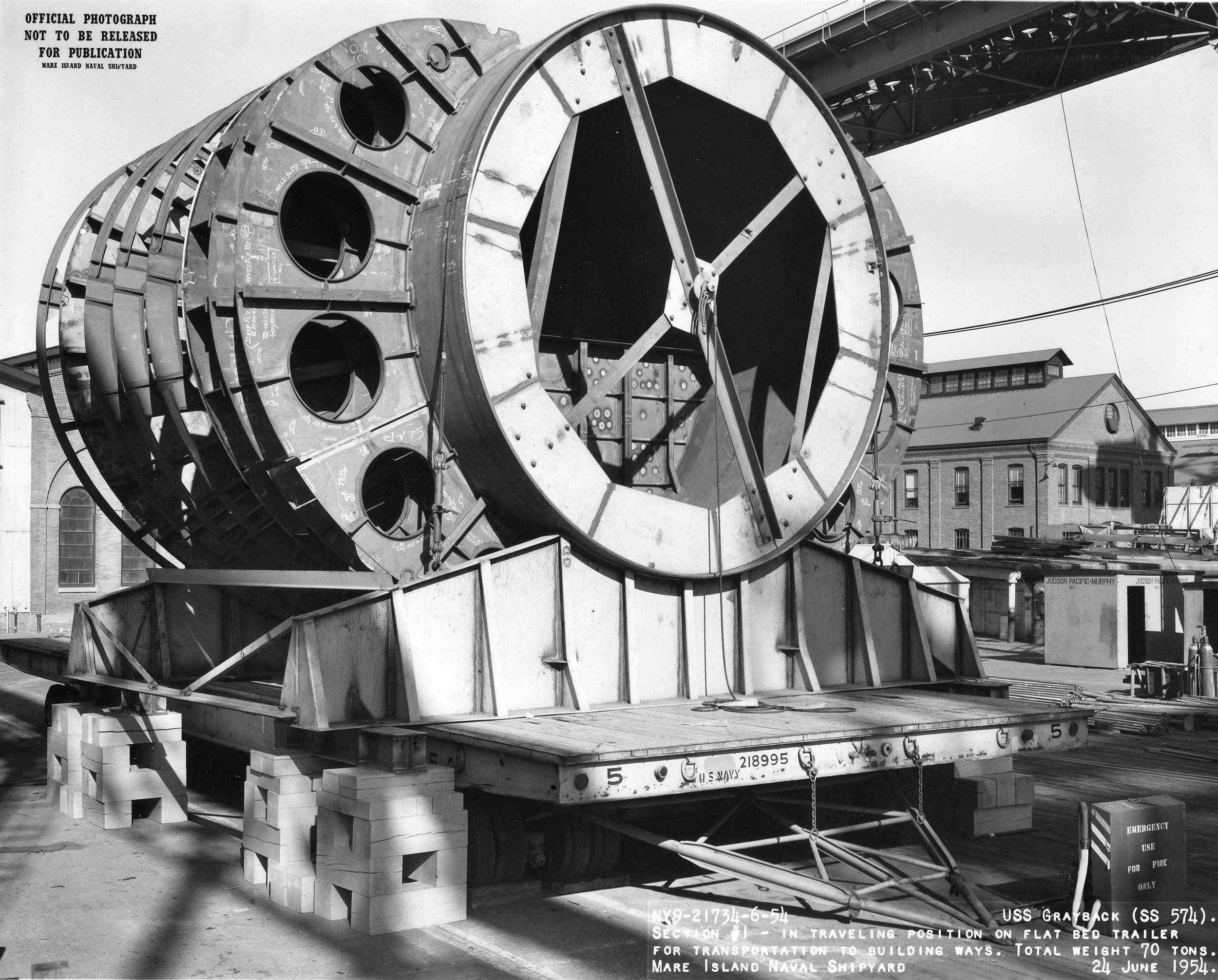![]() | 976k | Section #1 – in traveling position on flat bed trailer for transportation to building ways. Total weight 70 tons. | USN photo # 21734-6-54, courtesy of Darryl L. Baker. | |