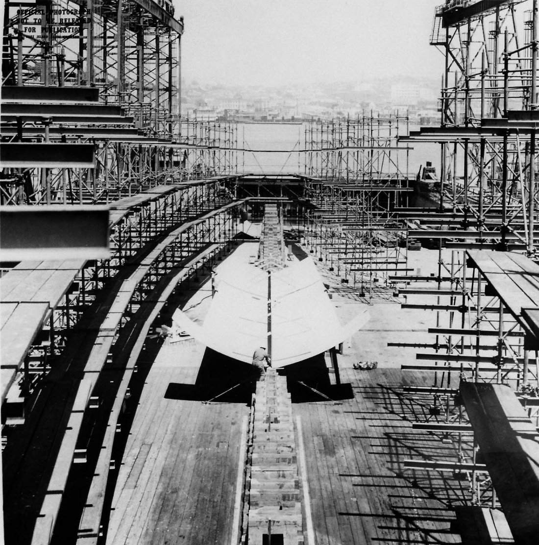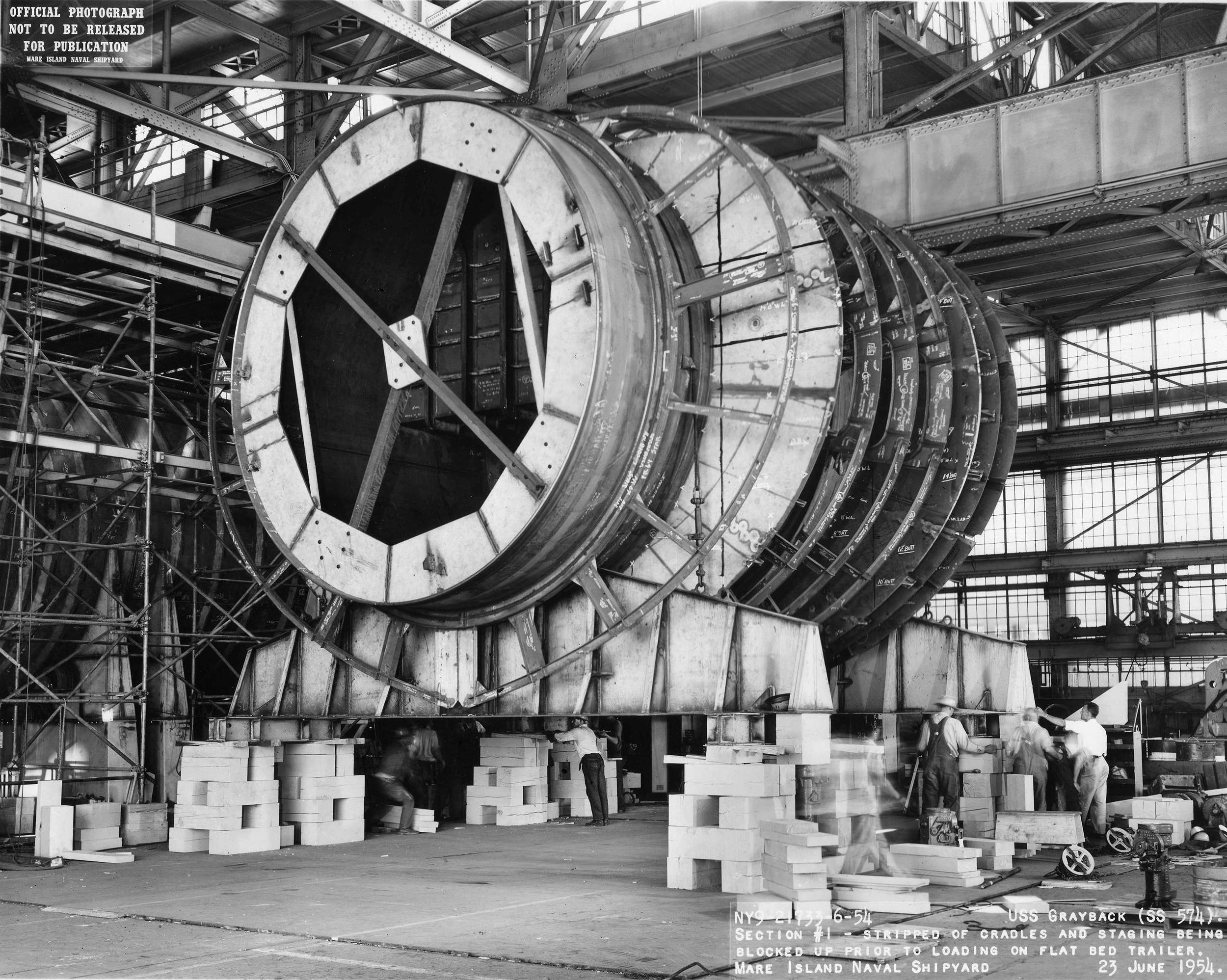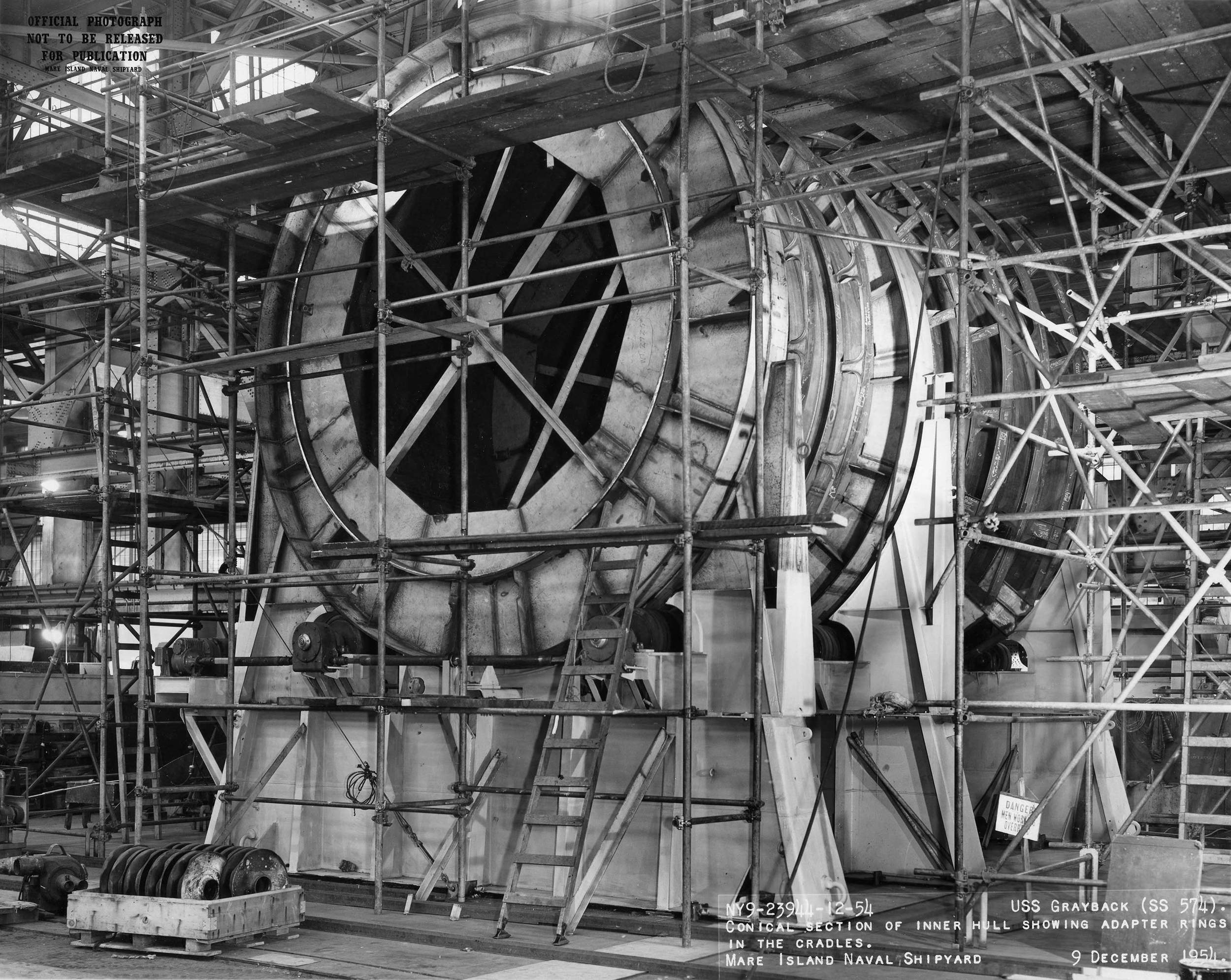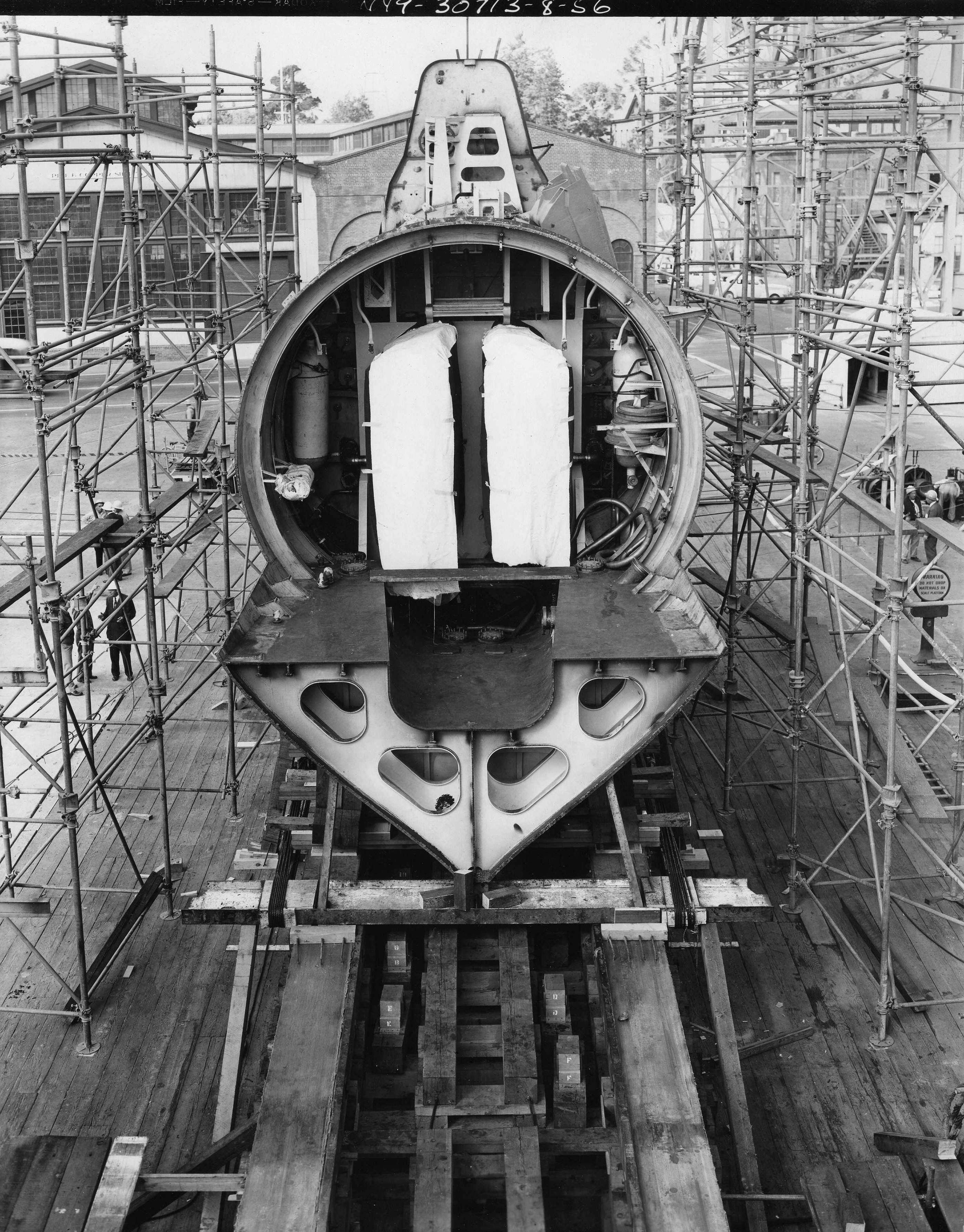 ![]() | 1.20k | Conical section of inner hull showing adapter rings in the cradles, 9 December 1954. | USN photo # 23944-12-54, courtesy of Darryl L. Baker. | |