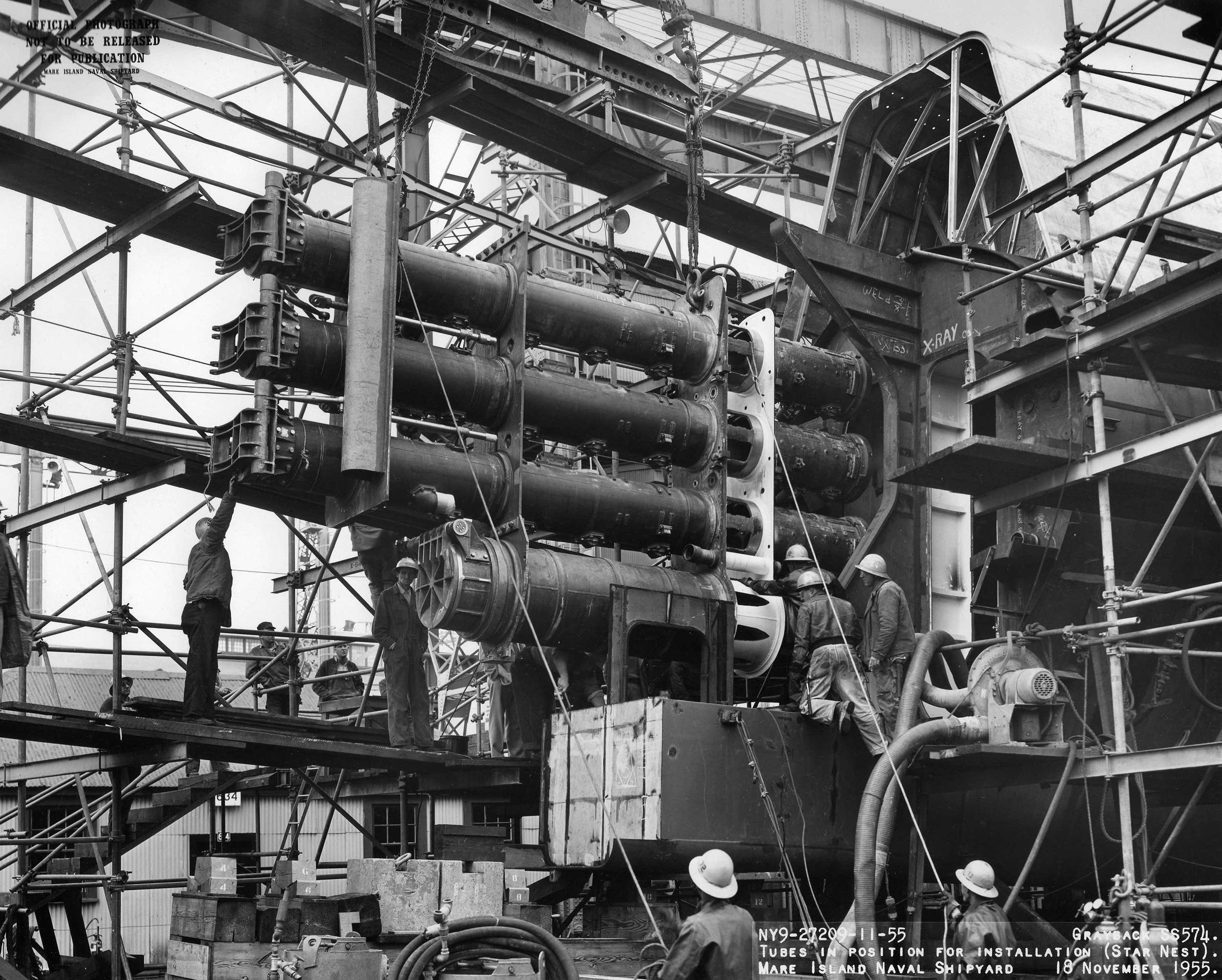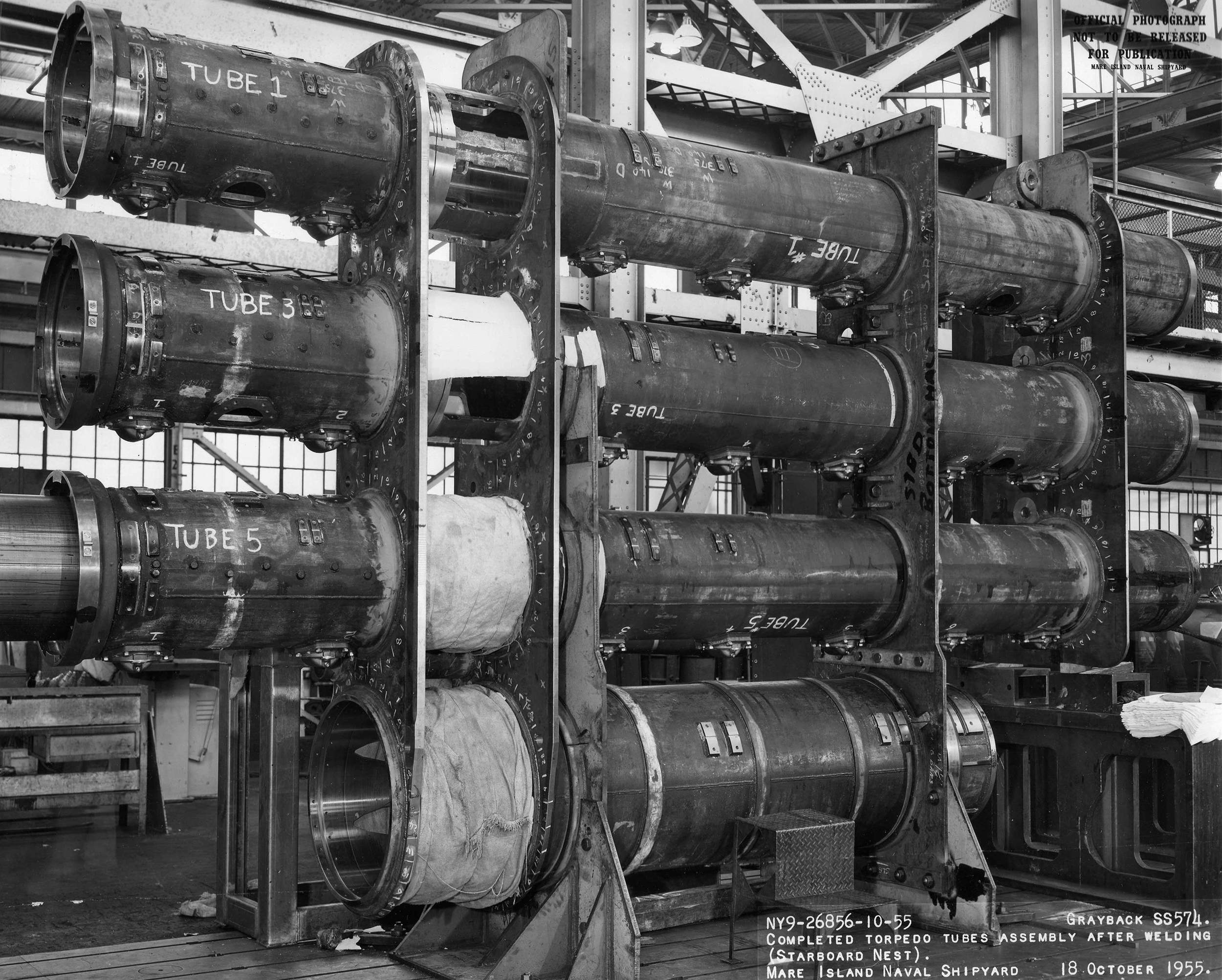 ![]() | 1.10k | Torpedo tube tubes assembly after welding (Starboard Nest)on 18 October 1955. | USN photo # 26856-10-55, courtesy of Darryl L. Baker. | |