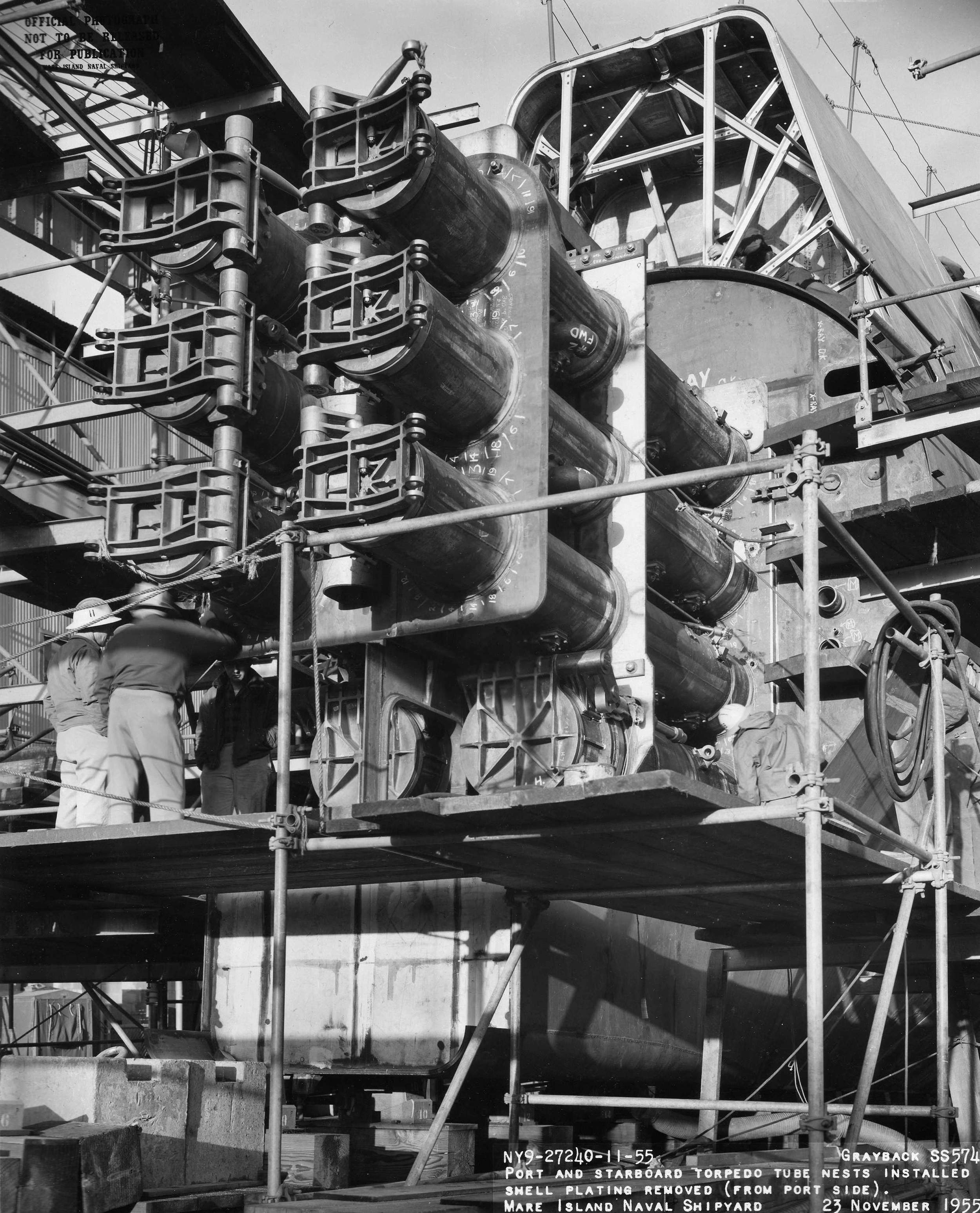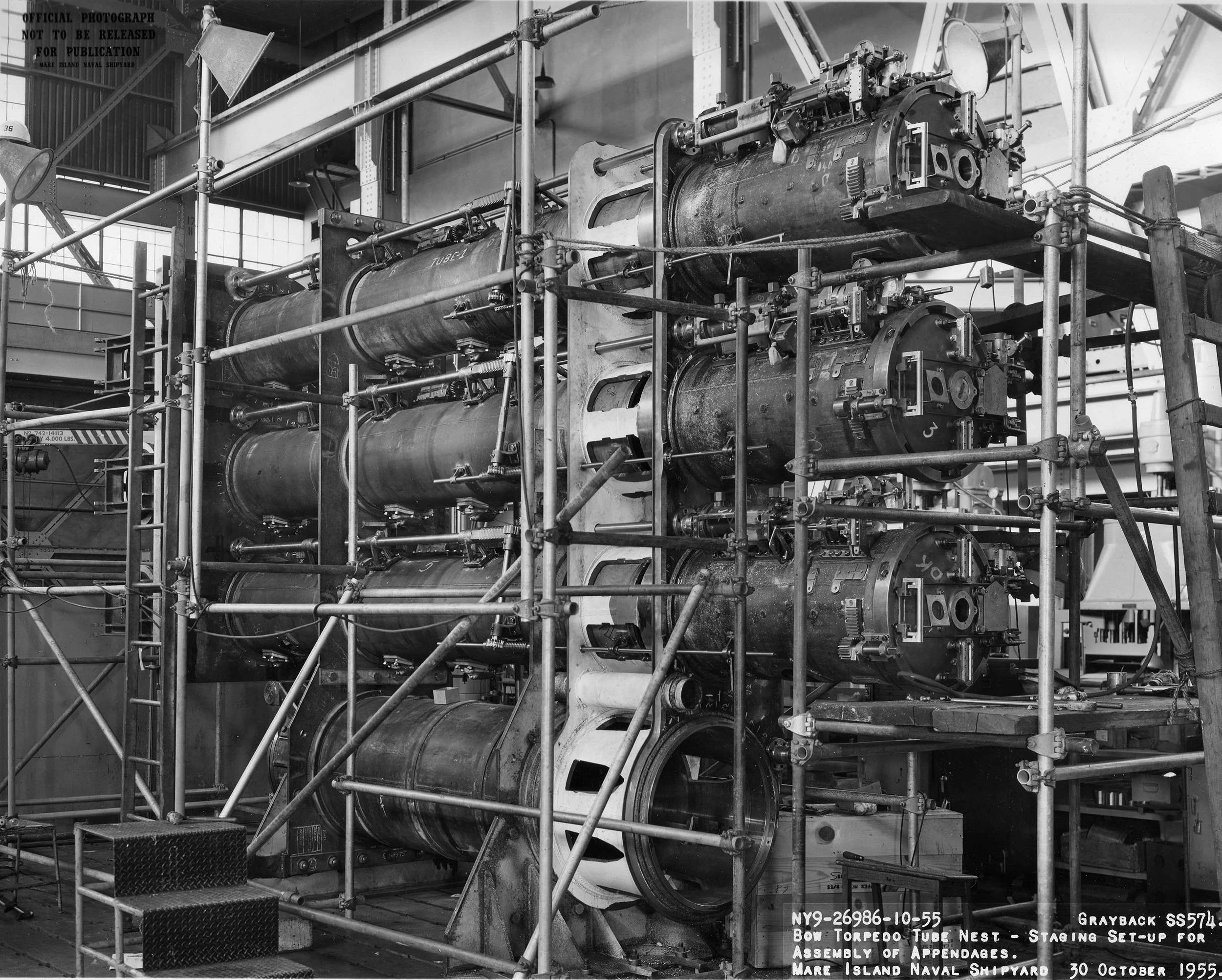 ![]() | 1.10k | Bow torpedo tube tubes (starboard nest) – staging set-up for assembly of appendages on 30 October 1955. | USN photo # 26986-10-55, courtesy of Darryl L. Baker. | |