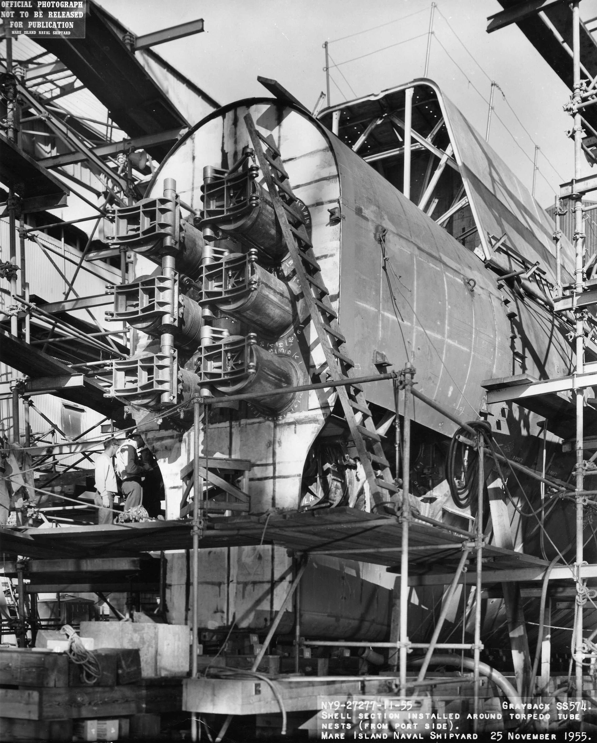 ![]() | 927k | Shell section installed around torpedo tubes nests (photo from port side) on 25 November 1955. | USN photo # 27277-11-55, courtesy of Darryl L. Baker. | |